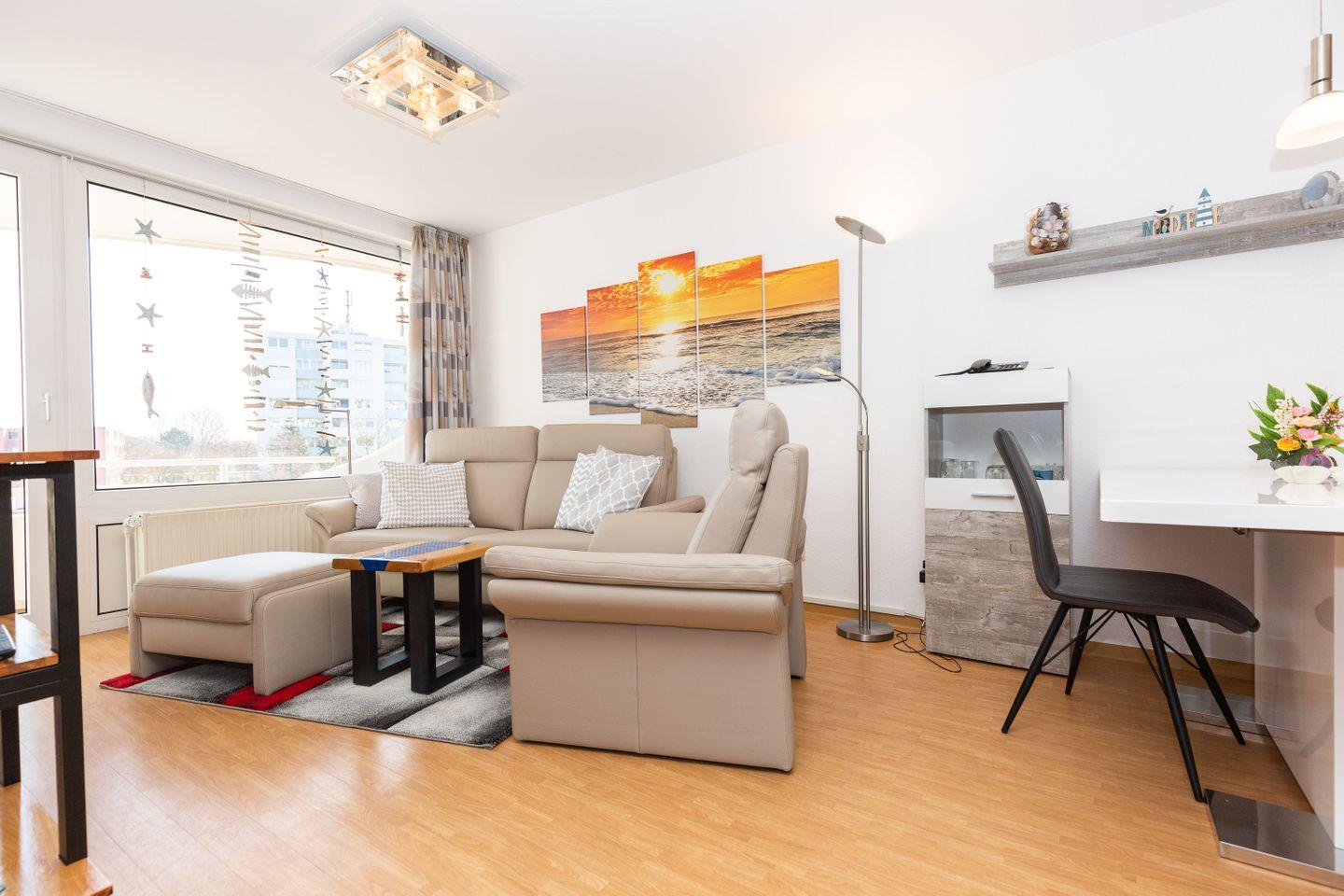 Haus "Lord Nelson", Typ 2, App.-Nr. "217", bis 3 Personen, 2. Etage, ca. 40 qm Wohnungsgröße, Ostseite (ohne Meerblick/Richtung Elbe), Balkon, Wohnbereich mit in den Schrank integrierten Boxspringbett (mit zwei Einzelmatratzen) , separates kleines Kinderzimmer mit Einzelbett, Dusche/WC, Küchenzeile mit Mikrowelle, Kabel-TV, kostenl. WLAN-Zugang im App., Tiefgaragenstellplatz, Strandkorb im Sommer 2026, Nichtraucherappartement