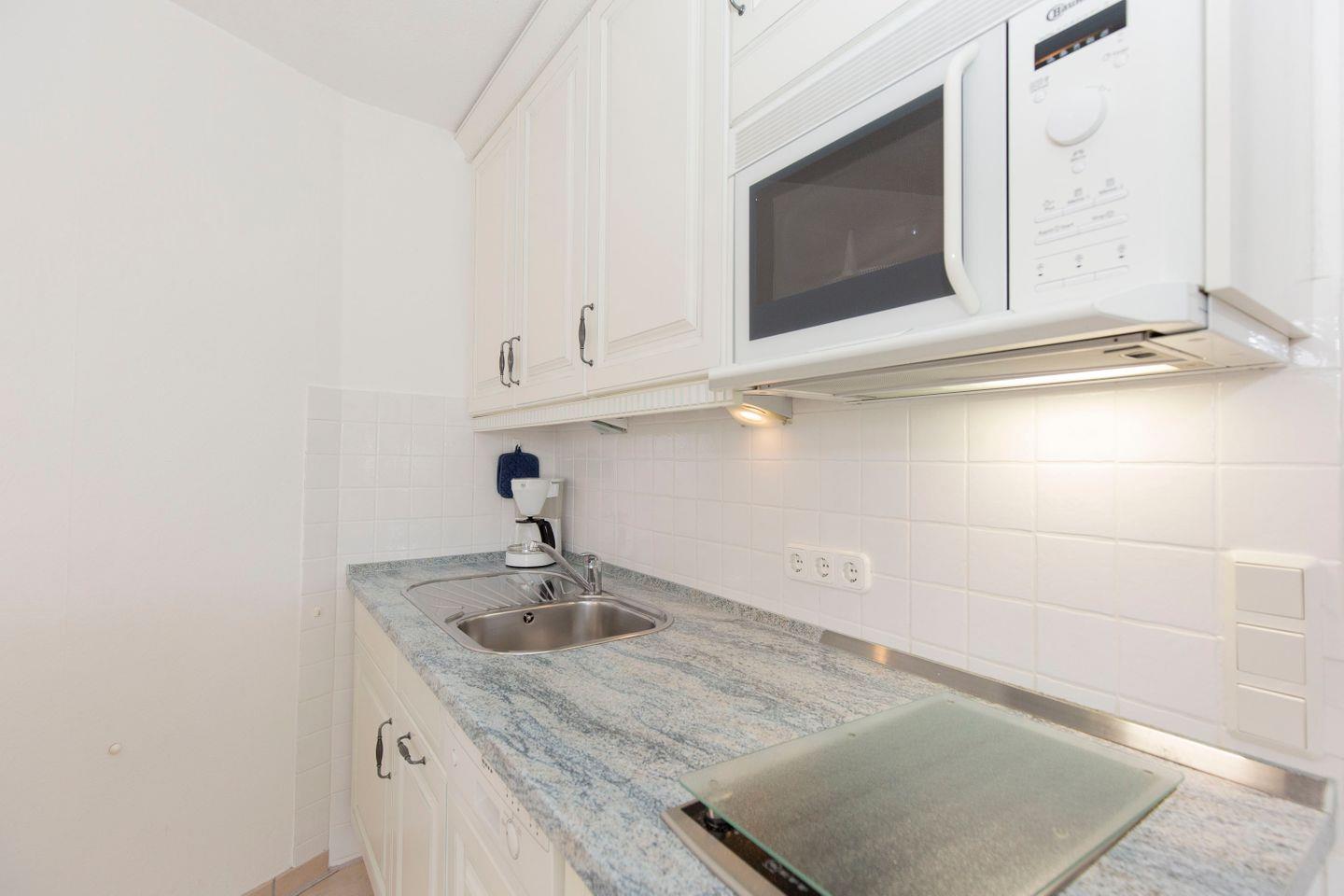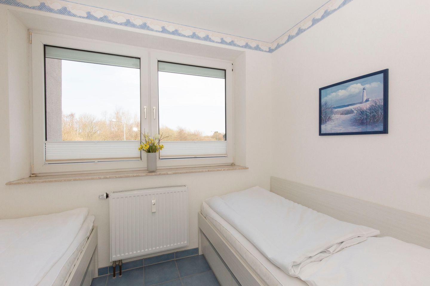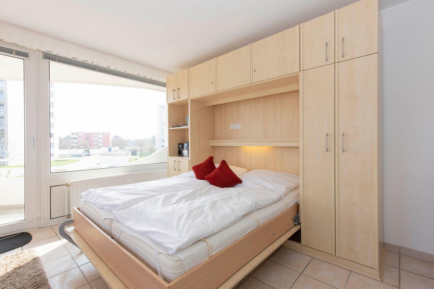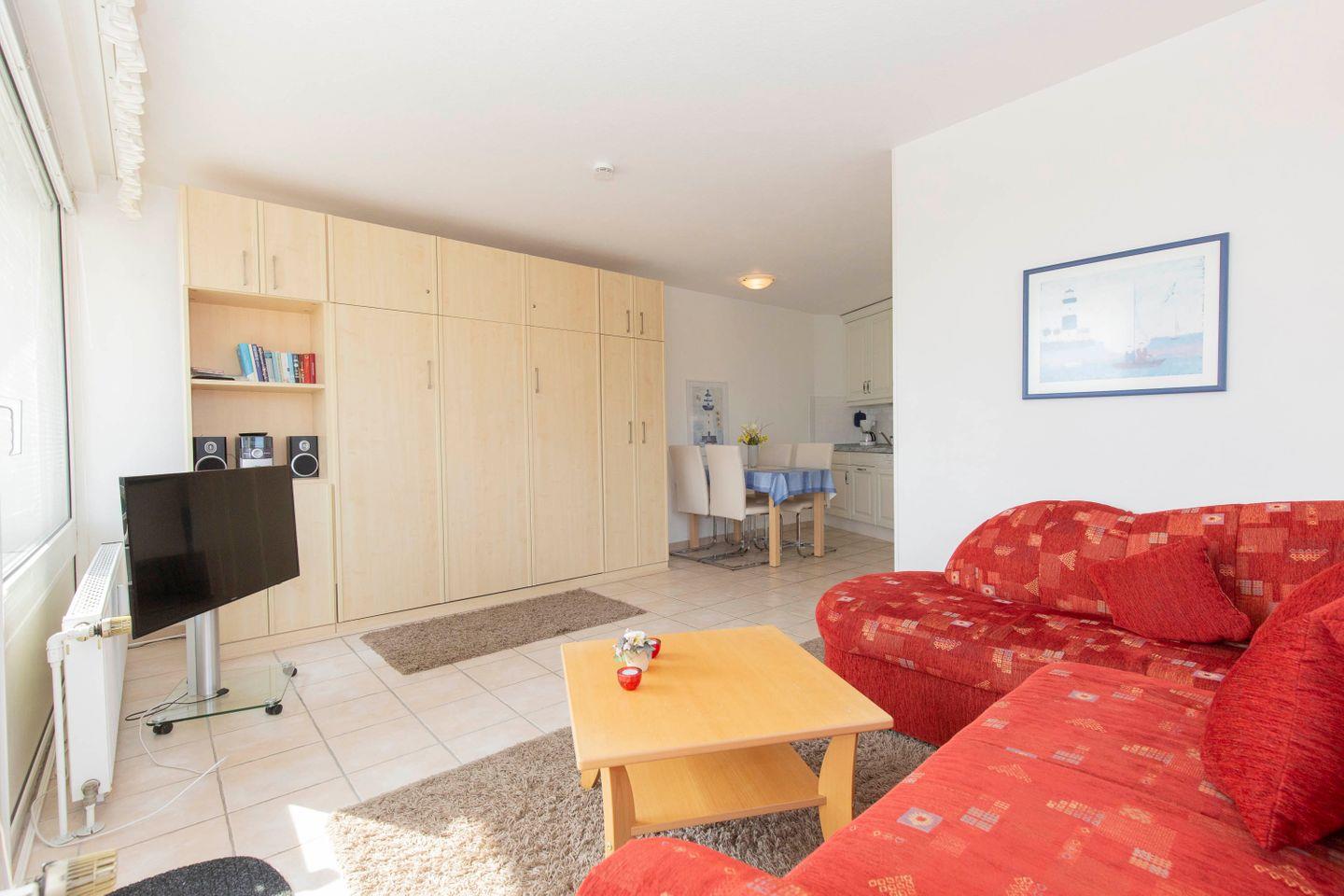 Haus "Lord Nelson", Typ 1, App.-Nr. "120", bis 4 Personen, 1. Etage, ca. 43 qm, Blick Richtung Weltschifffahrtsweg (ohne Meerblick/Richtung Elbe), Wohnbereich mit Schrankbett, separates Schlafzimmer mit zwei Einzelbetten, Dusche/WC, Küchenzeile mit Geschirrspüler, 2-Platten-Ceranfeld und Mikrowelle, Balkon, Telefon, Kabel-TV (Flat-Screen),kostenl. W-Lan Zugang im App., Tiefgaragenstellplatz, Haustiere sind nicht erlaubt, Nichtraucherwohnung, Strandkorb im Sommer 2026.