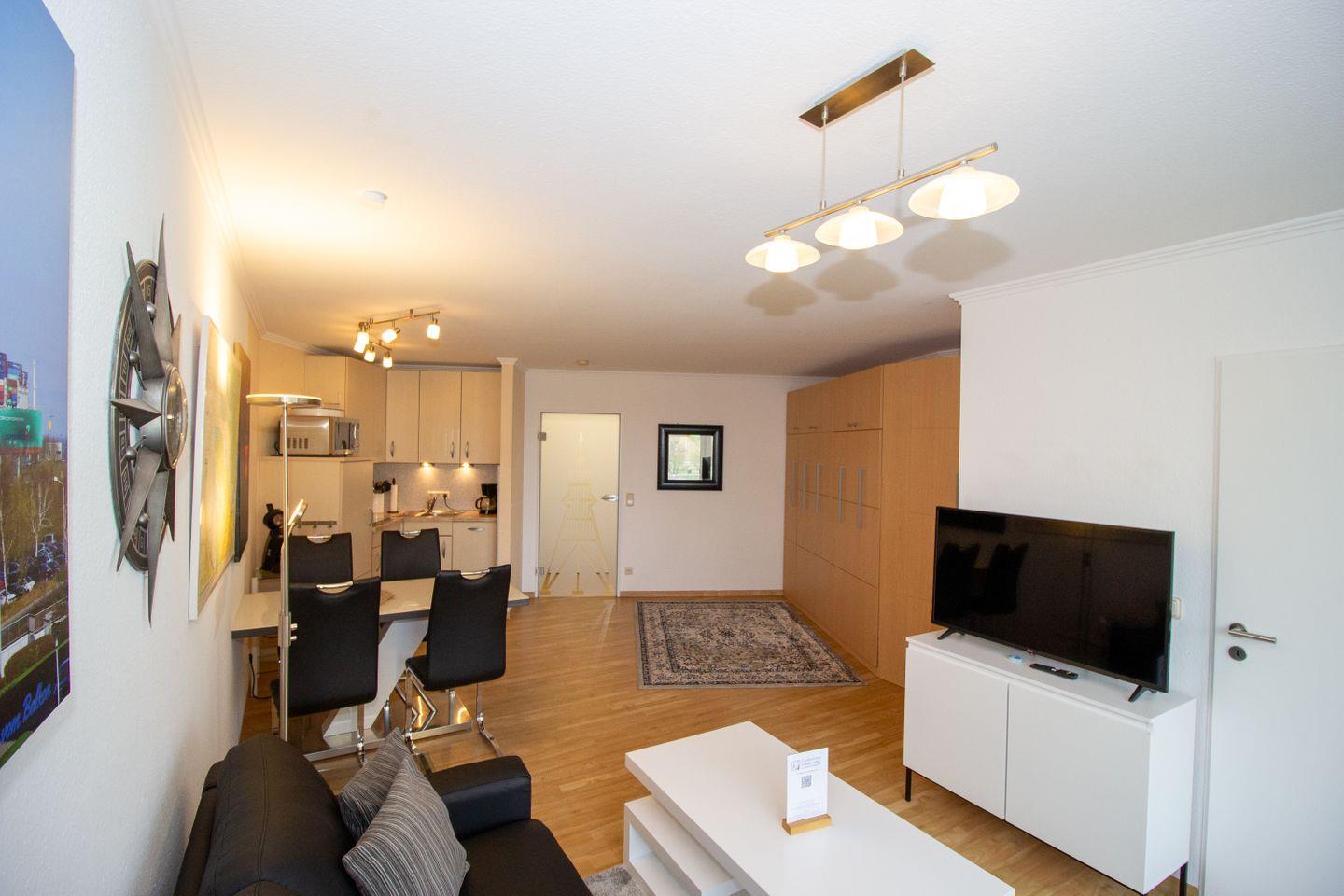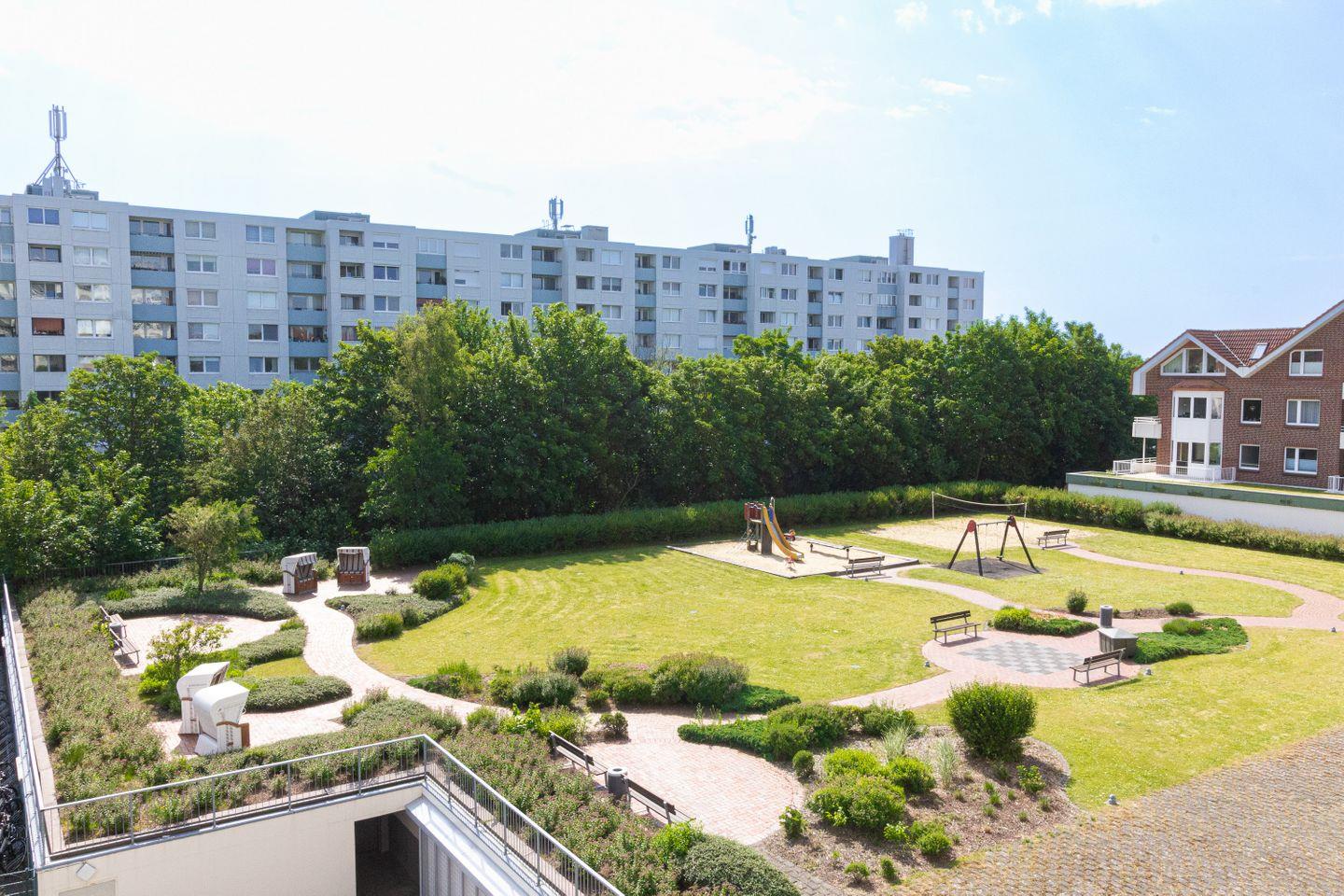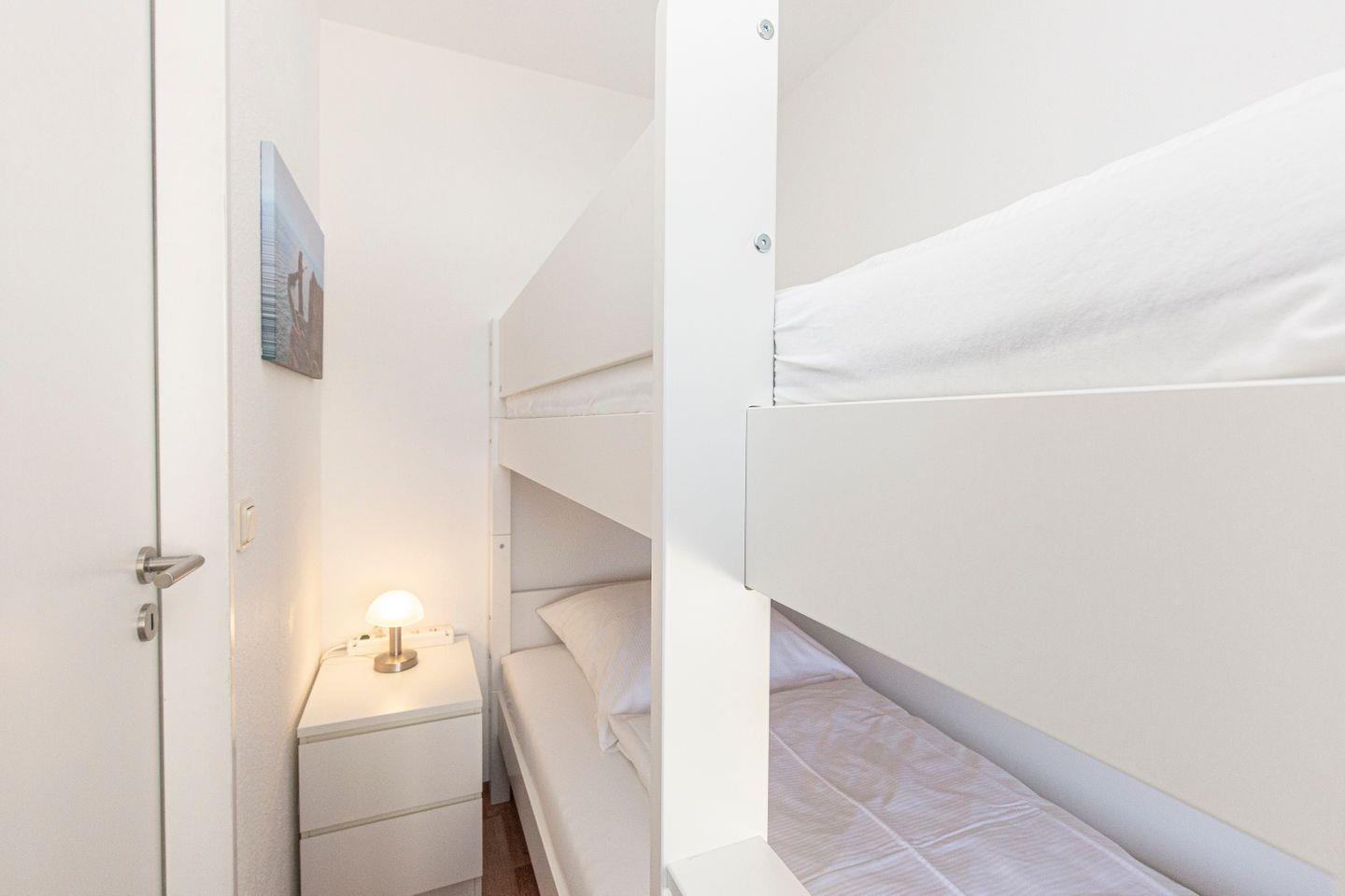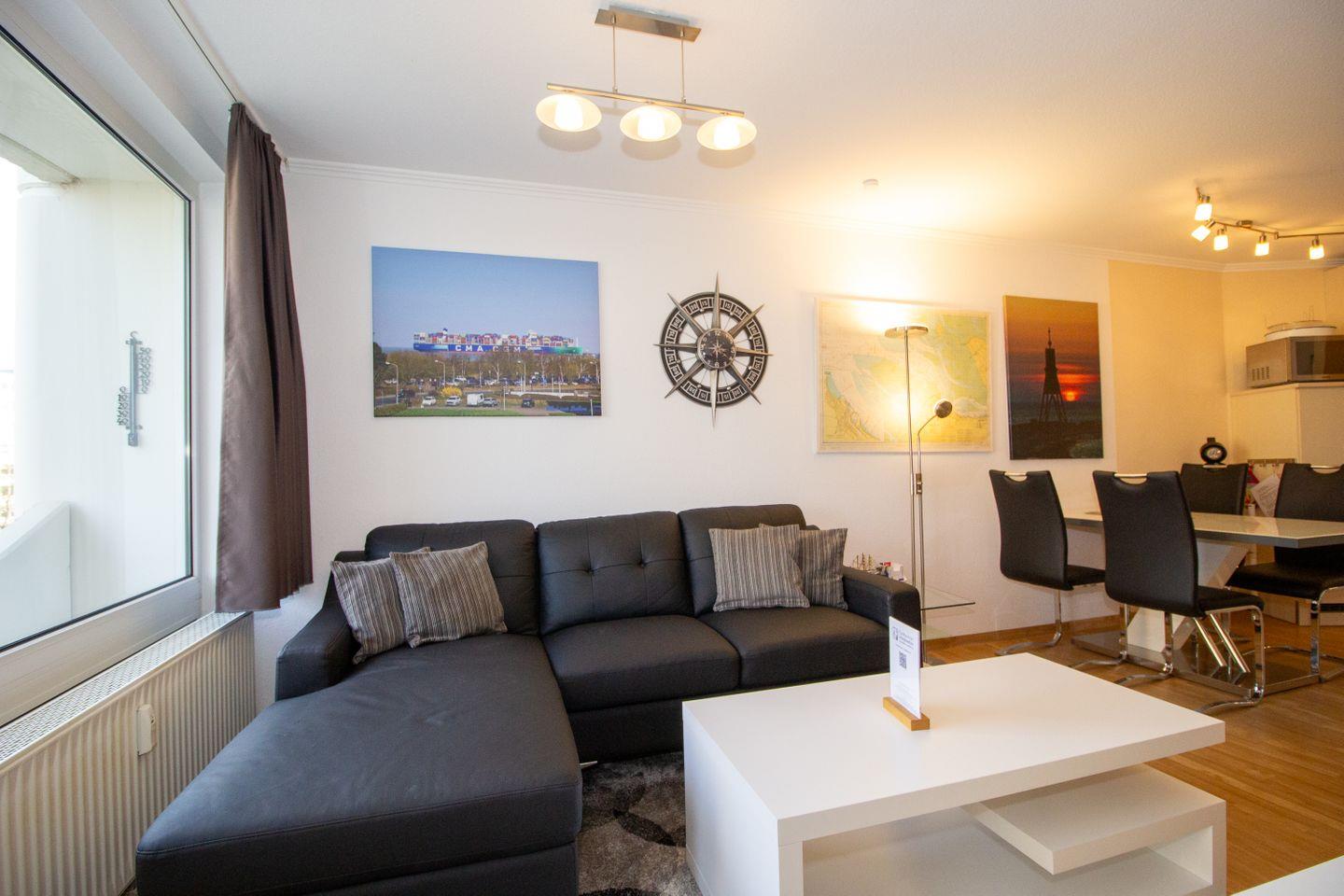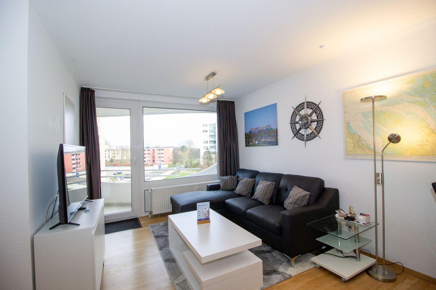 Haus "Lord Nelson", Typ 2, App. Nr. 317, bis 4 Pers., ca. 40 qm, Ostseite, eingeschränkter seitlicher Meerblick Richtung Elbe/Weltschifffahrtsweg, Wohnbereich mit Schrankbett, sep. Schlafzimmer mit Etagenbett, Dusche/WC, Küchenzeile mit Geschirrspüler, großes Ceranfeld und Mikrowelle, Balkon, Kabel-TV, Wlan über eigenen Router, Tiefgaragenstellplatz, Nichtraucherapp., Haustiere erlaubt, Strandkorb im Sommer 2026.