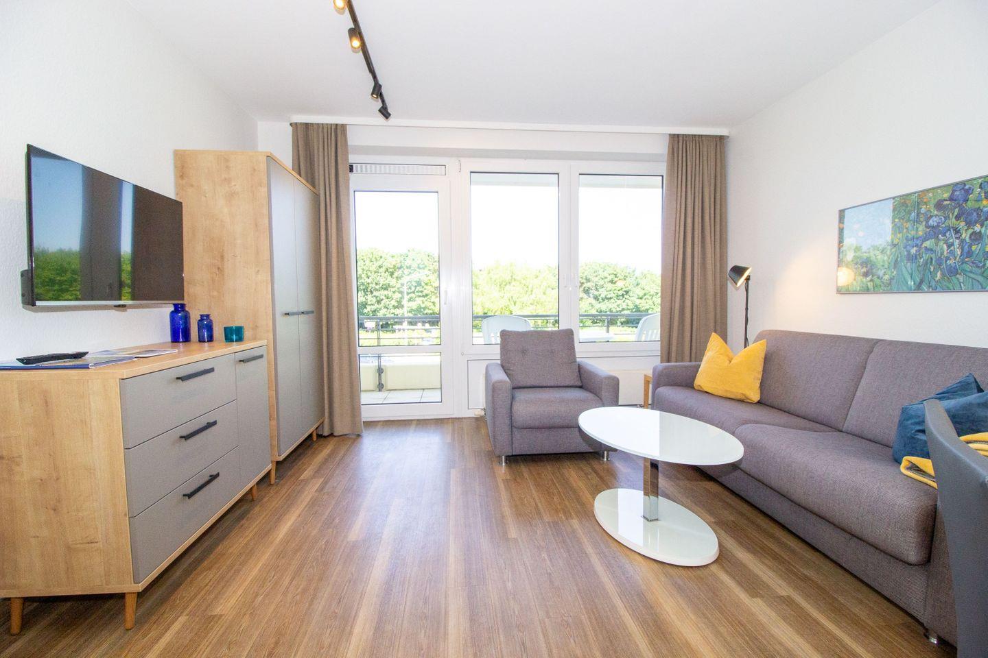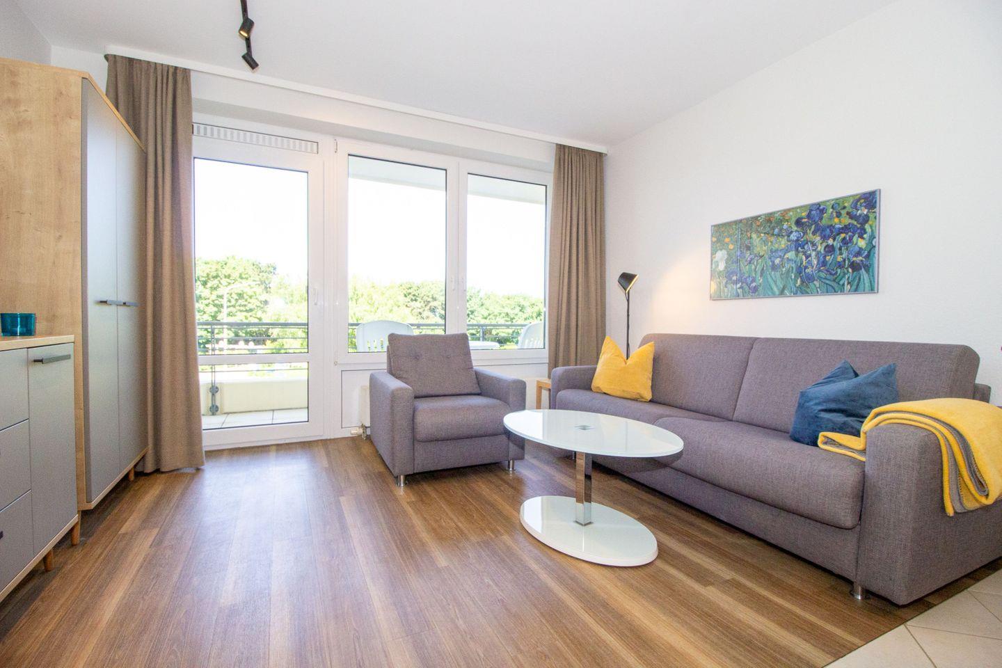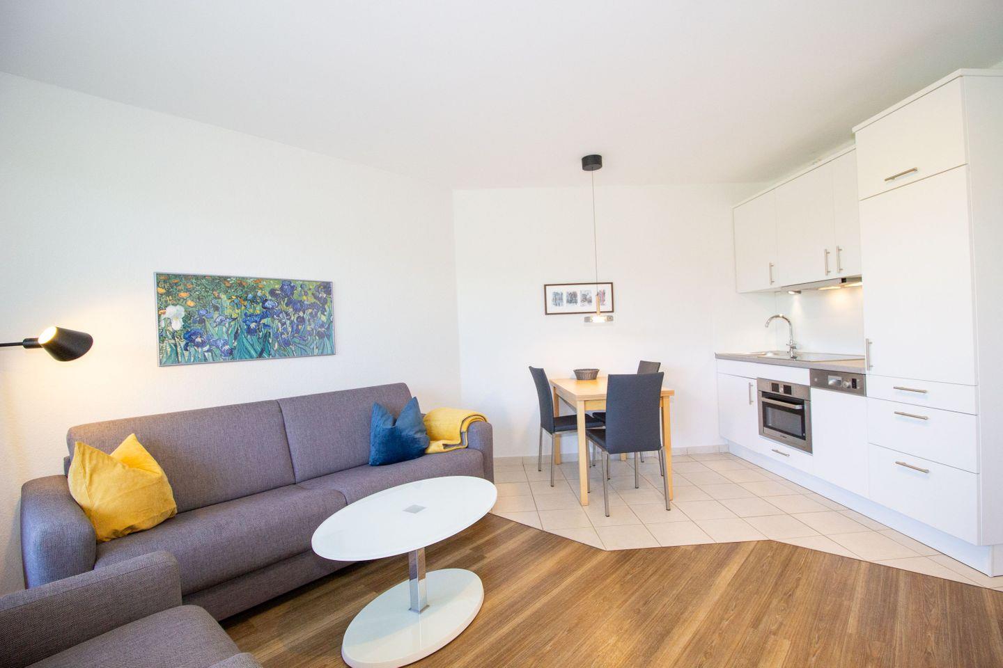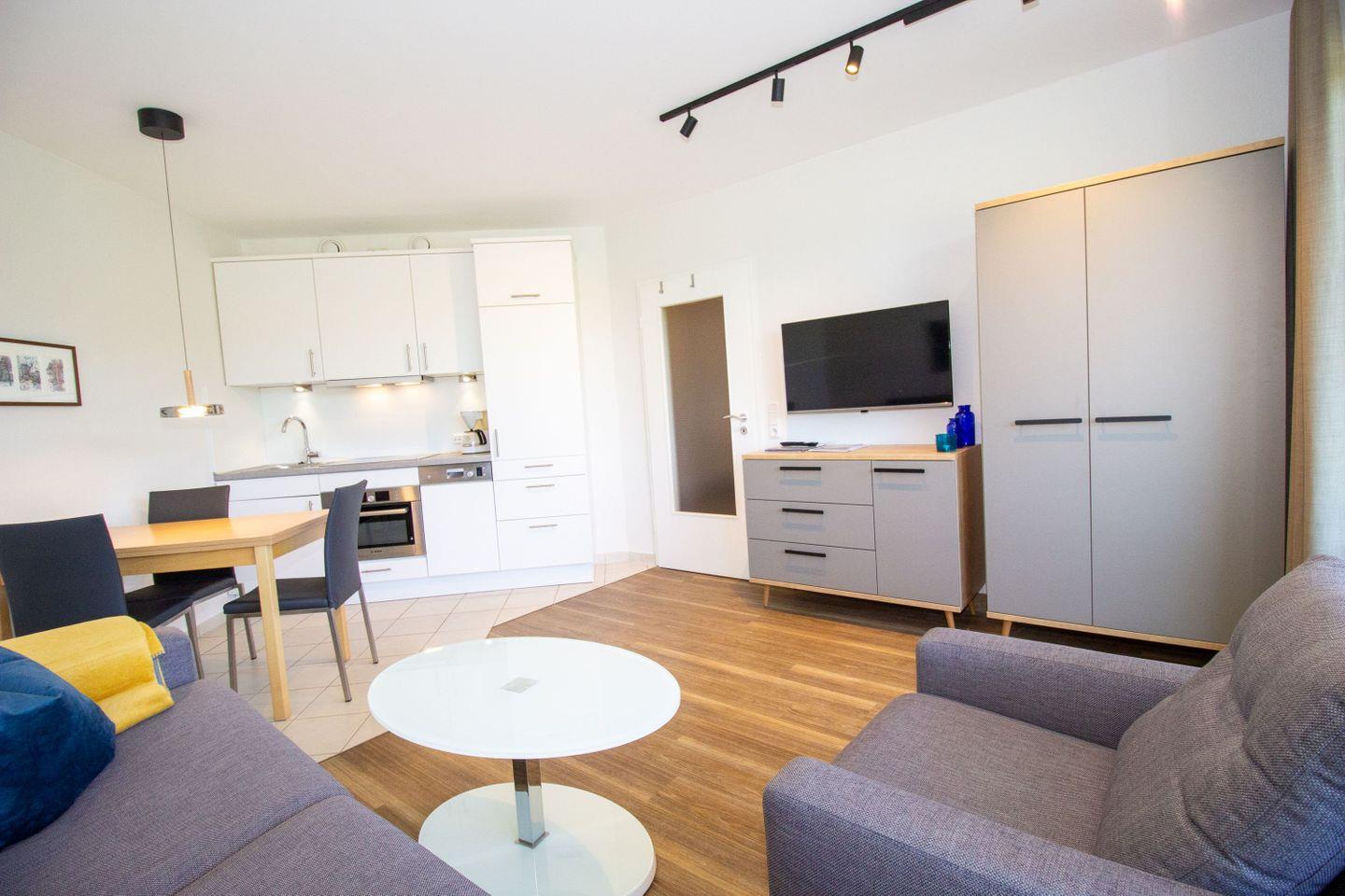 Haus "Kurpark-Residenz", Typ C, Appartement-Nr. "117", 1. OG, Nordseite , ca. 48 m² Wohnungsgröße für maximal 4 Personen, Wohnzimmer mit Schlafsofa, SAT-Fernseher und Stereoanlage, kostenl. W-Lan Zugang im App., separates Schlafzimmer mit Doppelbett (Breite 160cm) und TV Gerät, Dusche/WC, großzügig ausgestattete Küchenzeile mit Mikrowelle, Backofen und Geschirrspüler, Sonnenterrasse in der 1. Etage nutzbar, Tiefgaragenstellplatz, Nichtraucher, Haustiere sind nicht gestattet, Strandkorb im Sommer 2026.