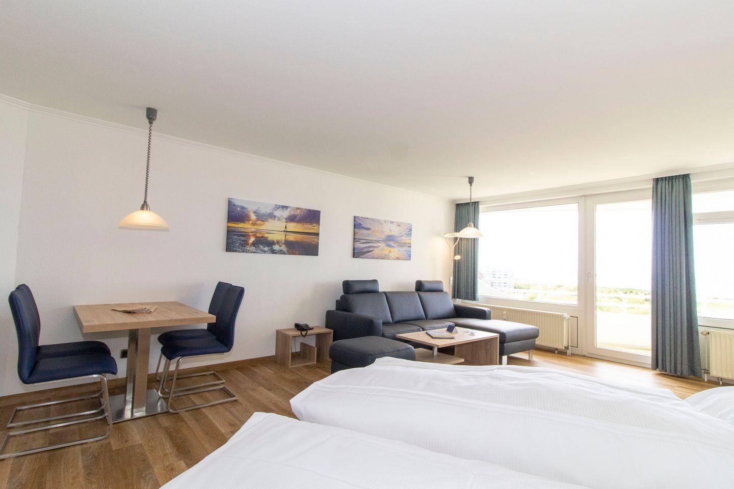 Haus "Lord Nelson", Typ 4, App.-Nr. "706", bis 2 Personen, 7. Etage, ca. 40 qm Größe, am Weltnaturerbe Wattenmeer (Meerblick Richtung Neuwerk), Wohnbereich mit feststehendem Doppelbett, Dusche/WC, Küchenzeile mit Geschirrspüler, Mikrowelle, 4 Platten-Ceranfeld, Telefon, Kabel-TV, Balkon, Tiefgaragenstellplatz, WLAN, Nichtraucherappartement, Haustiere sind nicht erlaubt, Strandkorb im Sommer 2025.