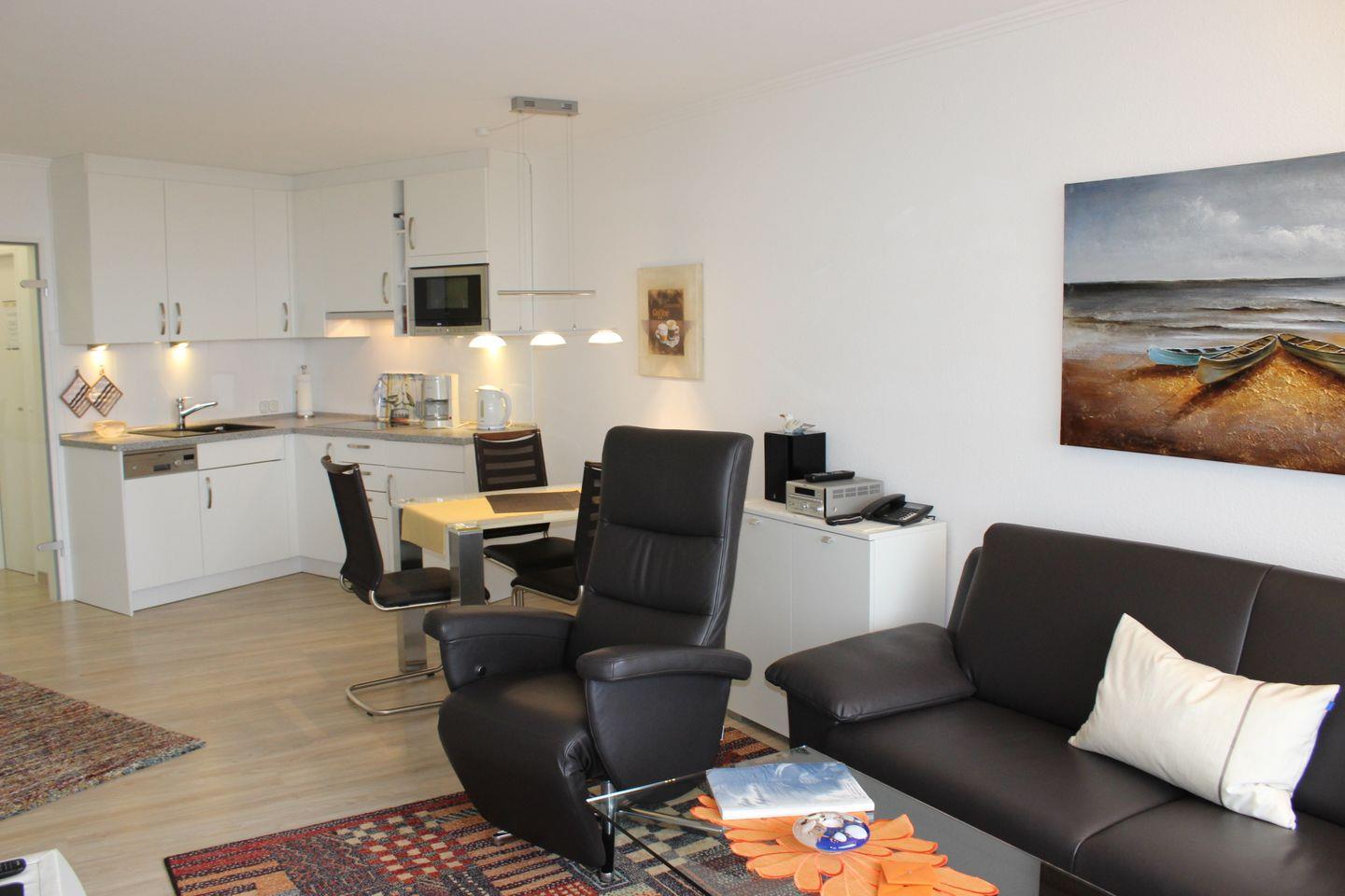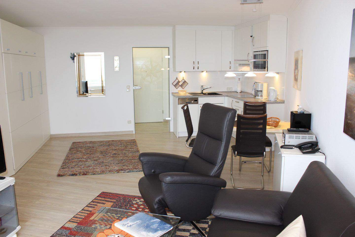 Haus "Lord Nelson", Typ 2, App.-Nr. "705", bis 3 Pers., 7. Etage, ca. 40 qm Größe, am Weltnaturerbe Wattenmeer (Meerblick Richtung Neuwerk), Wohnbereich mit Schrankbett, sep. kleines Schlafzimmer mit Einzelbett, Dusche/WC, Küchenzeile mit Geschirrspüler und Mikrowelle mit Grillfunktion, Telefon, Kabel-TV (Flachbildschirm), Stereoanlage, kostenl. W-Lan Zugang im App., Relax-Sessel, Balkon, Tiefgaragenstellplatz, Haustiere sind nicht erlaubt, Nichtraucherappartement, kein Strandkorb