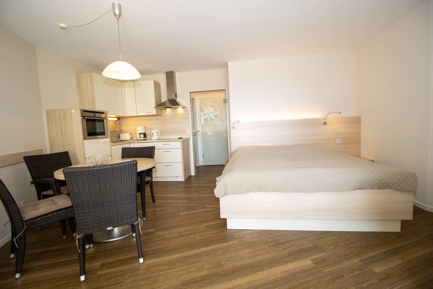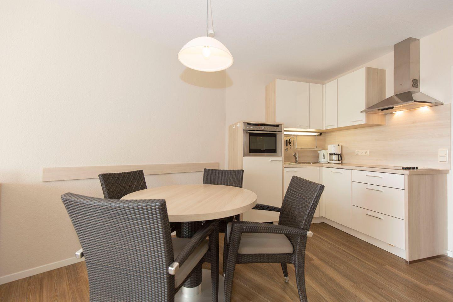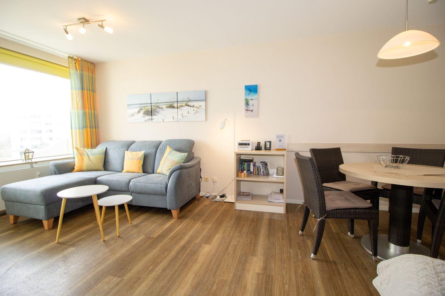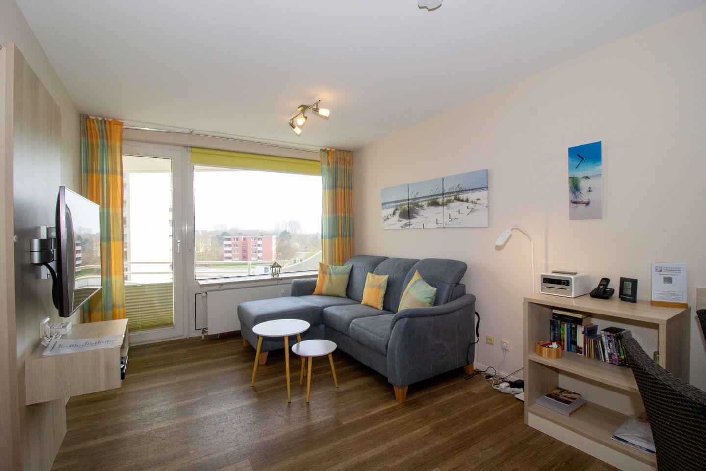 Haus "Lord Nelson", Typ 2, App.-Nr. 419, bis 4 Pers., ca. 40 qm, Weltschifffahrtsweg, seitlicher Meerblick Richtung Elbe, Doppelbett mit 2 Matratzen im Wohnbereich, Kinderzimmer mit Etagenbett, Dusche/WC, Küchenzeile mit 4-Platten-Ceranfeld, Geschirrspüler, Mikrowelle, Backofen, Balkon, Flachbildfernseher (schwenkbar zum Bett), Blu-Ray-Player, Stereo Musiksystem mit Bluetooth, CD, USB DAB+ und Radio, kostenl. W-Lan Zugang im App., Nichtraucherwohnung, Haustiere sind nicht erlaubt, Tiefgaragenstellplatz, Strandkorb im Sommer 2026.