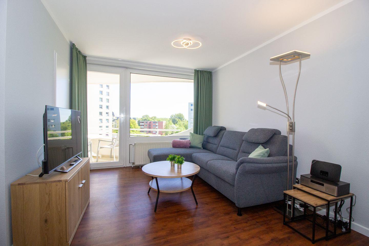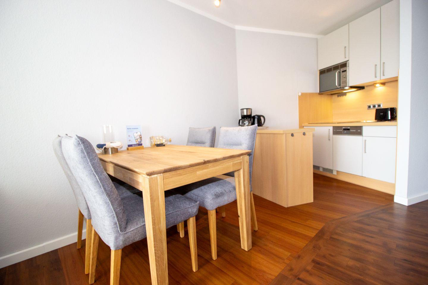 Haus "Lord Nelson", Typ 2, App.-Nr. 417, bis 2 Personen, ca. 40 qm Größe, Weltschifffahrtsweg, seitlicher Meerblick Richtung Elbe, Wohnbereich mit feststehendem Bett, separates Zimmer aktuell unmöbliert, Dusche/WC, Küchenzeile mit Geschirrspüler, Mikrowelle, 4-Platten-Ceranfeld, Laminat, Balkon, Kabel-TV, Nichtraucherwohnung, Strandkorb im Sommer 2026, Tiefgaragenstellplatz.