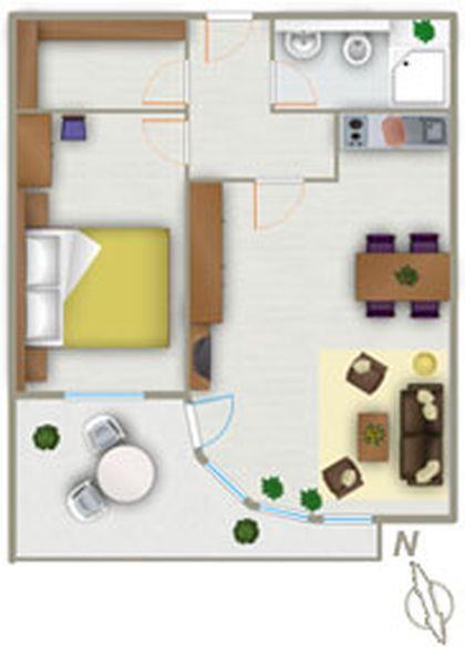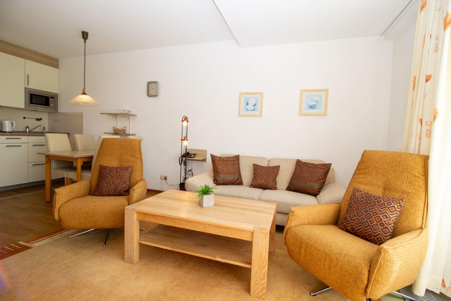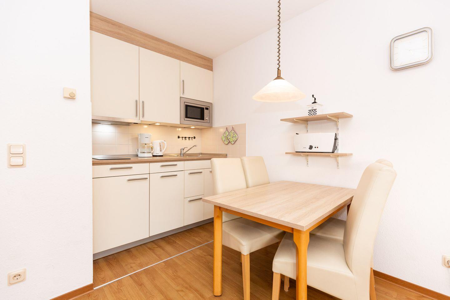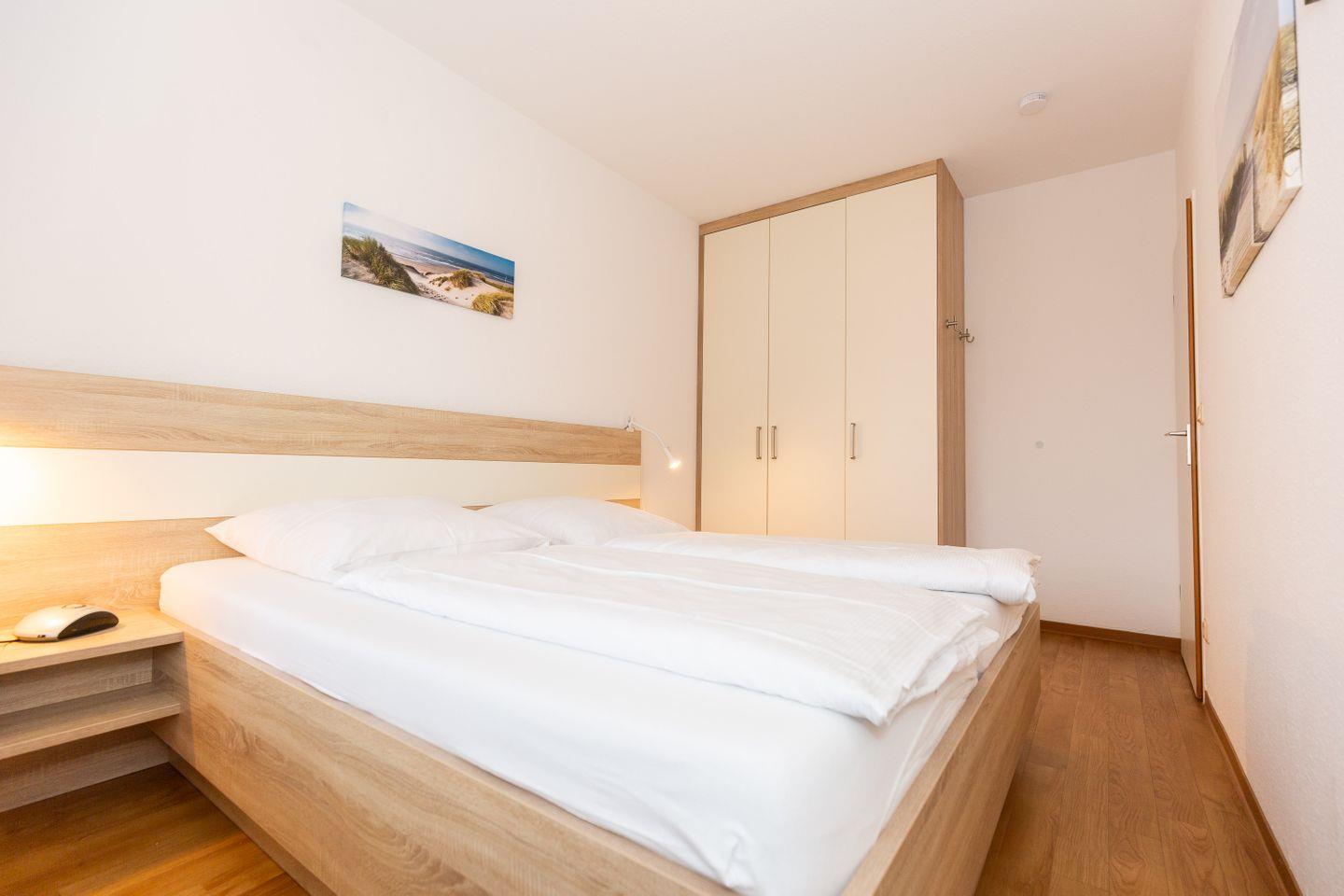 Haus "Trafalgar", Typ B, Appartement-Nr. 247, bis 2 Pers., 2.Etage, ca. 46 qm, Südseite (ohne Meerblick), Schlafzimmer mit Doppelbett, Küchenzeile mit Geschirrspüler, Dusche/WC, Balkon, Kabel-TV, CD-Player, Telefon, WLAN-Zugang im App., Tiefgaragenstellplatz, Nichtraucherwohnung, Strandkorb im Sommer 2026.