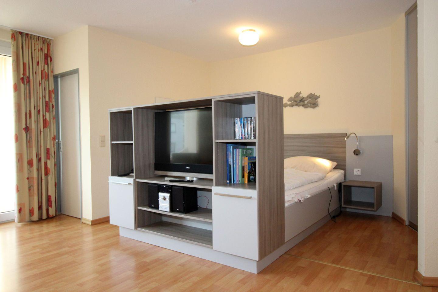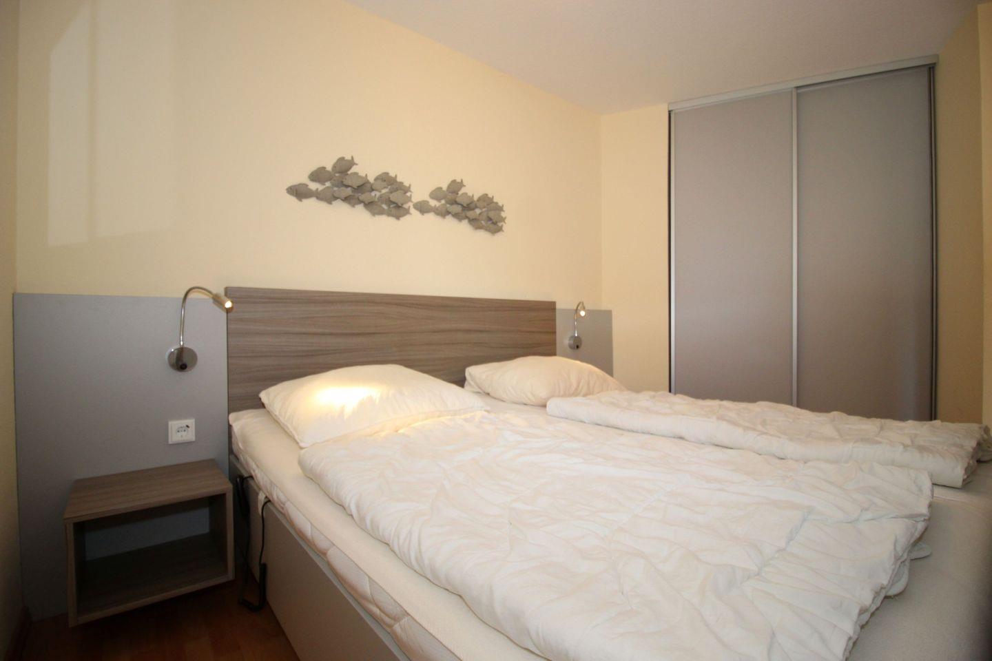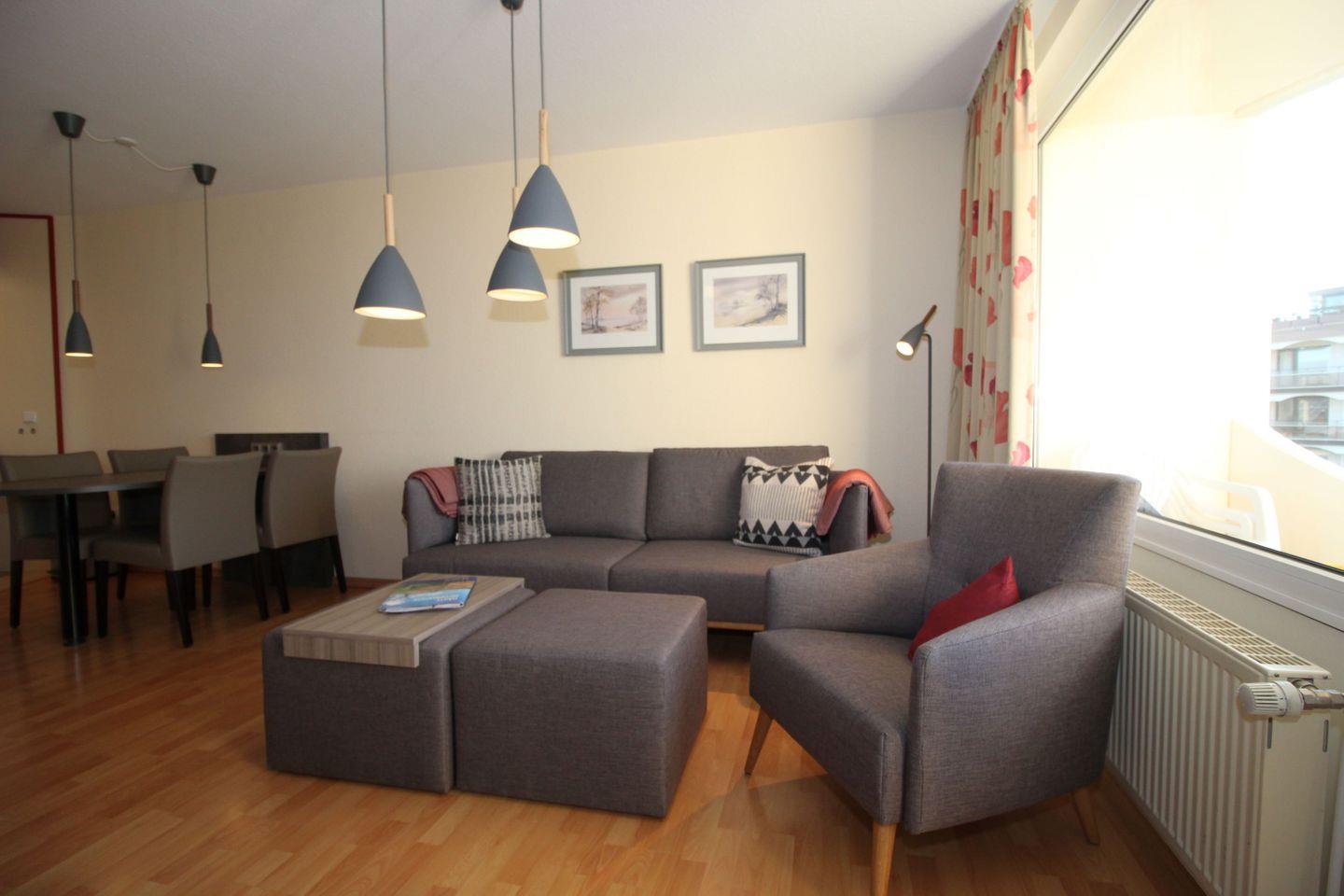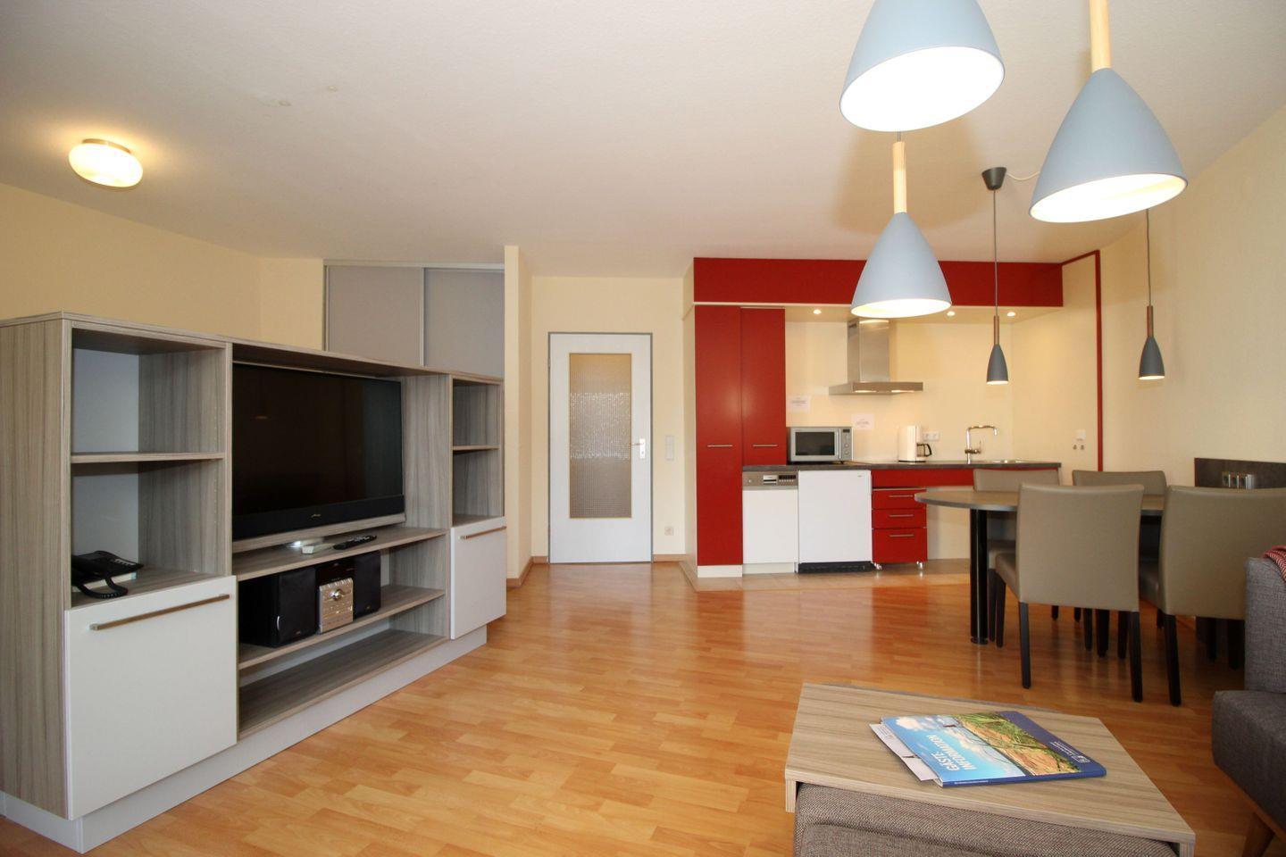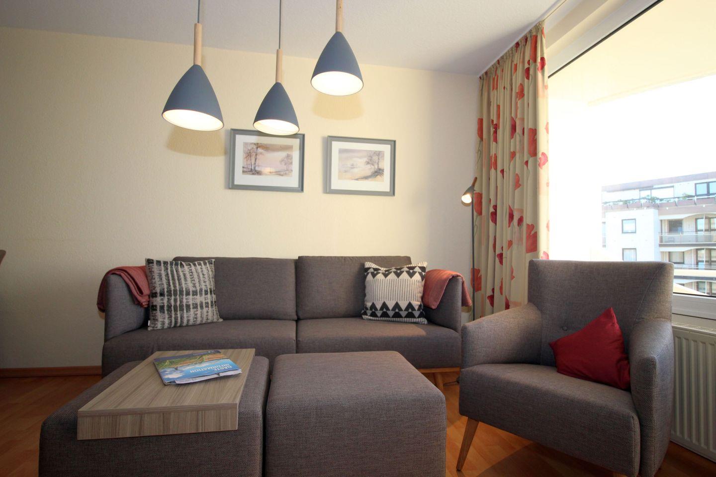 Haus "Trafalgar", Typ C, Appartement-Nr. 226, bis 3 Pers., ca. 55 qm, Westseite, Wohn/Schlafbereich mit Doppelbett (Raumteiler), Schlafzimmer mit Einzelbett, Küchenzeile mit Geschirrspüler und Mikrowelle mit Backofenfunktion, rollstuhlfreundlich (Bad ebenerdig, Haltegriffe im Bad, keine Schwellen, Türbreite im Eingang 80 cm, zum Bad 68 cm), Balkon, Telefon, Kabel-TV, W-Lan Zugang im App, DVD-Player, Tiefgaragenstellplatz, Strandkorb im Sommer 2026, Nichtraucherwohnung.