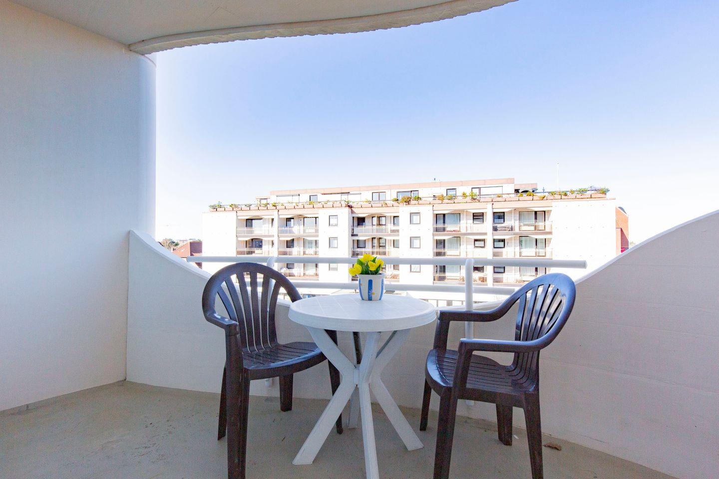 Auf dem Balkon der FeWo kann man den Ausblick auf die wunderschöne Nordsee genießen. Die bequemen Balkonmöbel laden ein zu Entspannung und zum Genießen der frischen Nordseeluft. Eine Rampe bietet auch dem Rollstuhl die Möglichkeit auf den Balkon zu gelangen.