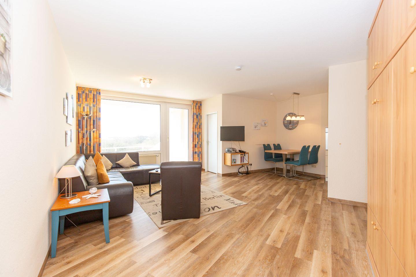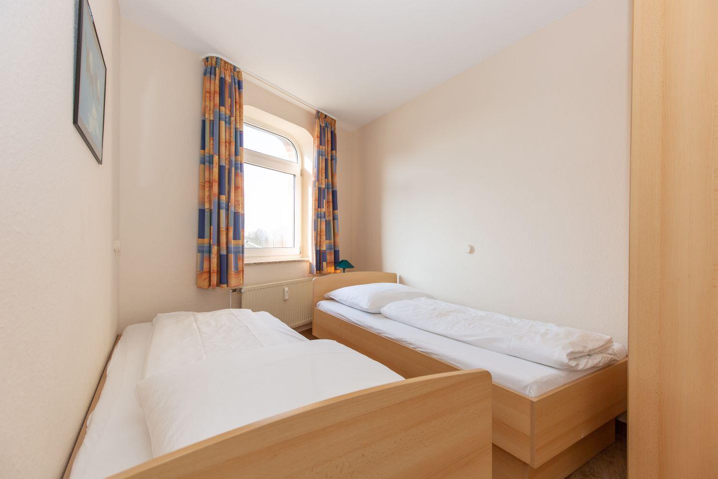 Haus "Trafalgar", TypC, App.-Nr. 222 bis 4 Pers., 2.Etage, ca. 55qm, Westseite, Wohn/Schlafbereich mit Schrankbett, Schlafzimmer mit zwei zusammenstehenden Einzelbetten, Küchenzeile mit Backofen, Geschirrspüler und Mikrowelle, Dusche/WC, Balkon, Kabel-TV, W-Lan Zugang im App, Telefon, Tiefgaragenstellplatz, Strandkorb im Sommer 2026