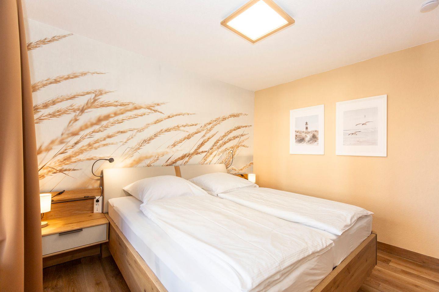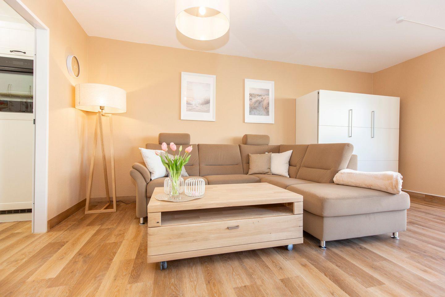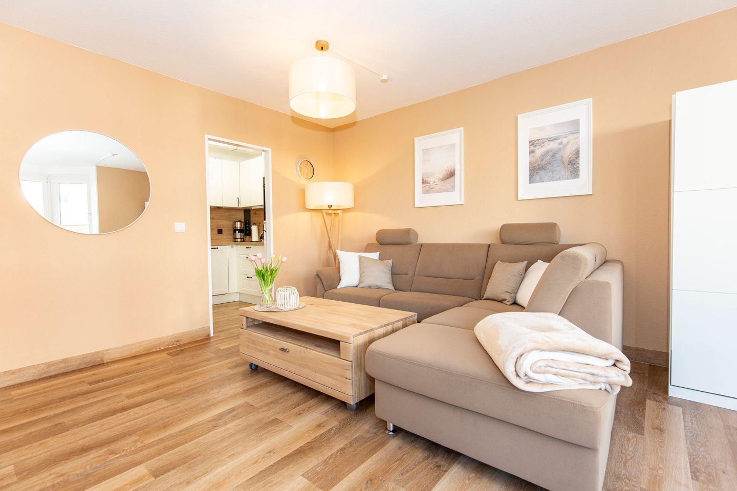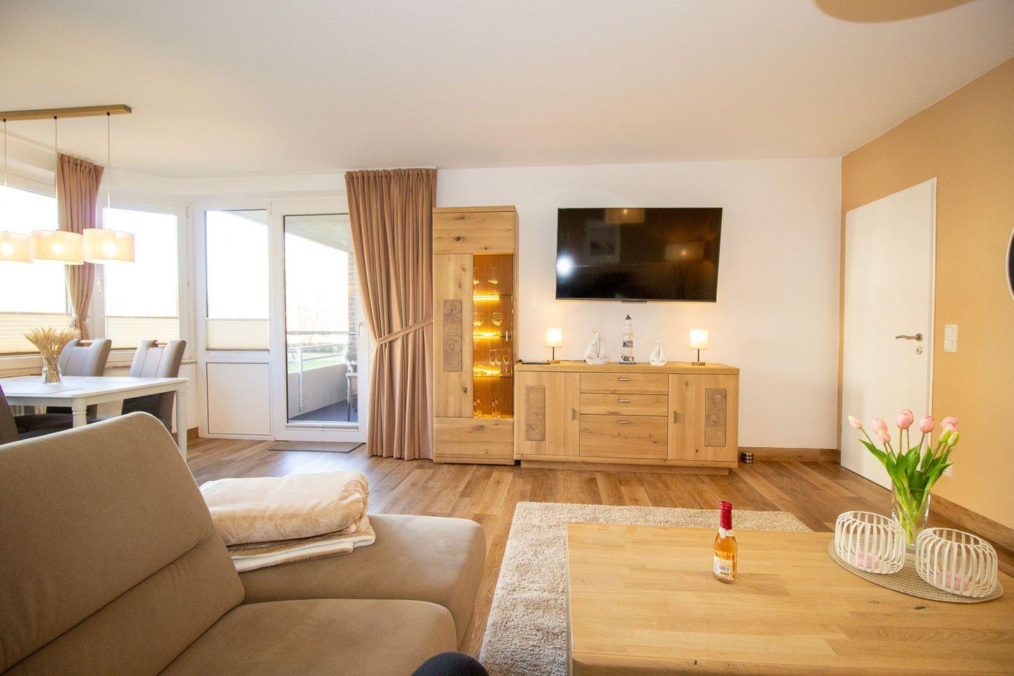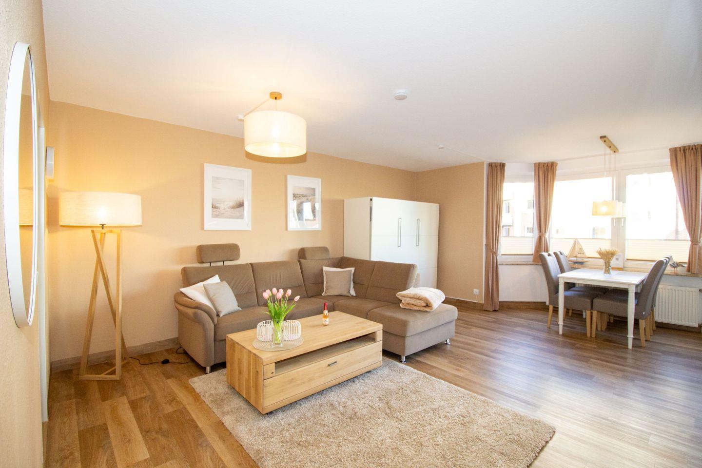 Haus "Trafalgar", Typ C, App.-Nr. 154, bis 4 Pers., 1.Etage, ca. 55 qm, Nordseite (ohne Meerblick), Schlafzimmer mit Doppelbett, Wohn/Schlafbereich mit Schrankbett, sep. Küche, Dusche/WC, Balkon, Kabel-TV, W-Lan Zugang im App, Haustiere sind nicht gestattet, Nichtraucherwohnung, Tiefgaragenstellplatz, Strandkorb im Sommer 2026.