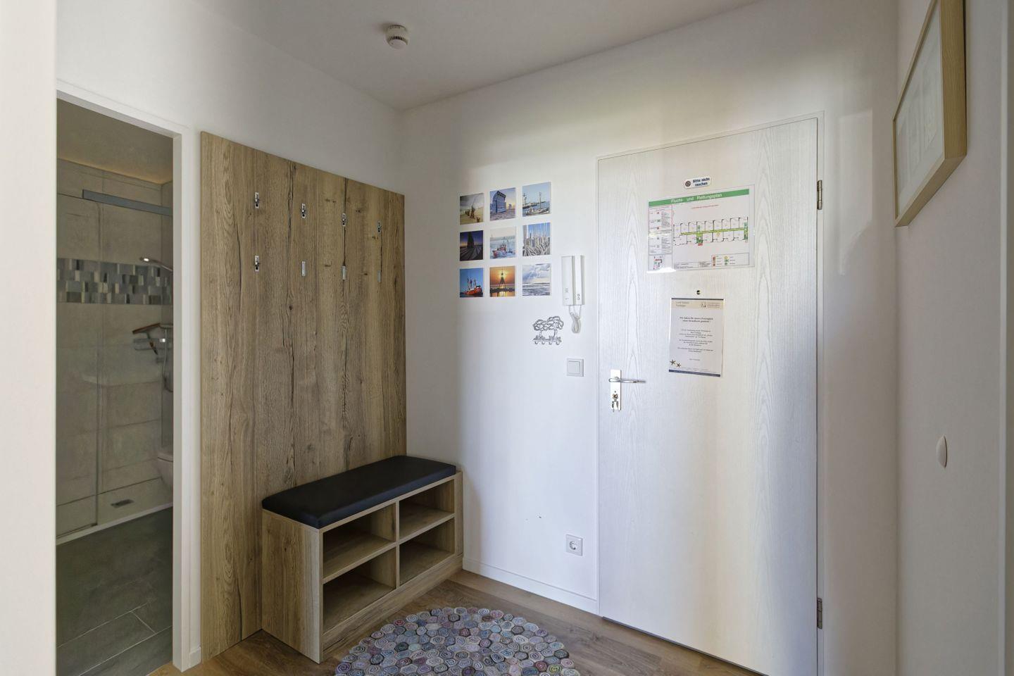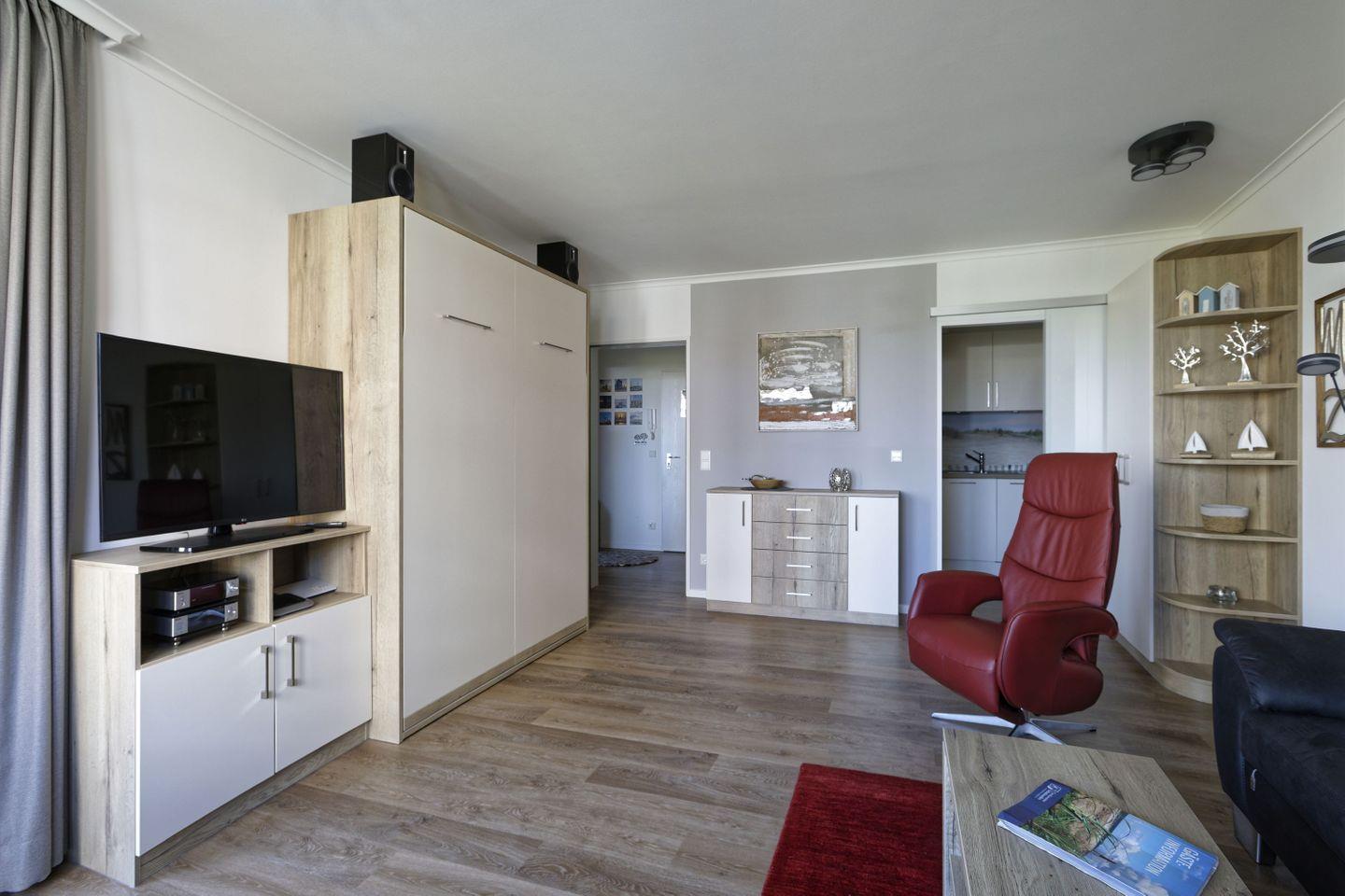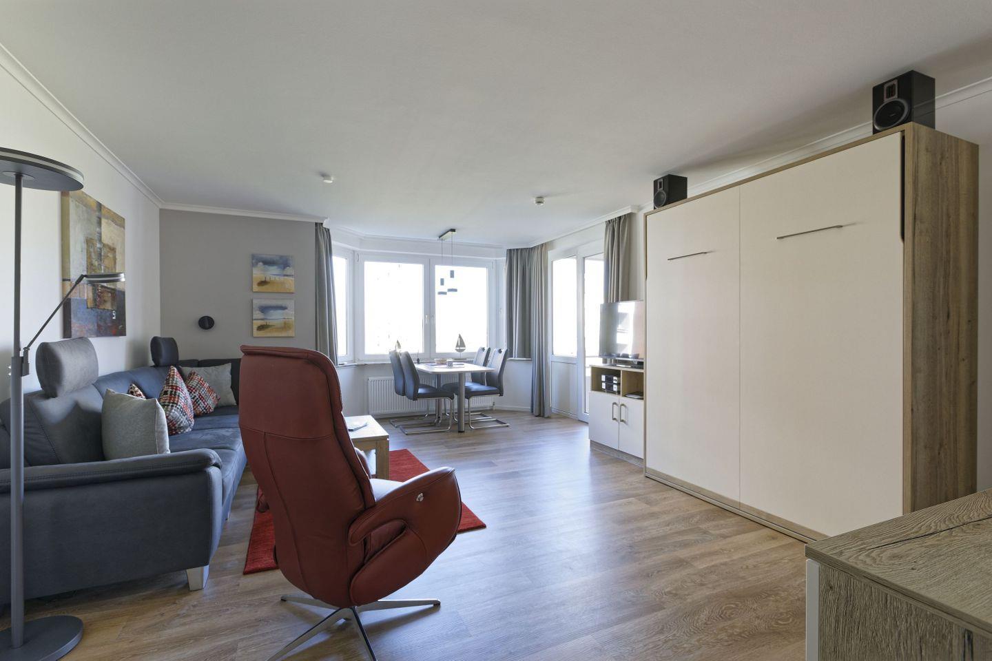 Haus "Trafalgar", Typ C, App.-Nr. 153, bis 4 Pers., 1. Etage, ca. 55 qm Größe, Nordseite (ohne Meerblick), Wohn/Schlafbereich mit Schrankbett, Schlafzimmer mit Doppelbett und TV, sep. Küche mit Geschirrspüler, Backofen, Ceranfeld und Mikrowelle, Dusche/WC, Balkon, Kabel-TV, kostenl. WLAN-Zugang im App., Haustiere sind nicht gestattet, Nichtraucherwohnung, Tiefgaragenstellplatz, Strandkorb im Sommer 2026