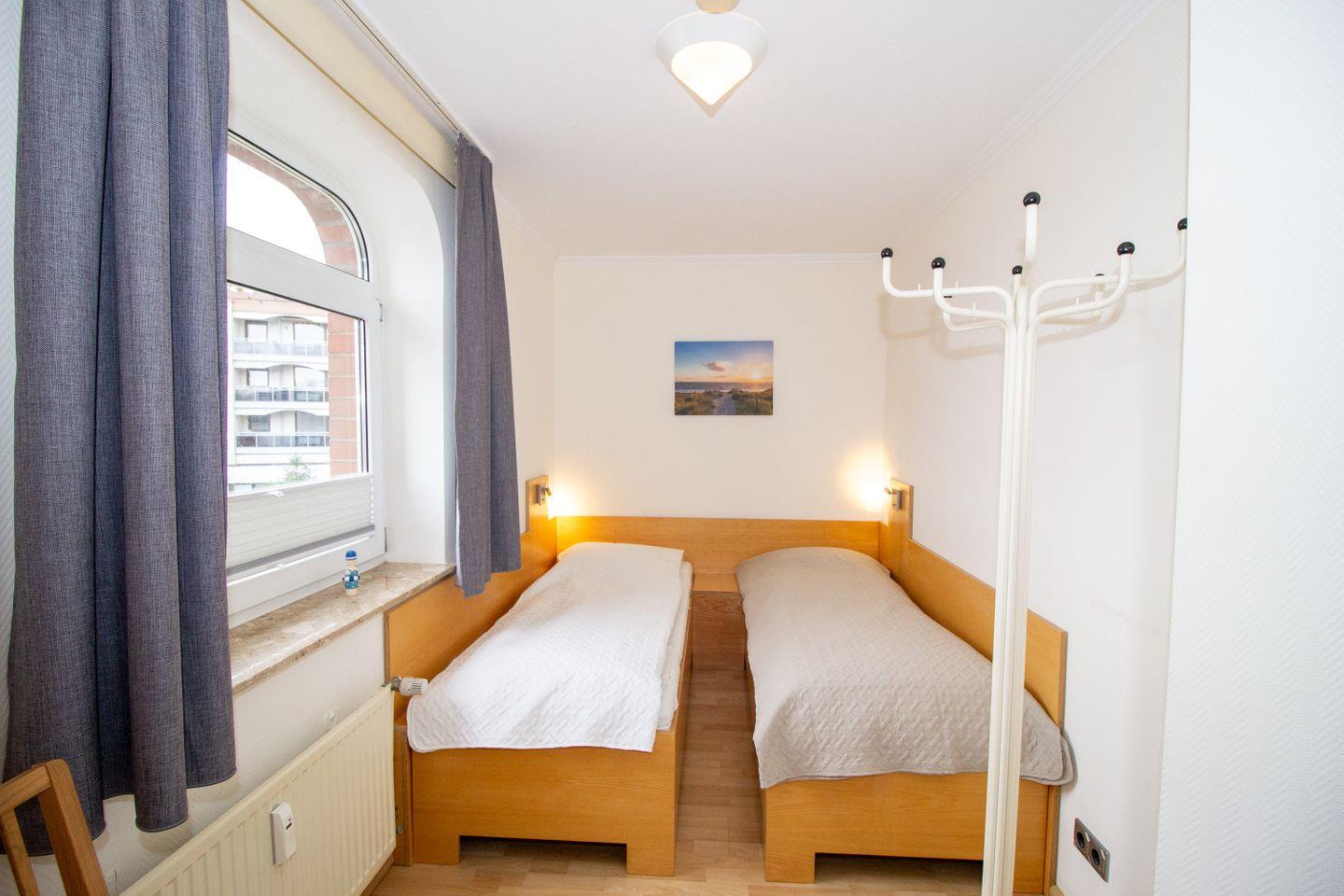 Haus "Trafalgar", Typ D, Appartement-Nr. 127, bis 4 Pers., 1.Etage, ca. 66 qm, Westseite (ohne Meerblick), Schlafzimmer mit Doppelbett, Schlafzimmer mit zwei Einzelbetten, separate Küche mit Backofen, Mikrowelle und Geschirrspüler, Dusche/WC, Balkon, Kabel-TV, Telefon, kostenl. WLAN-Zugang im App., Tiefgaragenstellplatz, Haustiere sind nicht gestattet, Nichtraucherwohnung, Strandkorb im Sommer 2026.