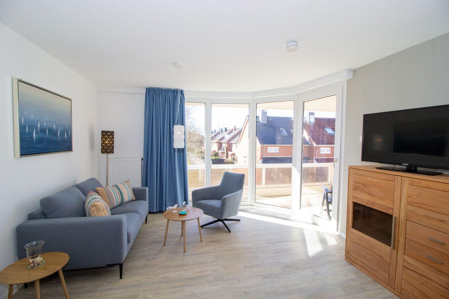Haus "Trafalgar", Typ B, Appartement-Nr. 142, bis 2 Pers., 1.Etage, ca. 46 qm, Südseite (ohne Meerblick), Wohnzimmer mit Fernsehsessel, Schlafzimmer mit Doppelbett inklusive verstellbarer Lattenroste, Küchenzeile mit Geschirrspüler und Mikrowelle, Dusche/WC, Balkon, Kabel-TV, Telefon, kostenl. WLAN-Zugang im App., Haustiere sind nicht gestattet, Nichtraucherwohnung, Tiefgaragenstellplatz, Strandkorb im Sommer 2026.