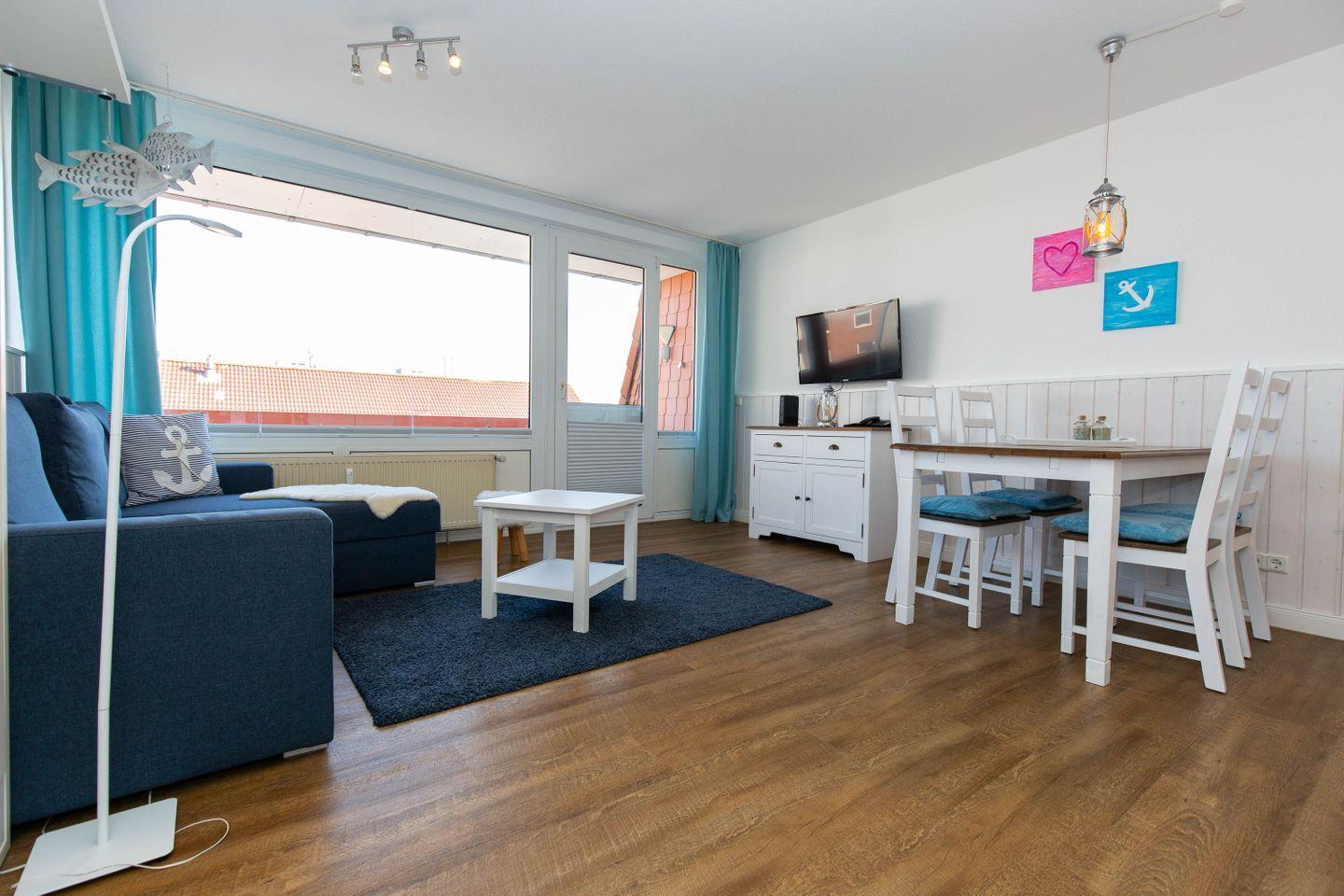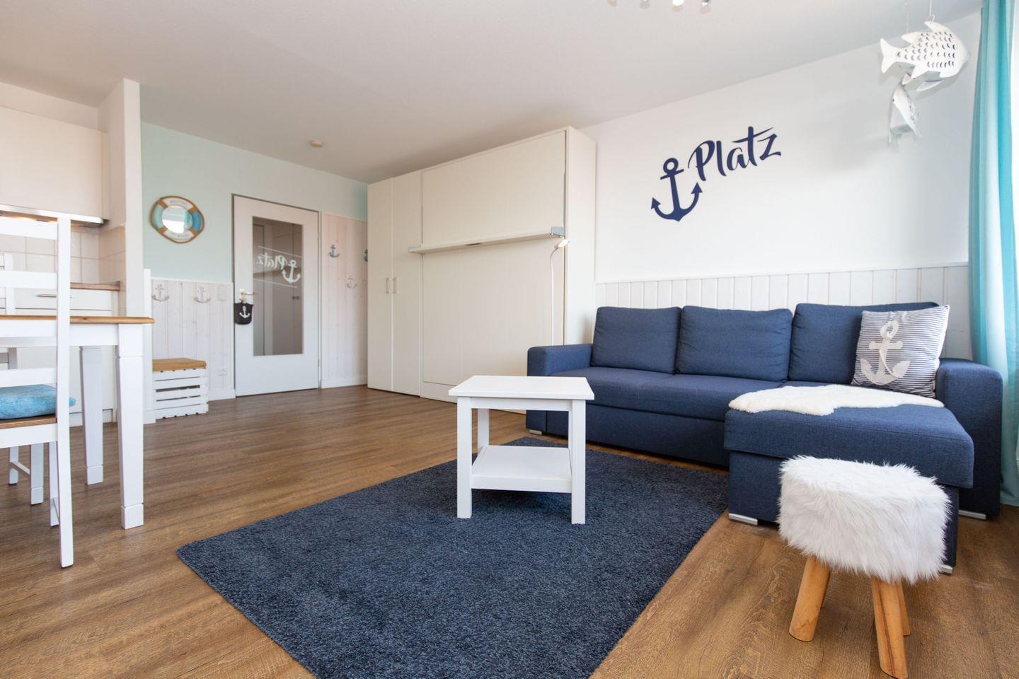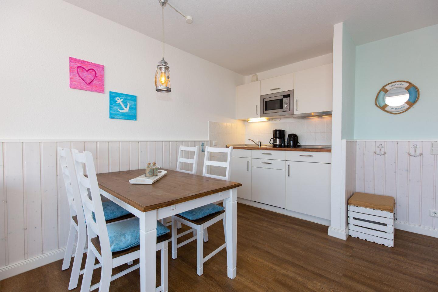 Haus "Trafalgar", Typ A, App.-Nr. 429, bis 2 Pers., 4. Etage, ca.34 qm, Ostseite (ohne Meerblick), Wohn/Schlafbereich mit Schrankbett, Küchenpantry mit Mikrowelle inkl. Grillfunktion, Geschirrspüler, Dusche/WC, Balkon, Kabel-TV, W-LAN im App., Tiefgaragenstellplatz, Nichtraucherwohnung, keine Haustiere, Strandkorb im Sommer 2026, ab 5 Übernachtungen stellt der Gastgeber einmalig Bettwäsche und Handtücher pro Person bereit.