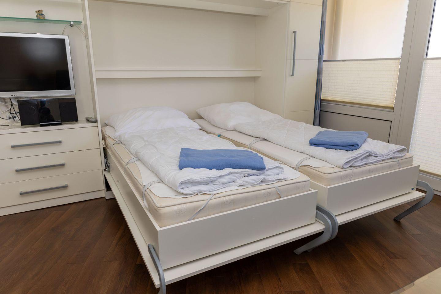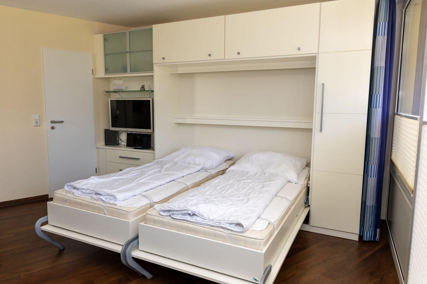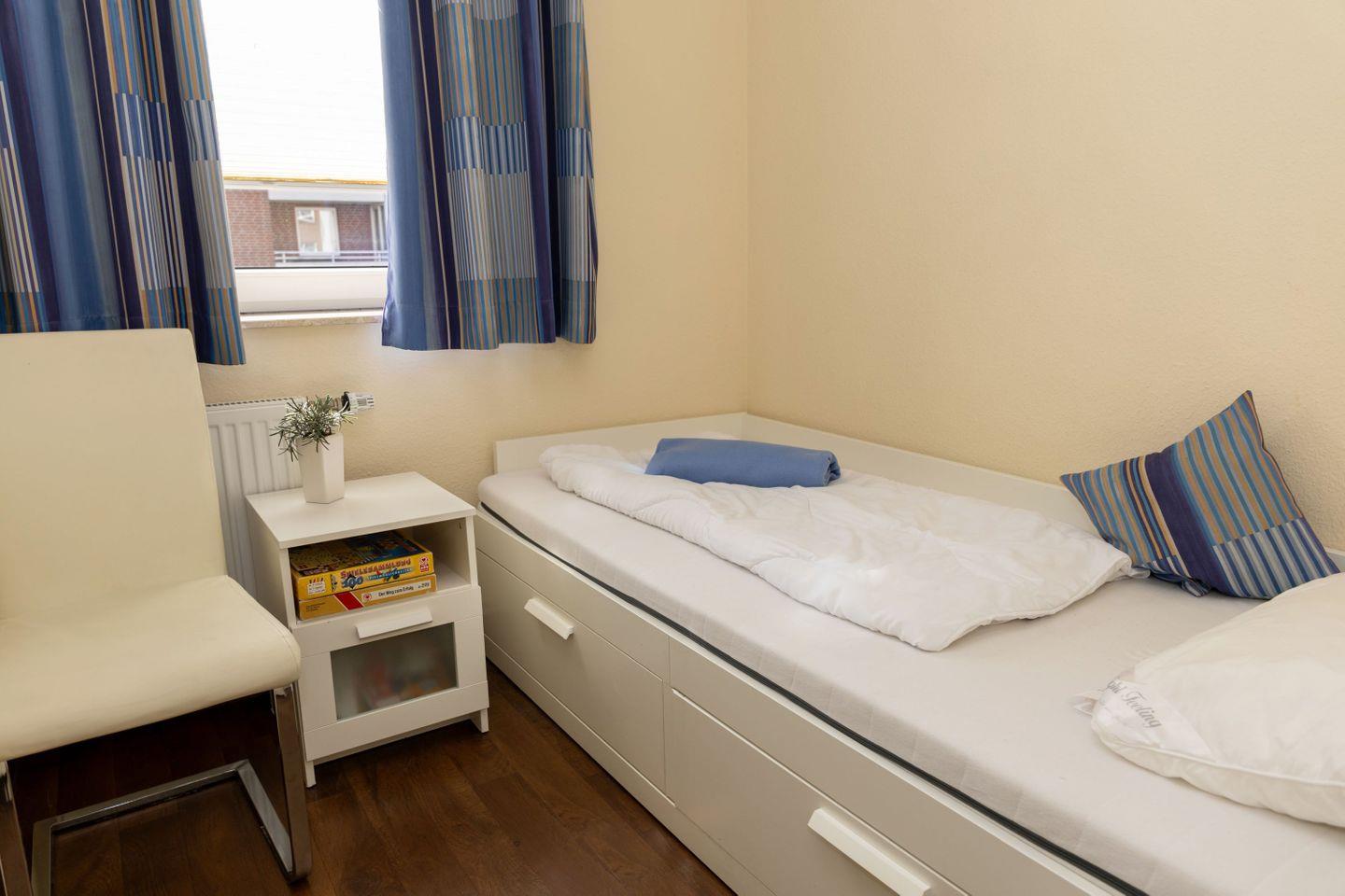 Haus "Lord Nelson", Typ 7, App.-Nr. "111", 1. Etage, bis 3 Pers., ca. 43 qm Größe, Weltschifffahrtsweg (ohne Meerblick, Richtung Elbe), Wohnbereich mit Schrankbett (einzeln klappbar), sep. Schlafzimmer mit Einzelbett, Dusche/WC (sep. Zugang zum Bad aus beiden Zimmern möglich), helle Küchenzeile mit Fenster im Essbereich mit Mikrowelle/Grillfunktion und Geschirrspüler, Nichtraucher App., Balkon, Kabel-TV mit DVD-Player, CD-Player, kostenl. W-Lan-Zugang im App., Haustiere sind auf Anfrage gestattet, Außenstellplatz, Strandkorb im Sommer 2026
