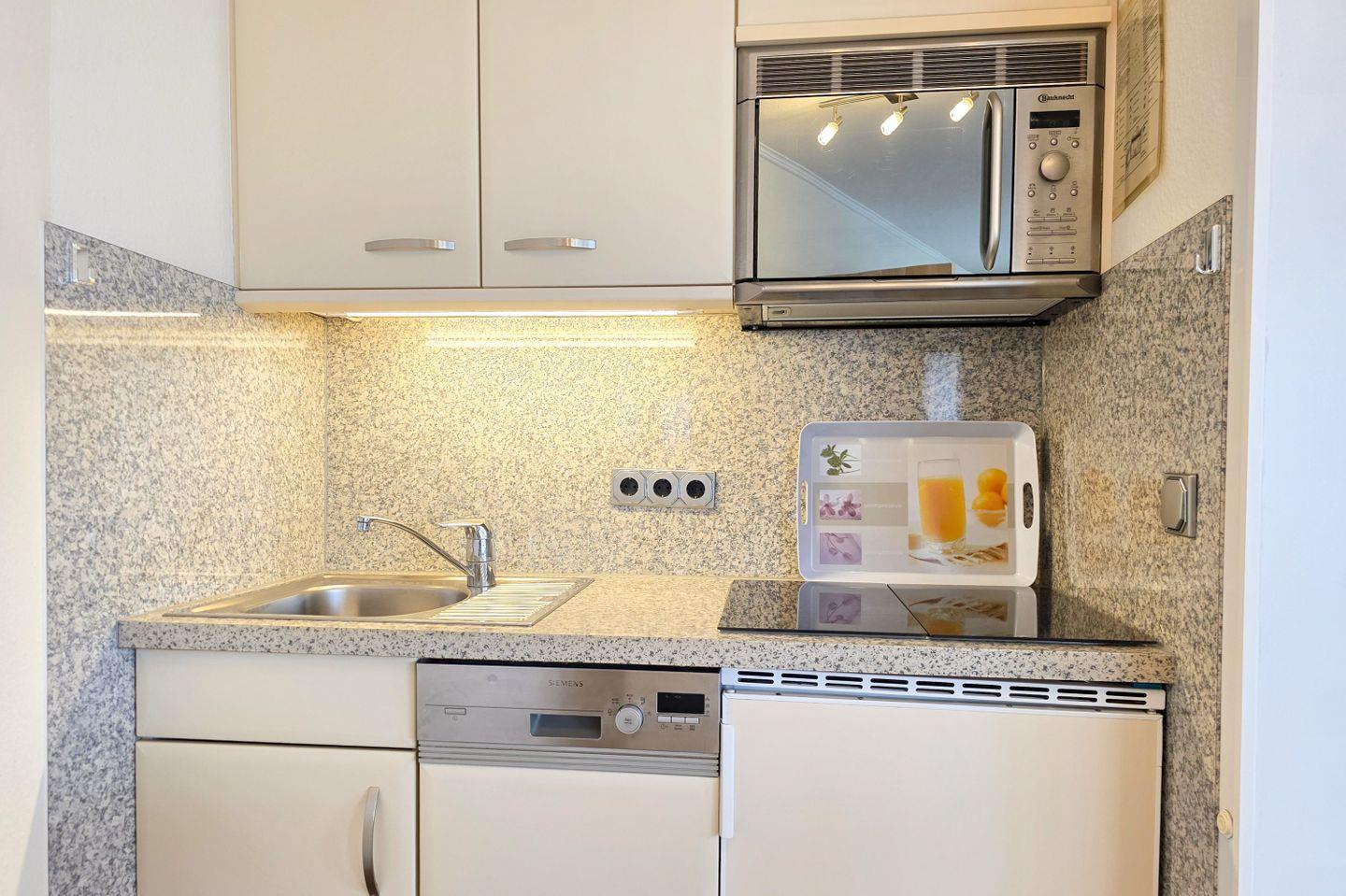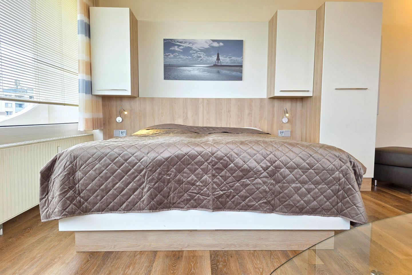 Haus "Lord Nelson", Typ 1, App.-Nr. 520, bis 2 Pers., 5. Etage, ca. 43 qm, Ostseite, Meerblick Richtung Nordsee, seitlicher Meerblick Richtung Elbe, Wohn-Schlafraum mit Doppelbett, Dusche/WC, Küchenzeile mit Geschirrspüler und Mikrowelle, 4-Platten Ceranfeld, Balkon, Kabel-TV (Flat-Screen), kostenl. W-Lan Zugang im App., CD-Spieler, Tresor, Tiefgaragenstellplatz, Strandkorb im Sommer 2026, Haustiere sind nicht erlaubt, Nichtraucherwohnung.