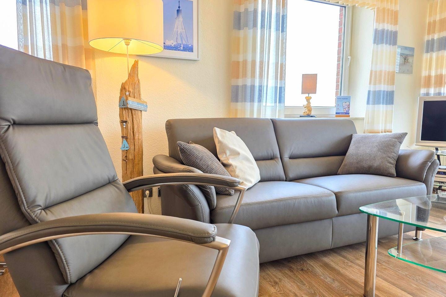 Auf dem Balkon stehen Ihnen ein Tisch und zwei Stühle zur Verfügung. Hier können Sie Platz nehmen, um einen fantastischen Panoramablick in Richtung Weltnaturerbe Wattenmeer und Nordsee sowie auf den Weltschifffahrtsweg zu genießen und den "dicken Pötten" auf ihrem Weg nach Hamburg zuzuschauen.