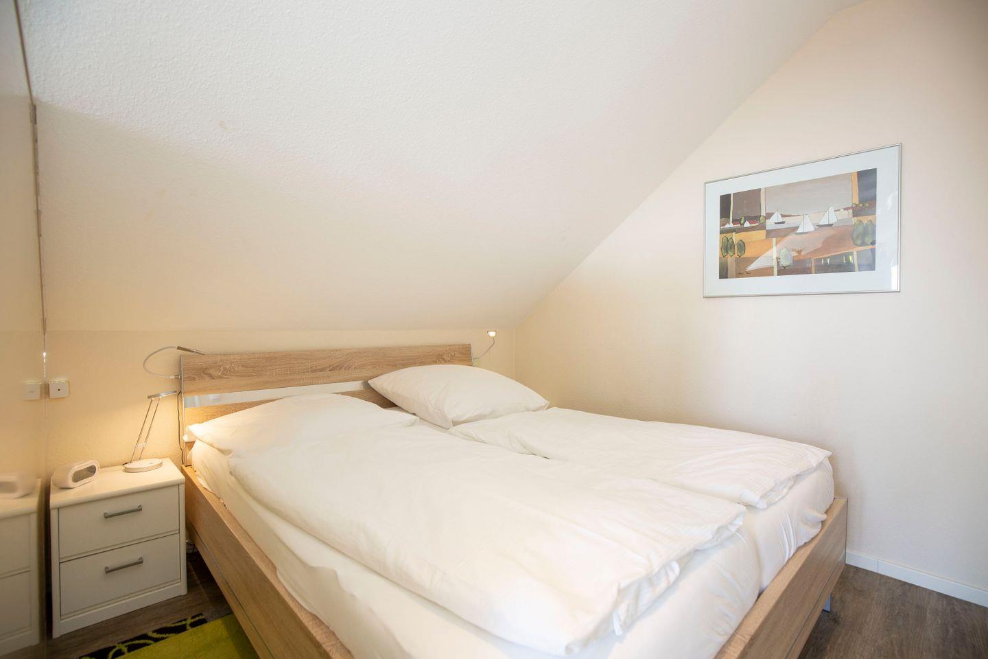 Haus "Trafalgar", Typ B-Süd, App.-Nr. "341", bis 2 Pers., 3. Etage, Südseite (ohne Meerblick), Wohn/Schlafraum mit Doppelbett, Küchenzeile mit 4-Platten-Ceranfeld und Mikrowelle, Dusche/WC, ca. 40 qm Größe mit Dachschrägen, Balkon, Kabel-TV, kostenl. WLAN-Zugang im App., Tiefgaragenstellplatz, Nichtraucherwohnung, Haustiere sind nicht gestattet, Strandkorb im Sommer 2026.