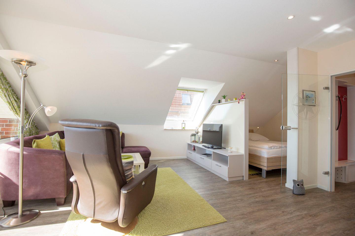 Die 1-Zimmer-Ferienwohnung besticht durch einen modernen Einrichtungsstil. Dekorationselemente in grau, grün und weiß kreieren pure Urlaubsatmosphäre. Dieser Eindruck wird durch die Auswahl der Möbel bestärkt. Die Ferienwohnung bietet Platz für bis zu 2 Urlaubsgäste und ist somit ideal für Paare oder Singles. Hier verbringen unsere Gäste den Nordsee-Urlaub in direkter Strandnähe. Spontanen Strandspaziergängen und Baden im Meer steht nichts im Weg.