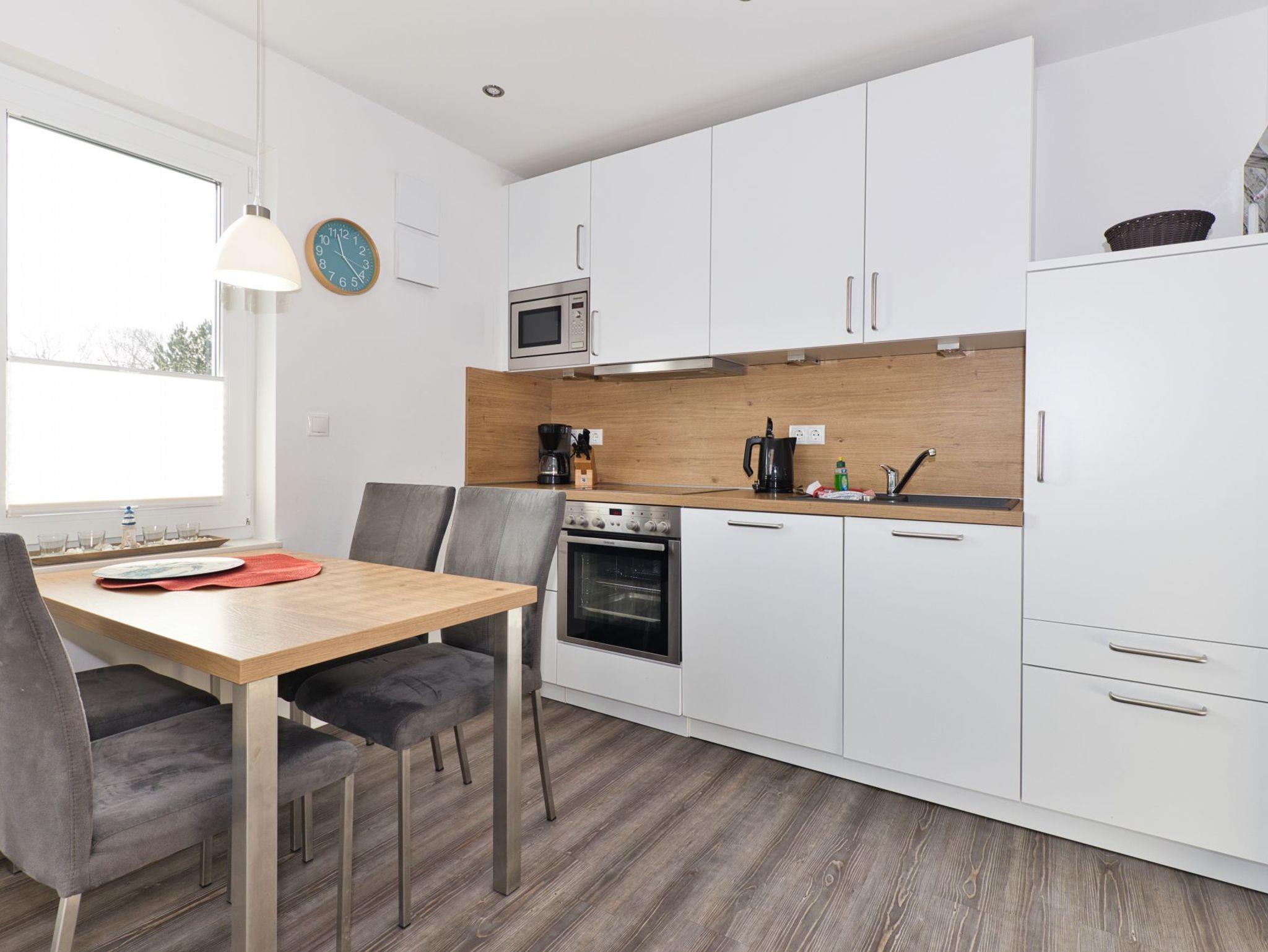 Die Wohnung befindet sich in der 1. Etage des Hauses Steuerbord und ist bequem mit dem Fahrstuhl erreichbar. Barrierefreiheit ist bei uns selbstverständlich. Der Wohn-, Ess- und Küchenbereich erwartet Sie mit einer hellen, gemütlichen Atmosphäre und stilvollen Möbeln. Von hier aus gelangen Sie auf den großzügigen Balkon, der mit bequemen Sitzmöbeln ausgestattet ist und Ihnen einen entspannten Platz im Freien bietet.