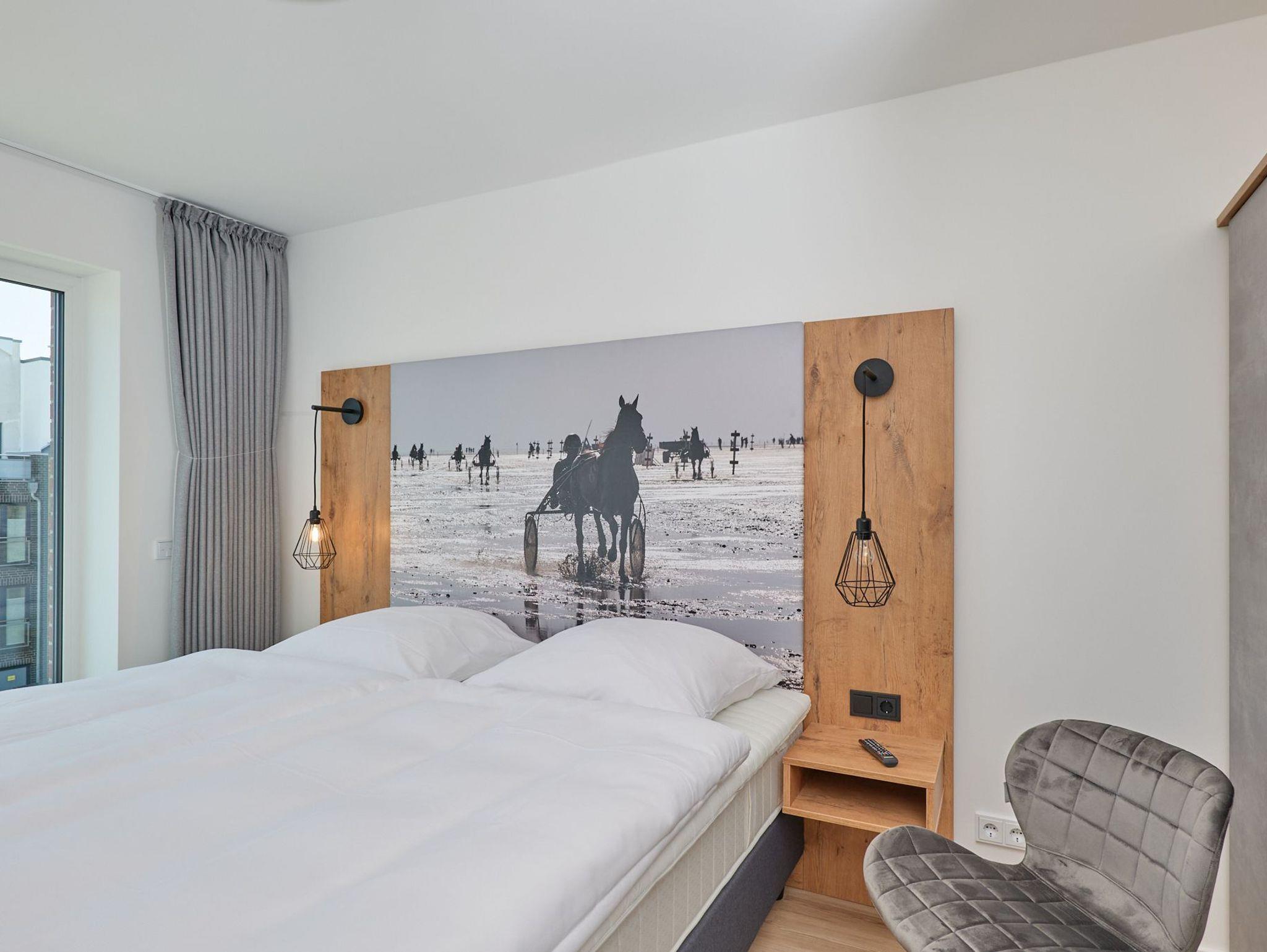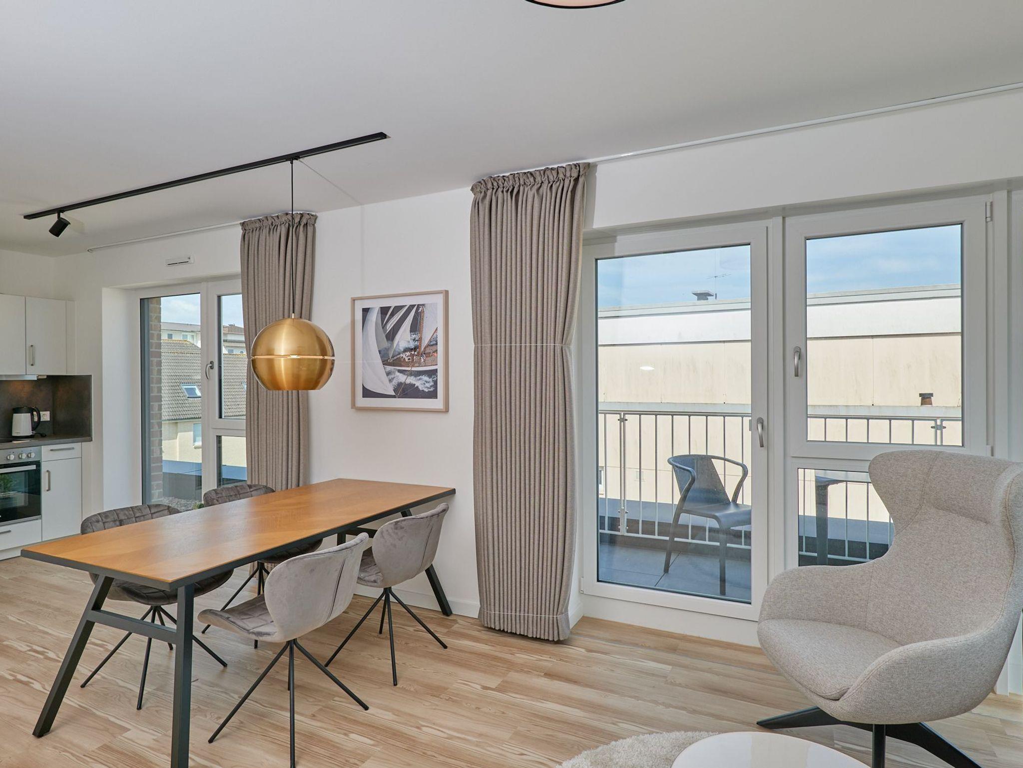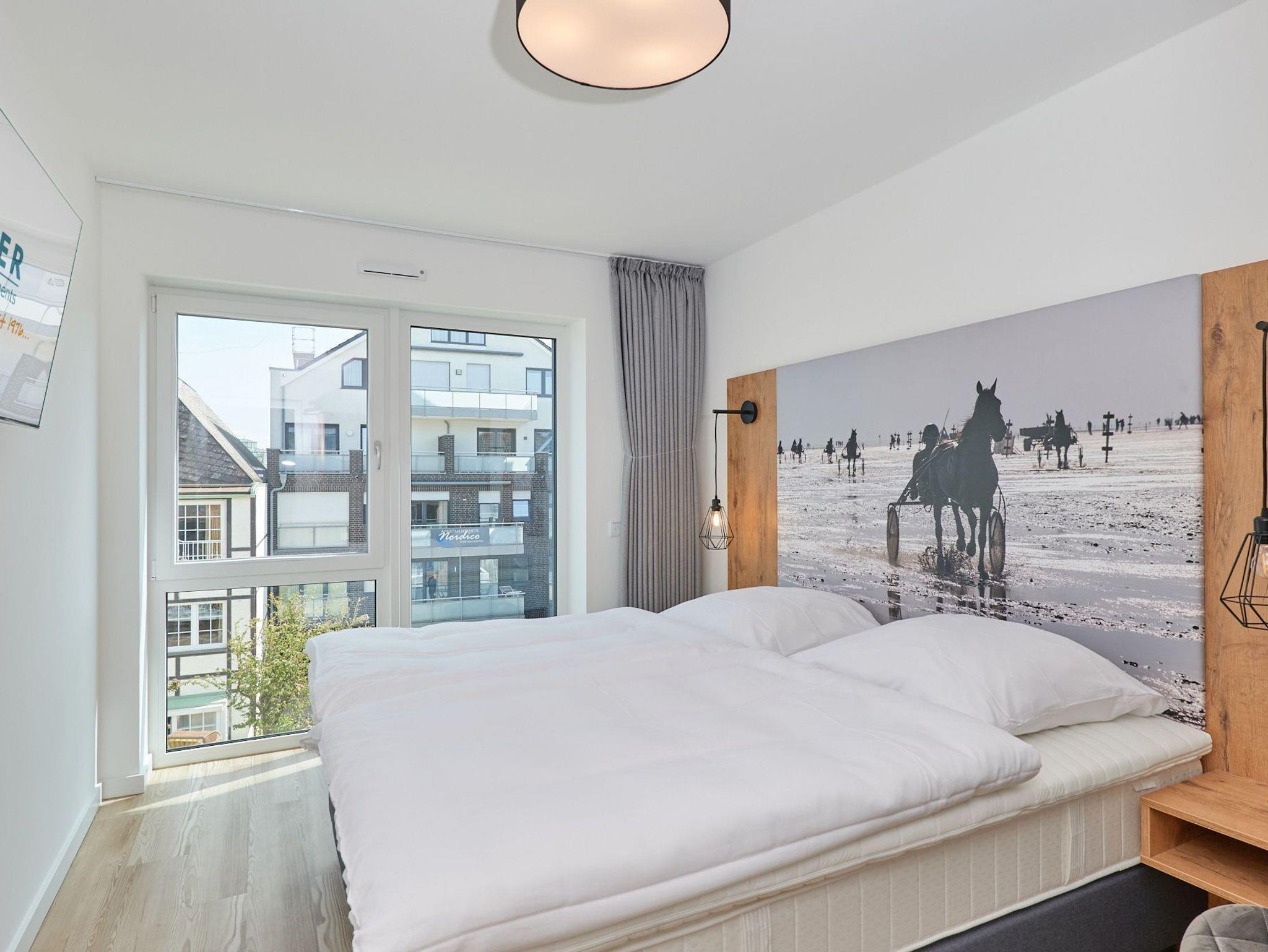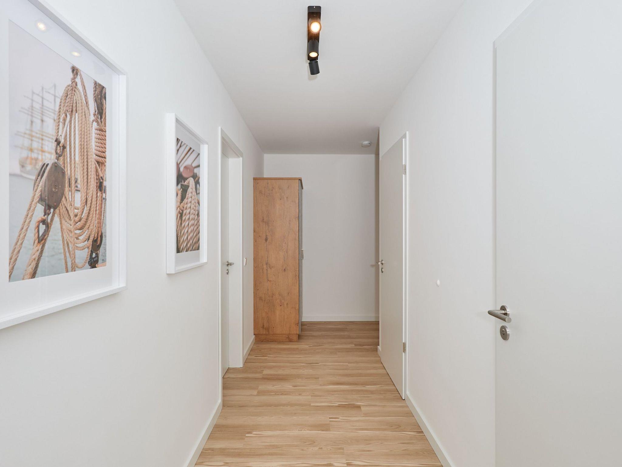 Neubau Mai 2023! Sehr schöne, moderne 3-Raum-Wohnung bis 4 Pers. voll ausgestattet auf ca. 80 m² in der 3.Etage gelegen, 2 Schlafzimmer (1x Doppelbett, 1x 2 Einzelbetten) und Außenjalousien an allen Fenstern, ebenerdige Dusche/WC, Wohnzimmer mit großer Küchenzeile (Backofen, Geschirrspüler, Mikrowelle) u. Teilseesicht, 2x Kabel-TV, Radio, kostenfreies W-LAN-Internet, kleiner Balkon (nord) mit Teilseesicht, Personenaufzug, reservierter Pkw-Stellplatz in der Tiefgarage inkl., es sind keine Haustiere erlaubt und natürlich Nichtraucher. Durchfahrtshöhe Tiefgarage: 2,05m.