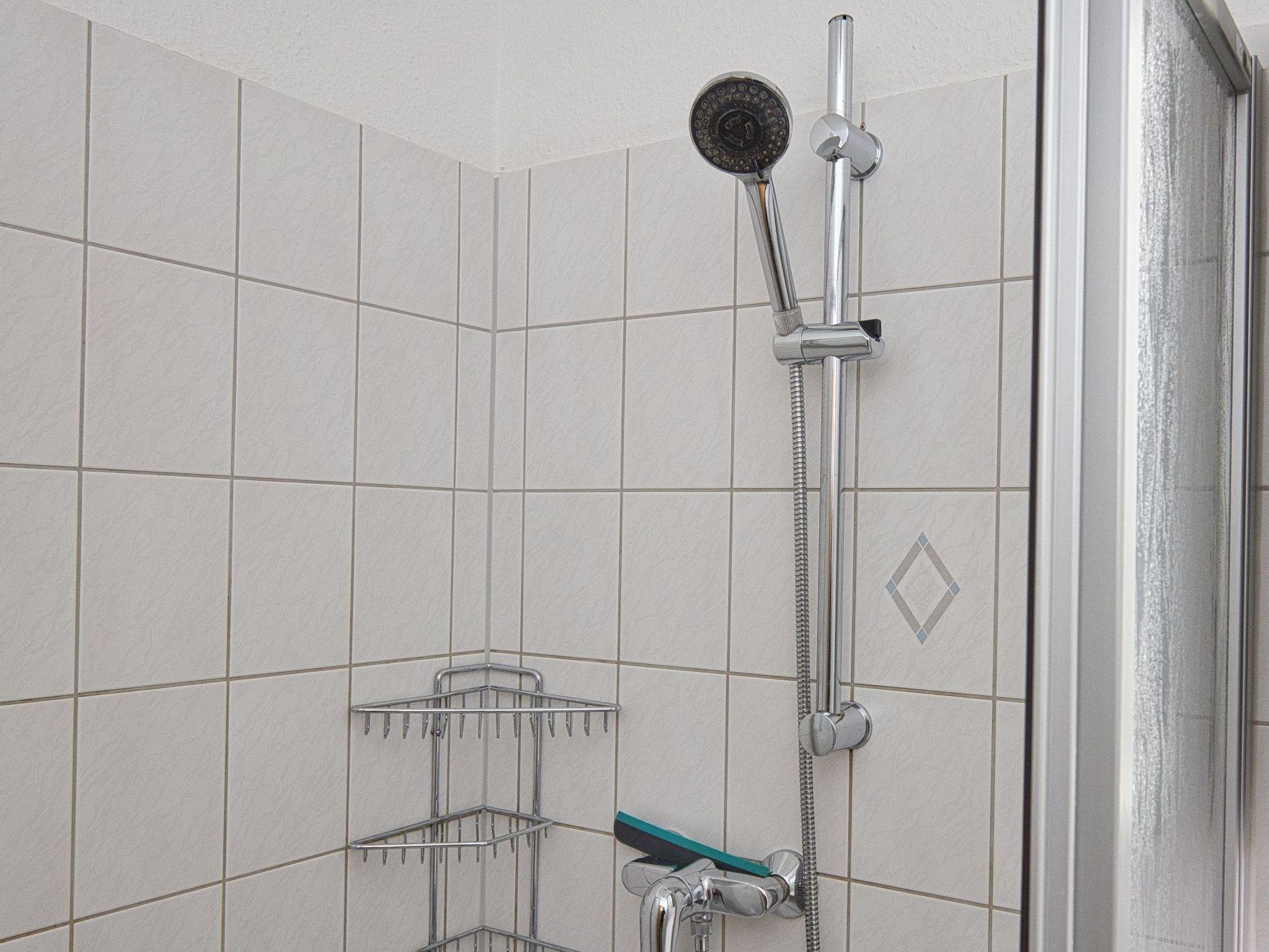 Das hell geflieste Badezimmer liegt direkt am Eingang der Wohnung und ist übersichtlich ausgestattet. Dusche, Waschbecken und WC sind funktionell und pflegeleicht gestaltet. Der Eingangsbereich bietet zudem eine Garderobe sowie einen kleinen Abstellschrank, sodass Jacken, Schuhe oder Taschen ordentlich verstaut werden können.