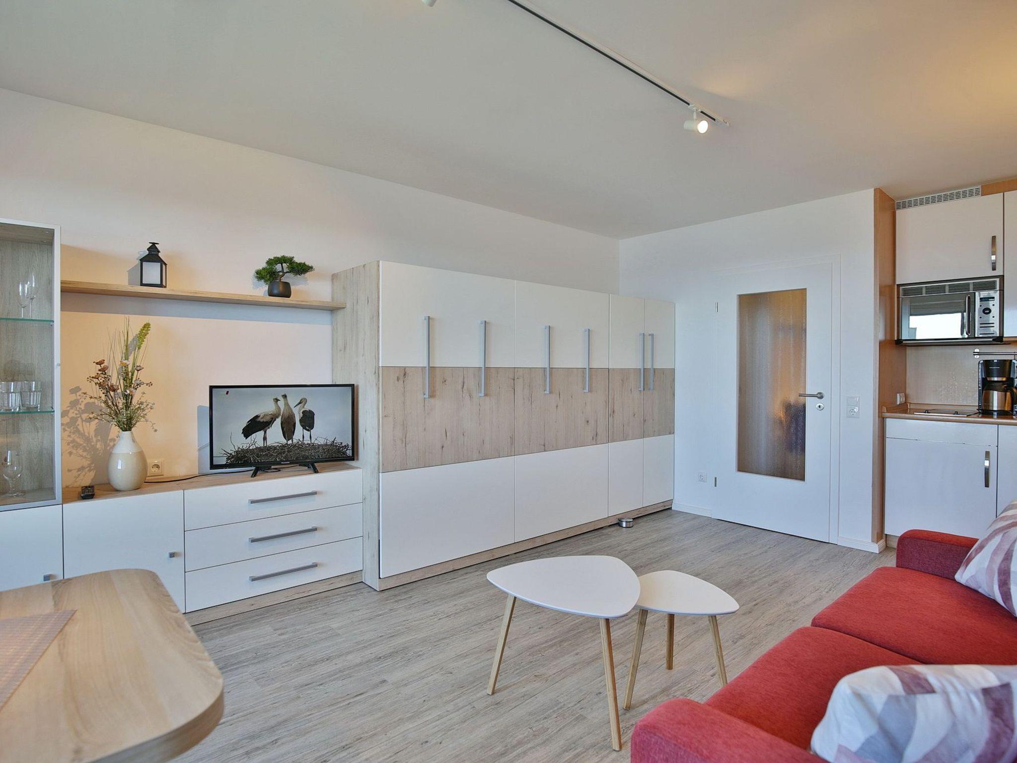 35 m² Ferienwohnung 616 im Haus Nautic ist ideal für eine Belegung mit 2 Personen. Im Wohnbereich ist eine kleine Küche mit Geschirrspüler und Mikrowelle integriert. Die hochwertigen Schrankbetten im kombinierten Wohn- und Schlafbereich lassen sich getrennt nutzen. Ein Einzelbett im Vorraum ermöglicht getrenntes Schlafen. Ferienwohnung Nautic 616 ist mit elektrischen Außenjalousien ausgestattet, sodass Sie nicht von der Morgensonne geweckt werden. Ein LCD-Fernseher gewährleistet, dass Sie im Urlaub nicht auf Ihre Lieblingsserie oder die Sportschau verzichten müssen. Dank kostenlosem W-LAN können Sie Urlaubserlebnisse direkt mit Freunden teilen.