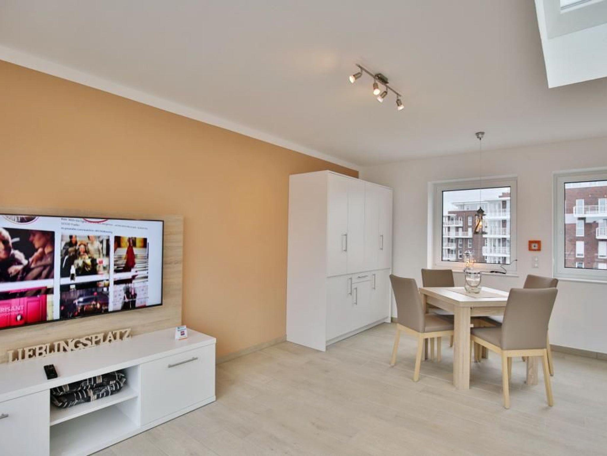Modernster Neubau für bis zu 6 Pers. auf 4 Etagen mit höchstem Komfort. 2 Wohnzimmer, 3xBalkon/Terrasse, 3 Schlafzimmer mit Doppelbetten, 5 x LCD-TV bis 65, Bluray 4K-Player, alle Fenster mit elektrischen Außenrollläden, Fußbodenheizung, W-LAN, offene Küchenzeile (Backofen, Geschirrspüler, Nespresso Maschine etc.), große Terrasse (west) mit Blick in die Marina, Gäste/WC. 1. Etage: Großes Schlafzimmer mit Doppelbett mit TV, Du/WC mit Waschmaschine/Trockner [&] 1 Balkon (ost). 2. Etage: Zwei Schlafzimmer (Doppelbetten) [&] TV, Badewanne/Dusche/WC. 3. Etage: Lounge mit großer Dachterrasse (west), TV und kleiner Küchenzeile [&] Nespressomaschine. Fahrradschuppen (eBike Lademöglichkeit), 1 PKW-Stellplatz am Haus.
