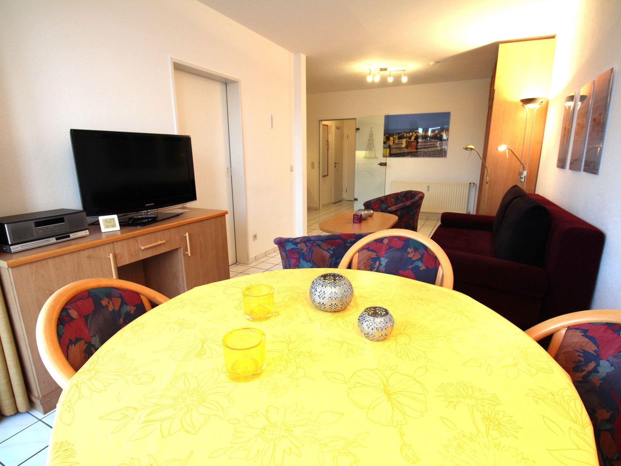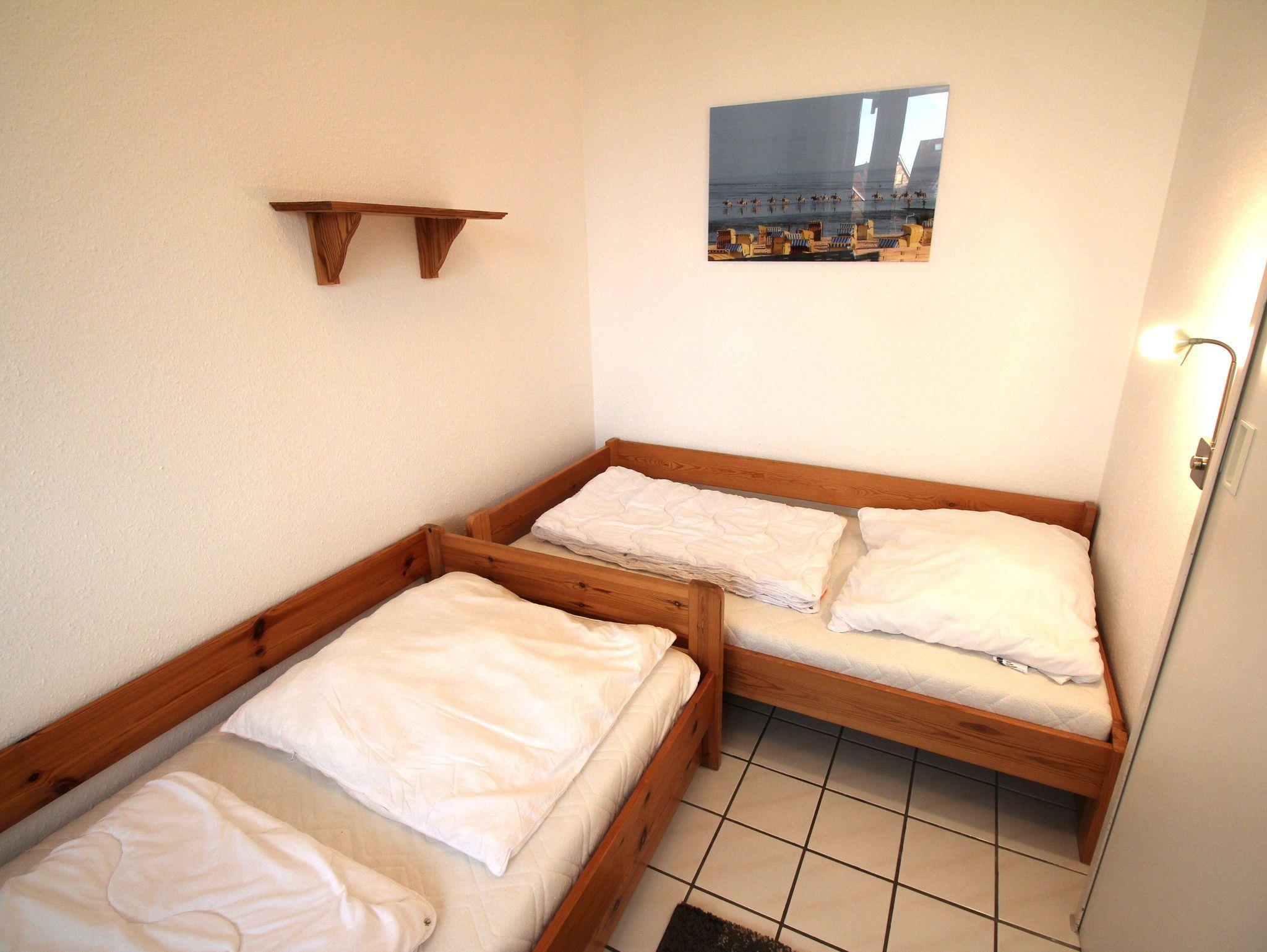 Sie wohnen in einem 2-Zimmer-Appartement für bis zu 2 Personen, ca. 40 m². EIn Schlafzimmer mit zwei Einzelbetten. Ein Bett hat eine Länge von 180 cm. Der Wohnraum ist mit einer bequemen Schlafcouch ausgestattet, separater Essplatz, voll ausgestatteter Küchenbereich, Diele mit Garderobe, Dusche/WC, Terrasse, SAT-LCD-TV und Telefon.