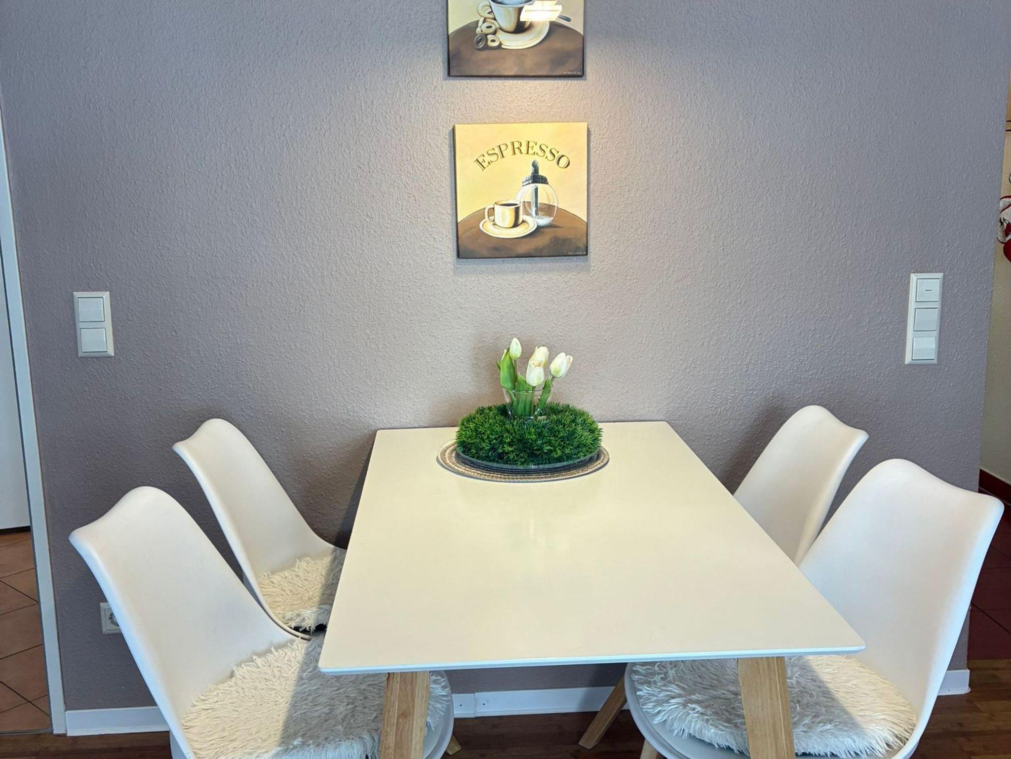 - großer Esstisch mit vier bequemen Freischwinger Stühlen.
