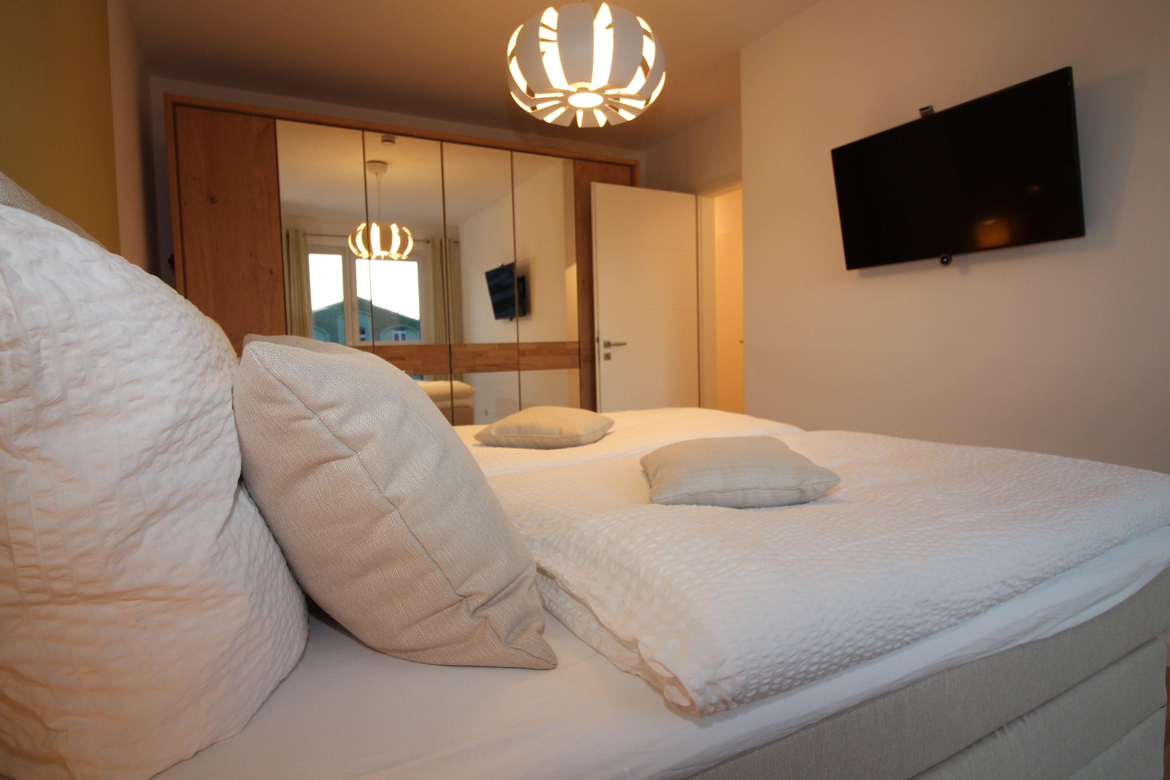 Neubauwohnung an der City-Marina für 4 Personen auf ca. 69 qm, tolle 3-Zimmer Luxus Ferienwohnung in der 1. Etage mit Lift, Fußbodenheizung und Lüftungsanlage, elektrisch verstellbare Boxspringbetten im Schlafzimmer I und hohes Einzelbett im Schlafzimmer II, 140cm breites hochwertiges Schlafsofa im Wohnbereich, voll ausgestattete Küche mit Mikrowelle + Spülmaschine.