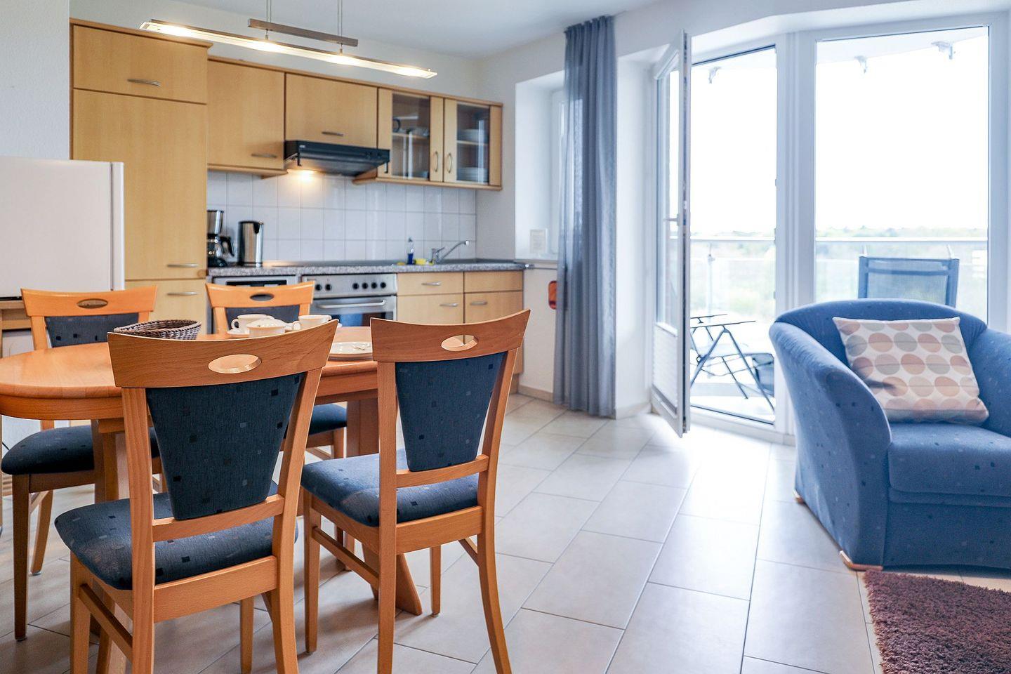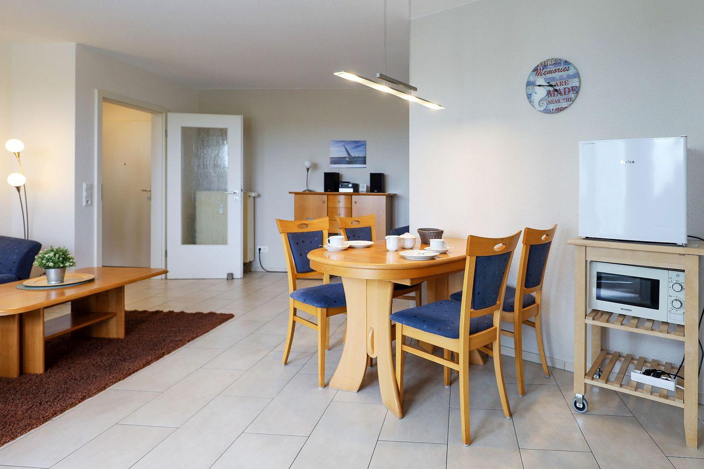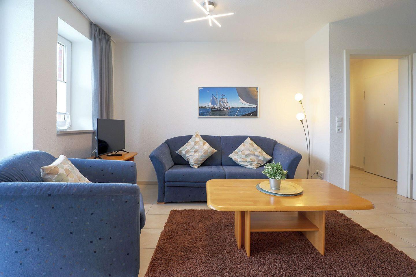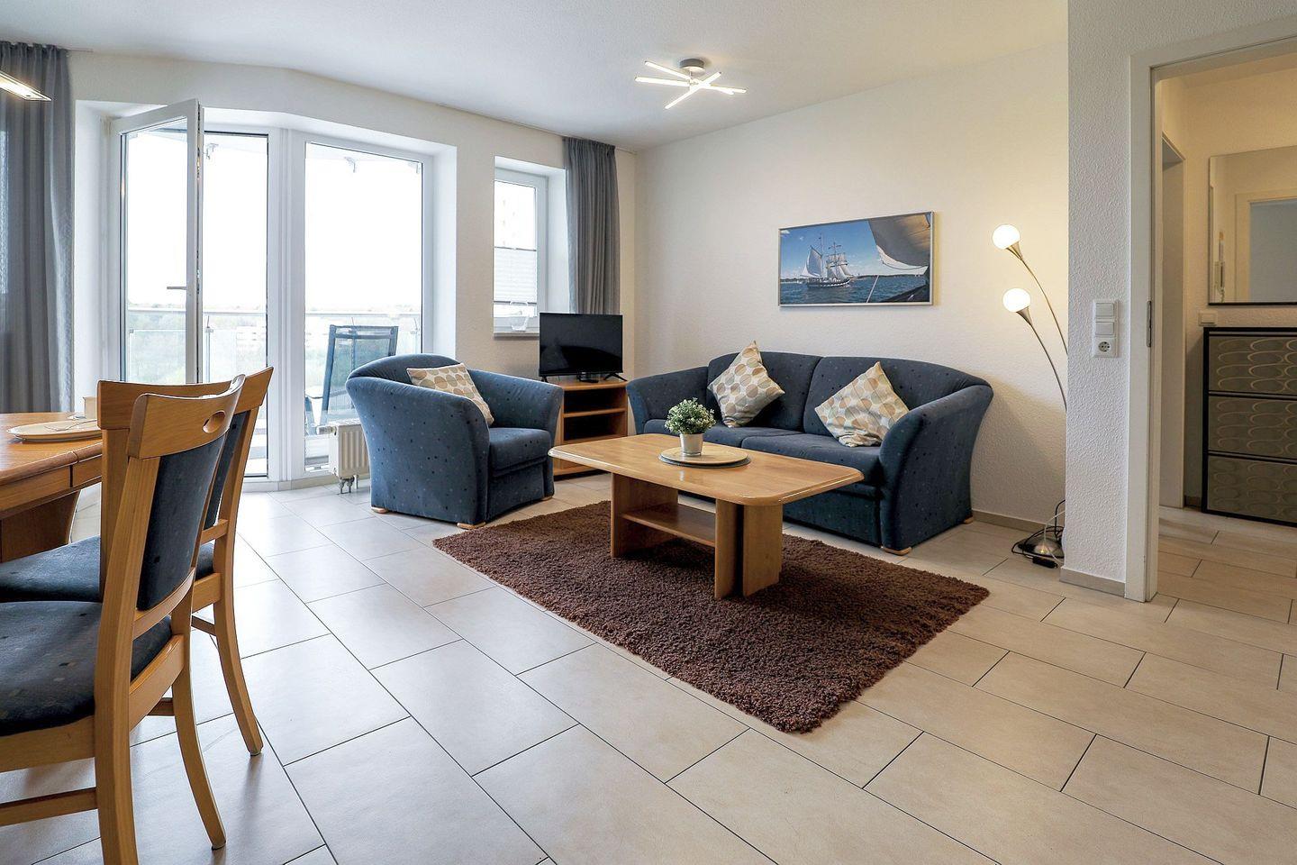 Die 48 m² große Wohnung bietet ein separates Schlafzimmer mit Doppelbett sowie einen gemütlichen Wohnbereich mit Schlafsofa. Die Küchenzeile ist praktisch ausgestattet, und das neue moderne Bad mit Dusche/WC sorgt für einen angenehmen Start in den Tag. Auf dem überdachten Südbalkon lässt sich die frische Nordseeluft in Ruhe genießen.