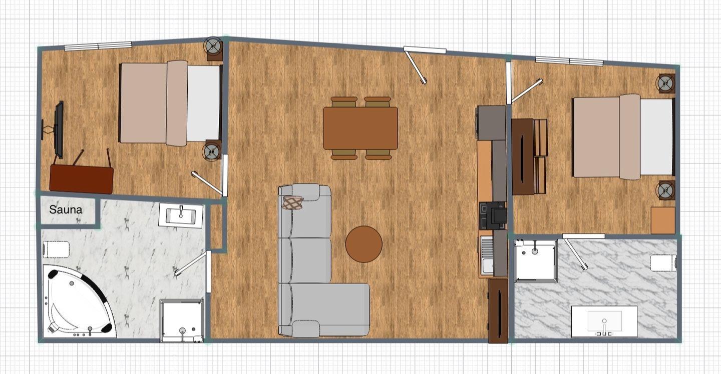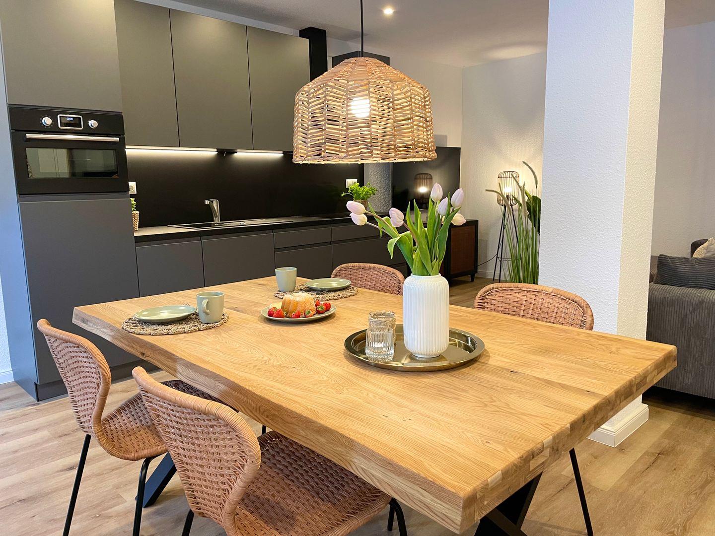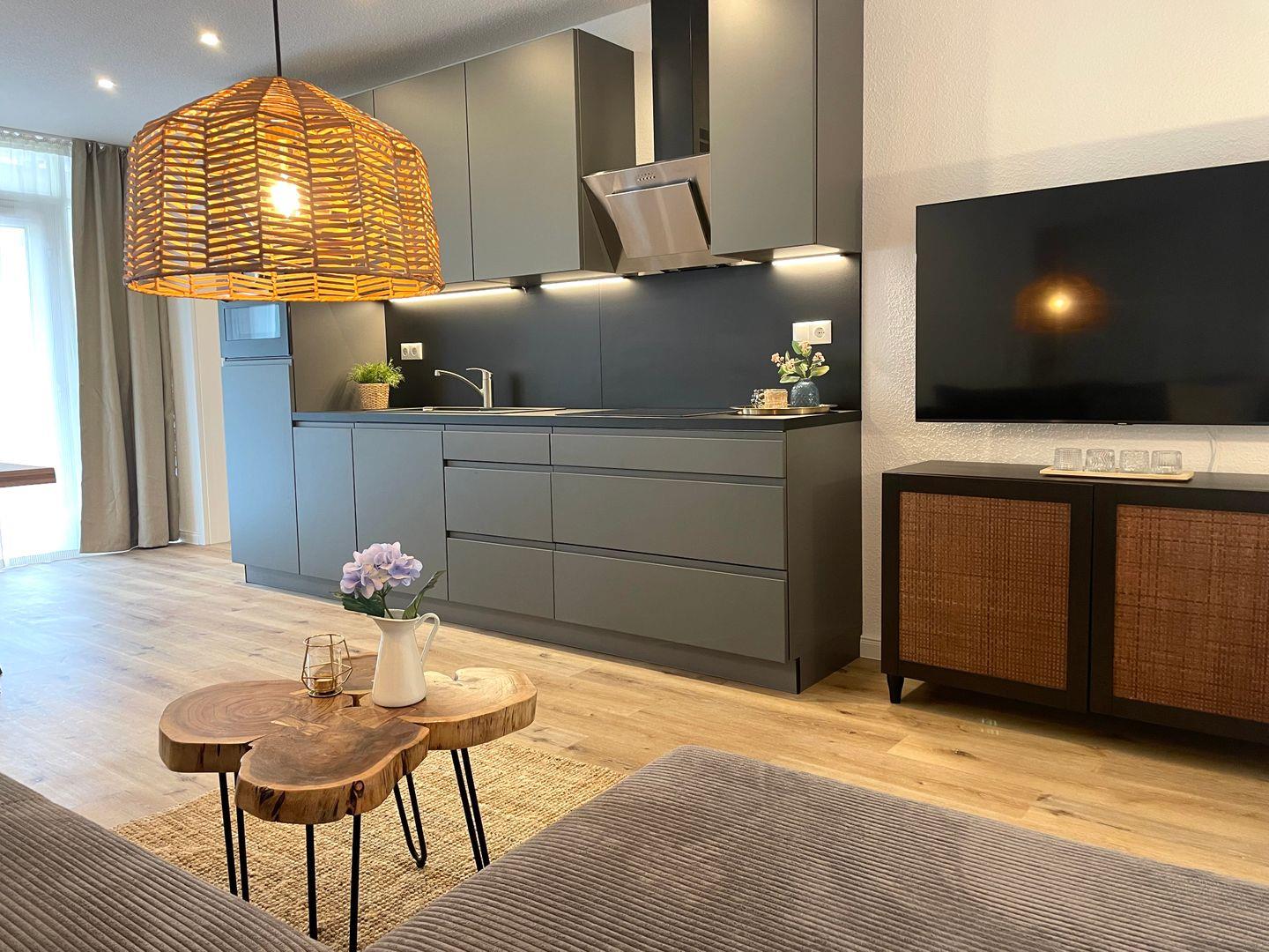 Die stilvoll eingerichtete Wohnung verfügt über zwei gemütliche Schlafzimmer, die mit hochwertigen Betten ausgestattet sind und für erholsame Nächte sorgen. Das gemütliche Schlafsofa im Wohnzimmer lädt zum Entspannen ein – vielleicht mit einem guten Buch oder einem gemütlichen Filmabend, denn die Wohnung ist mit drei Fernsehern und WLAN ausgestattet. Für gesellige Abendessen steht Ihnen ein Essbereich zur Verfügung, der nahtlos in die offene, voll ausgestattete Küche übergeht. Diese bietet alles, was Sie für die Zubereitung Ihrer Lieblingsgerichte benötigen: von einem Herd über eine Spülmaschine bis hin zu Mikrowelle und Kaffeemaschine.