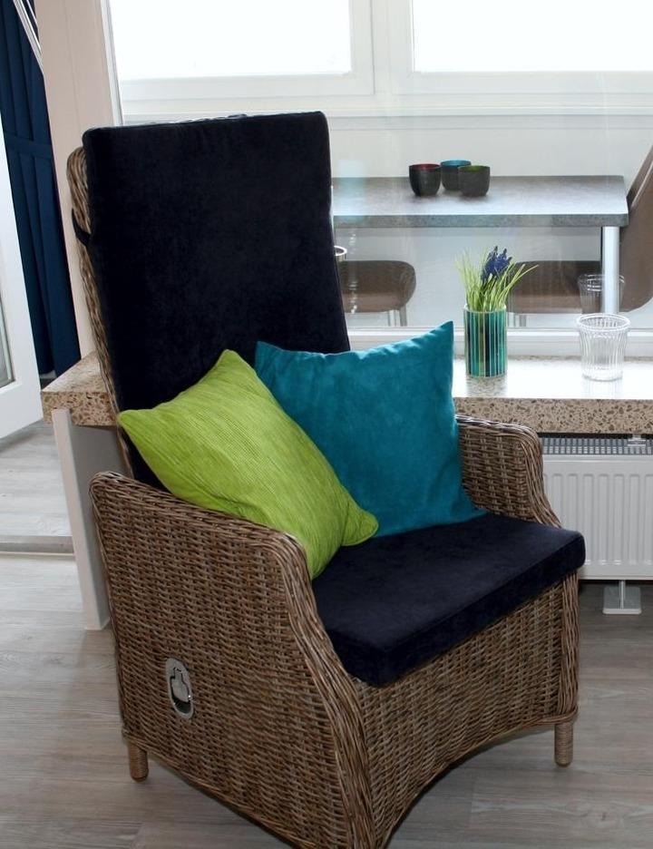 Die gemütliche Ferienwohnung kombiniert Wohn- und Schlafbereich in einem offenen Raum. Das Doppelbett lässt sich in Sekundenschnelle ein- und ausklappen auch als Einzelbett. Vom Sofa und besonders von der Loggia aus können Sie das maritime Treiben beobachten – bei jedem Wetter. Die Loggia bietet eine kleine "Chill-Ecke" mit Meerblick, ideal für Kaffee, Tee oder einen Sundowner.