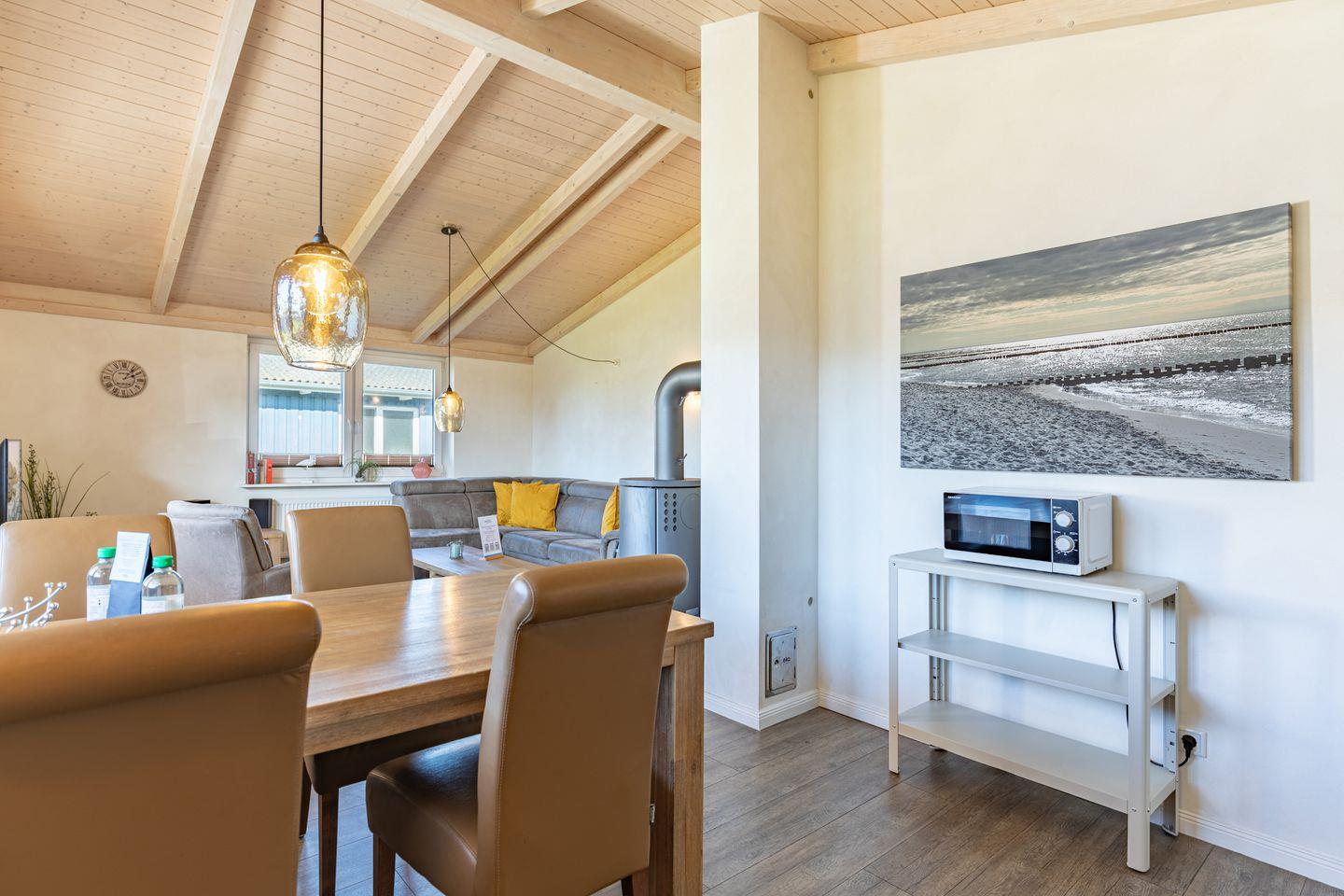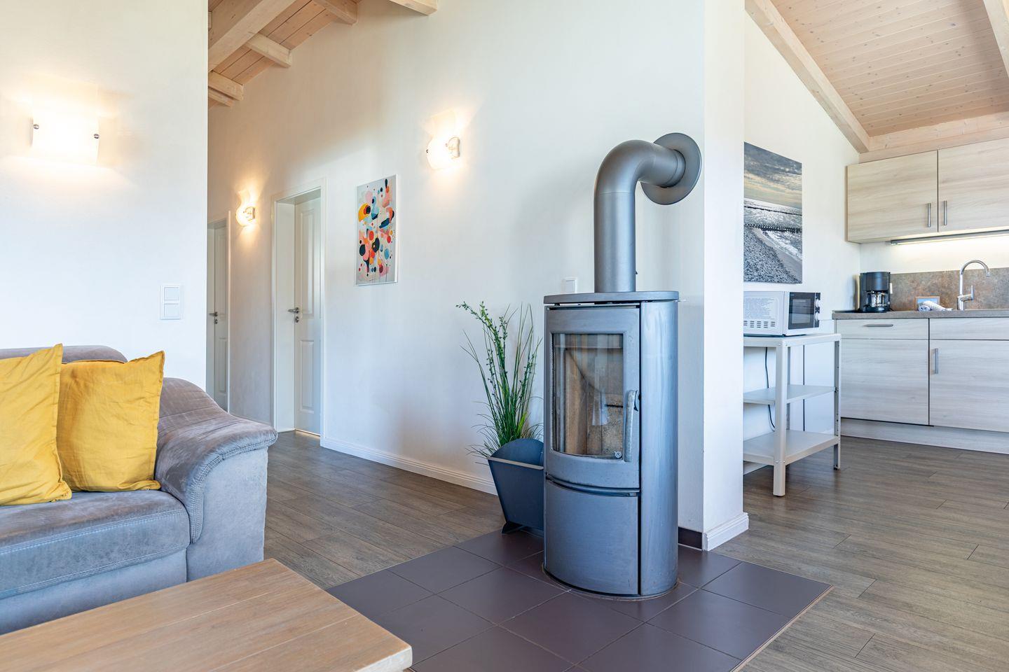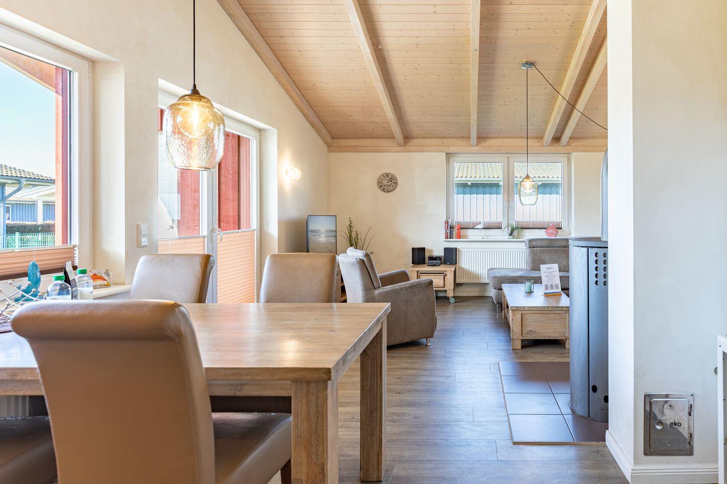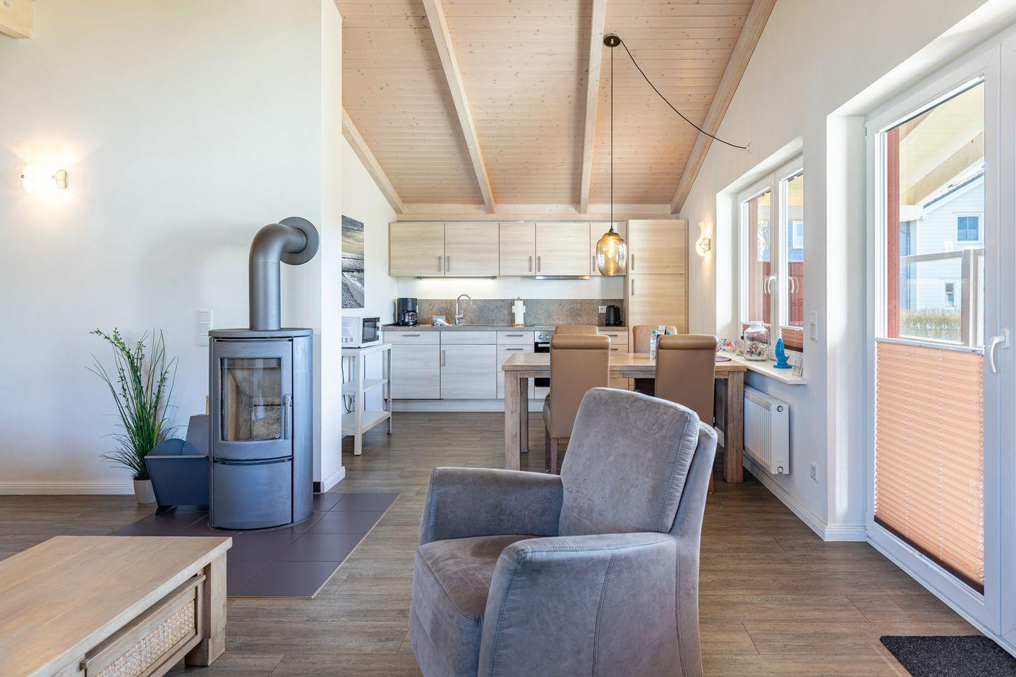 Das 85 qm große Ferienhaus ist modern und exklusiv im skandinavischen Charme eingerichtet. Die zwei Schlafzimmer mit jeweils einen Komfort-Doppelbett (180 x 200 cm) bieten Platz für bis zu vier Personen. Das gemütliche Wohnzimmer ist mit einem Smart-TV ausgestattet. Der Kaminofen sorgt auch in der kälteren Jahreszeit für behagliche Stunden. Die offene Küche bietet Ihnen eine exklusive und umfangreiche Ausstattung, die das Herz eines jeden Hobbykochs höher schlagen lässt: Ceranfeld mit 4 Kochplatten, Backofen, Kühlschrank mit ***Gefrierfach, Mikrowelle, Geschirrspüler, Filterkaffeemaschine uvm. Das Badezimmer lässt keine Wünsche offen: zwei Waschbecken, eine große Badewanne, eine ebenerdige Dusche und eine schöne Sauna geben Ihrem Urlaub den richtigen Rahmen. Das Ferienhaus verfügt über ein zusätzliches WC.Auf der überdachten, windgeschützten Terrasse können Sie auf bequemen Gartenstühlen, den Sonnenliegen oder im Strandkorb die Sonne genießen.