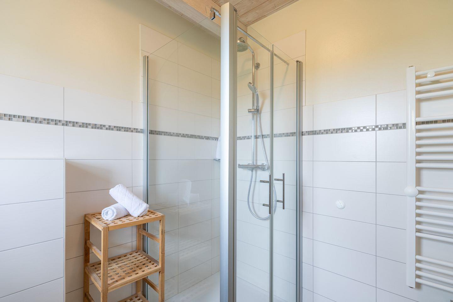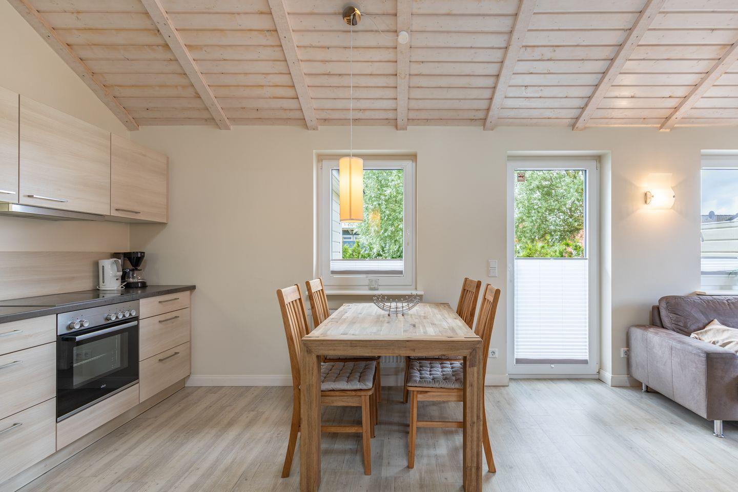 Die offene Küche bietet eine hochwertige und umfangreiche Ausstattung, die das Herz eines jeden Hobbykochs höherschlagen lässt. Sie verfügt über ein Cerankochfeld mit vier Platten, einen Backofen, einen Kühlschrank mit ***Gefrierfach, eine Mikrowelle, einen Geschirrspüler, eine Filterkaffeemaschine sowie viele weitere praktische Küchenutensilien. Das moderne Duschbad mit Fußbodenheizung rundet das stilvolle Gesamtbild des Hauses ab.