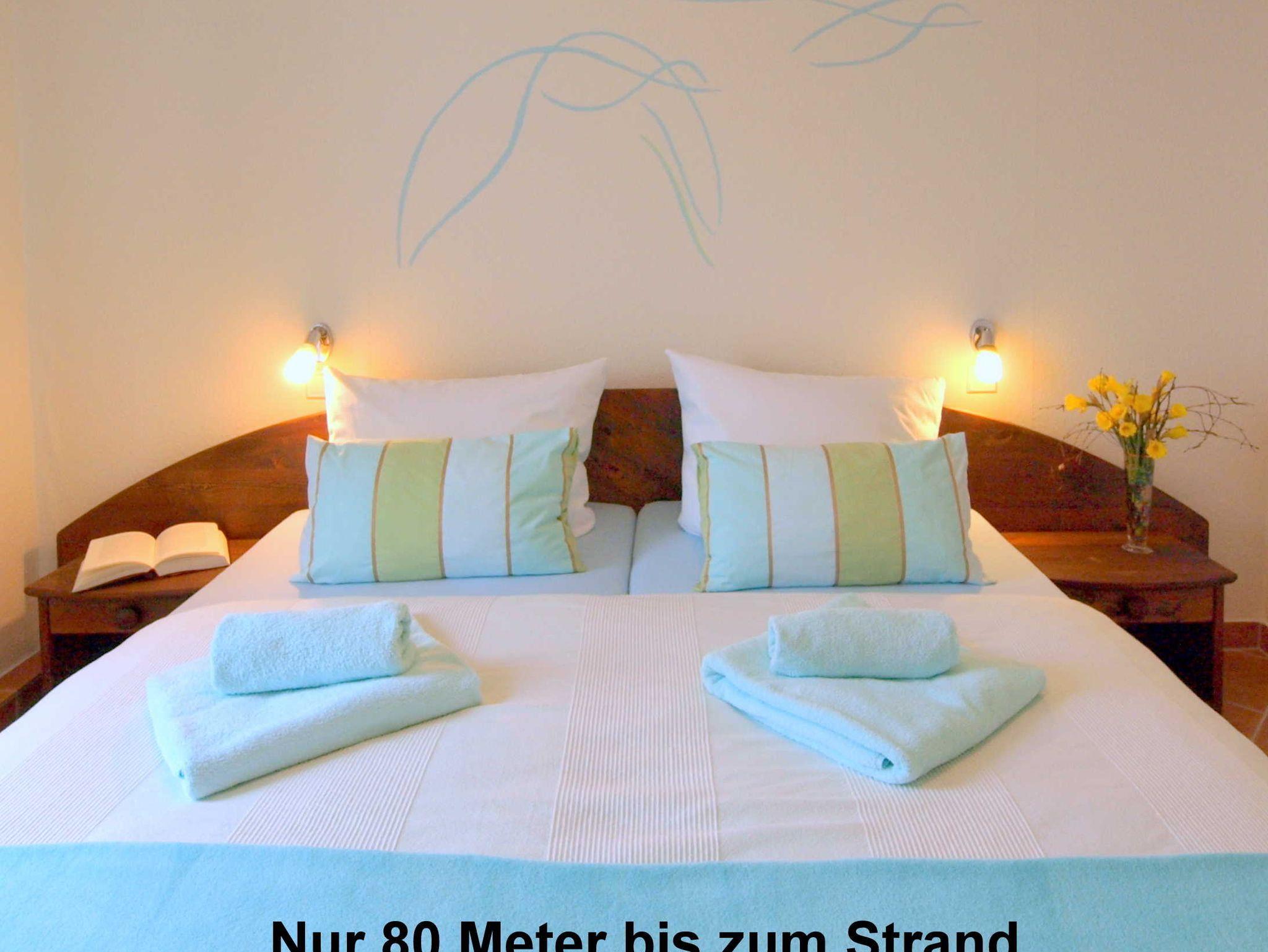 80 Meter Strandentfernung - Ferienwohnung ca. 45 qm im 1. OG mit Balkon und MEERBLICK für max. 3 Erwachsene. 1 Schlafzimmer mit TV, 1 Wohn mit Blue Ray/DVD Player und 1 Schrankbett (100 x 200 cm), gemütlicher Couch und Essecke. Separate Küche mit Spülmaschine, Backofen, Kühlschrank mit Gefrierfach und vollständig ausgestattet. Großes tageslicht Duschbad, 1 kostenloser PKW-Stellplatz auf dem Grundstück. E-Bike Stellplatz. Nichtraucher. Keine Haustiere erlaubt. WLAN kostenlos.