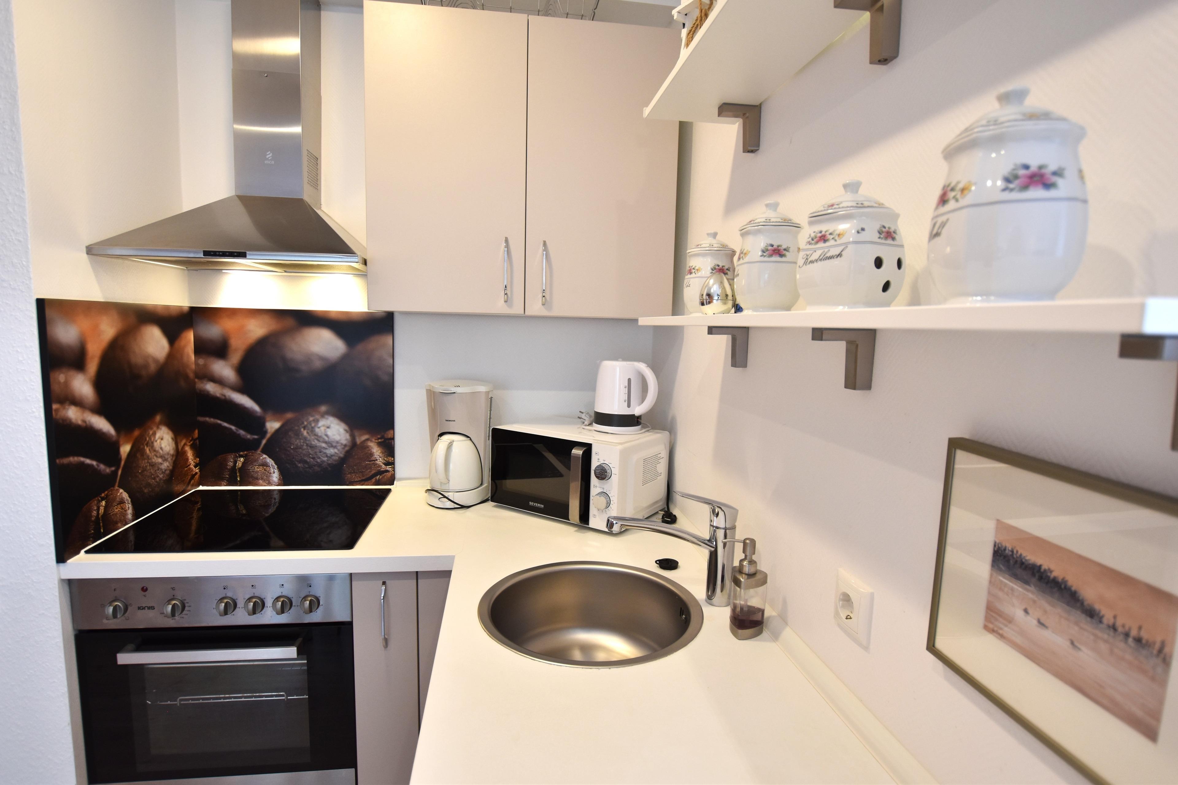 Flur mit Garderobe, Schlafzimmer mit einem Doppelbett (2x90x190) & TV, ein Duschbad mit Toilette, Waschtisch und Spiegel, ein Wohn-/Esszimmer mit einem Ethanolkamin mit Brennpaste-Gel (muss mitgebracht werden), Esstisch, TV und einem Sofa, einem Schrankbett (100x200) und der direkte Zugang zum bestuhltem Balkon. Eine offene Küche mit Backofen, Wasserkocher, Kaffeemaschine uvm.