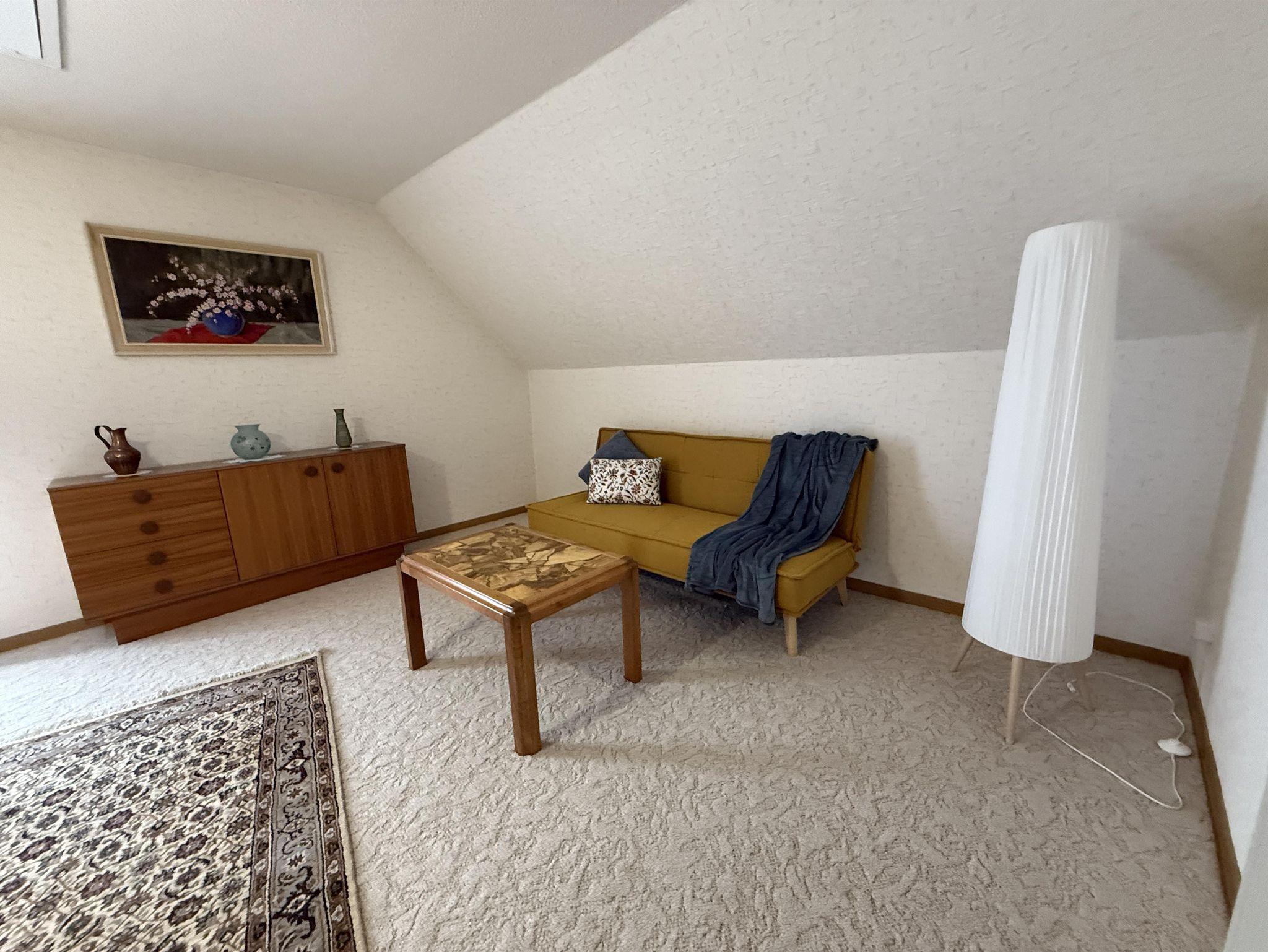 Über eine Treppe erreichen Sie das Obergeschoß. Hier finden Sie ein weiteres Schlafzimmer mit 2 Einzelbetten sowie ein Durchgangszimmer, welches auch als Spielzimmer für Kinder genutzt werden kann. Hier steht eine Schlafcouch für eine 5 Person zur Verfügung (auf Anfrage).