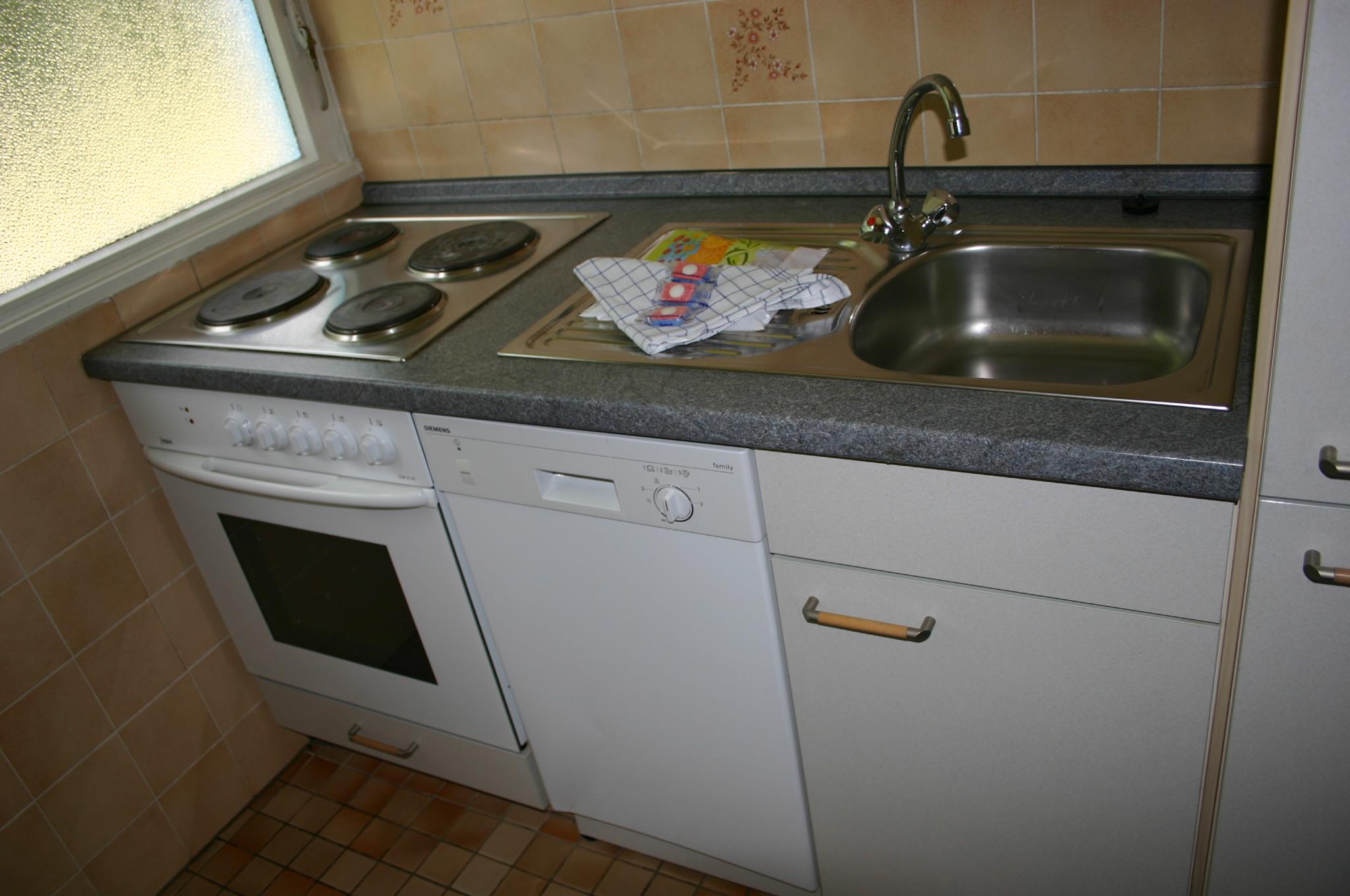 · Küche mit Kühlschrank, Herd, Backofen, Mikrowelle, Geschirrspüler und Kaffeemaschine