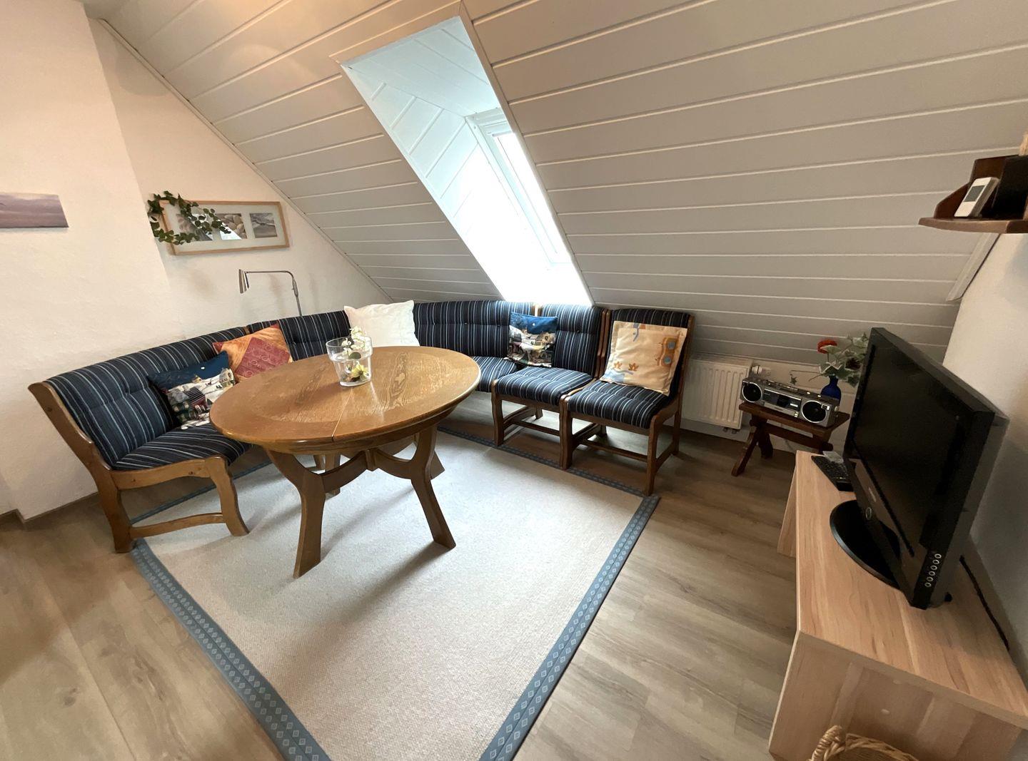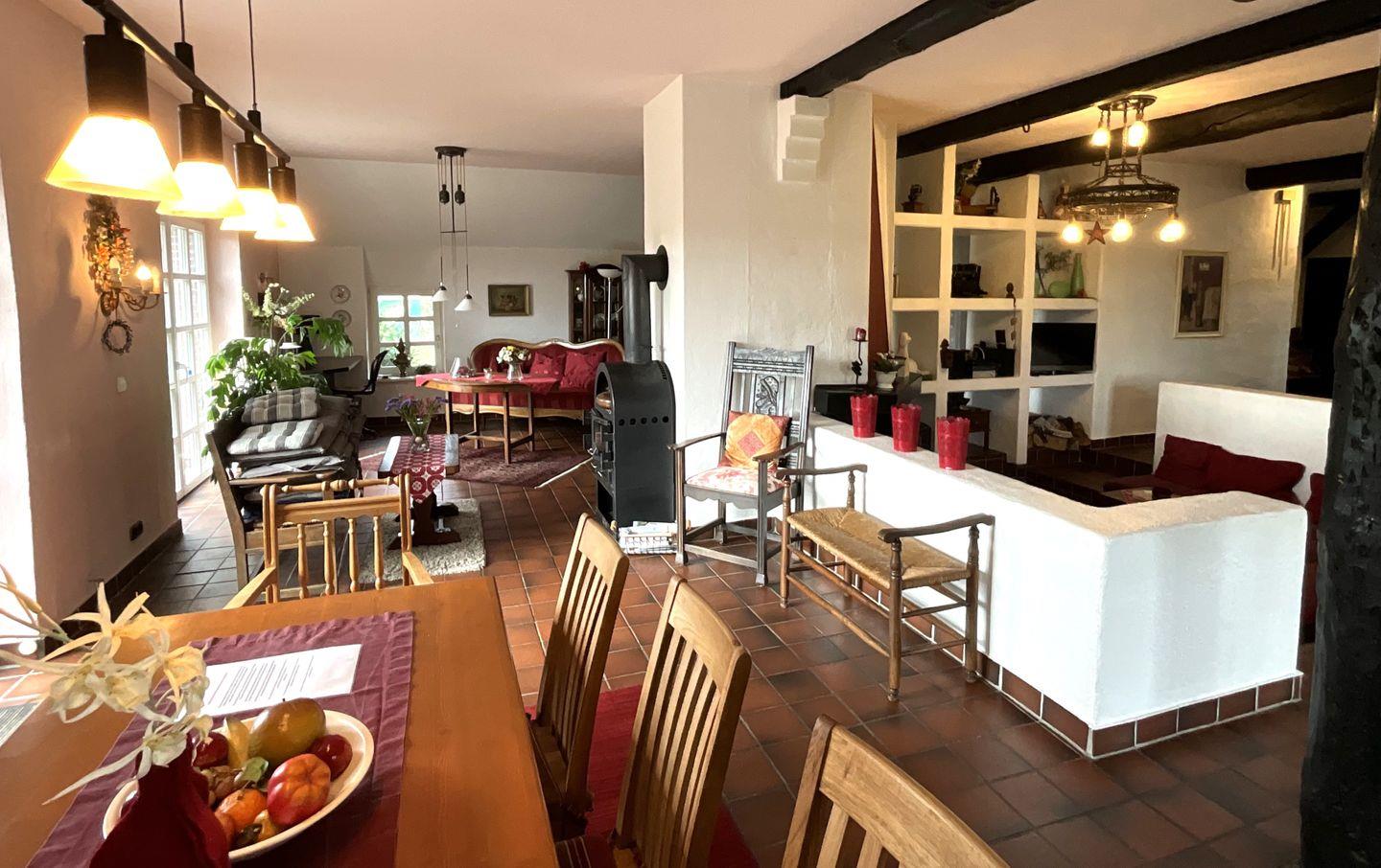 Der Wohnbereich ist auf entspanntes Verweilen ausgelegt: die zentrale Kaminecke bietet Platz für alle, ergänzt durch einen TV und HiFi-Anlage. Insgesamt stehen 2 TVs zur Verfügung. Ein Kaminofen sorgt zusätzlich für eine angenehme Atmosphäre. Der Essbereich mit Esstisch bietet ausreichend Platz für gemeinsame Mahlzeiten, verschiedene Sitzgruppen im Erdgeschoss sorgen für Gemütlichkeit.