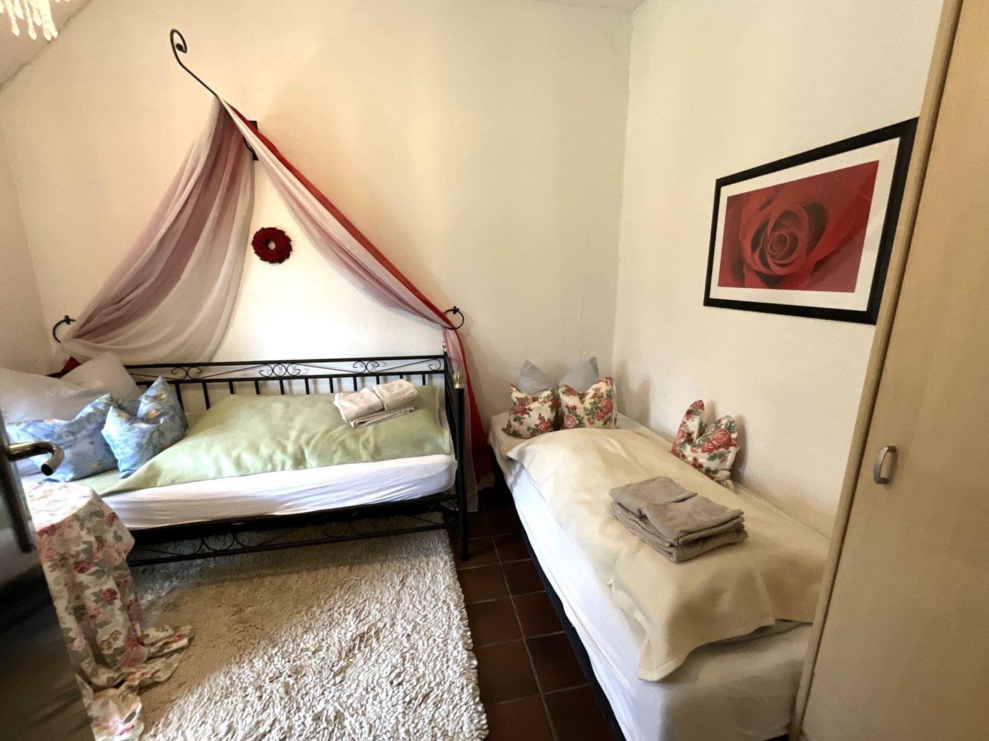 Schlafzimmer 3 (1. Etage): 2 Einzelbetten (Maße: 90 x 200 cm) , Leselampe, Kleiderschrank, Bettwäsche auf Anfrage