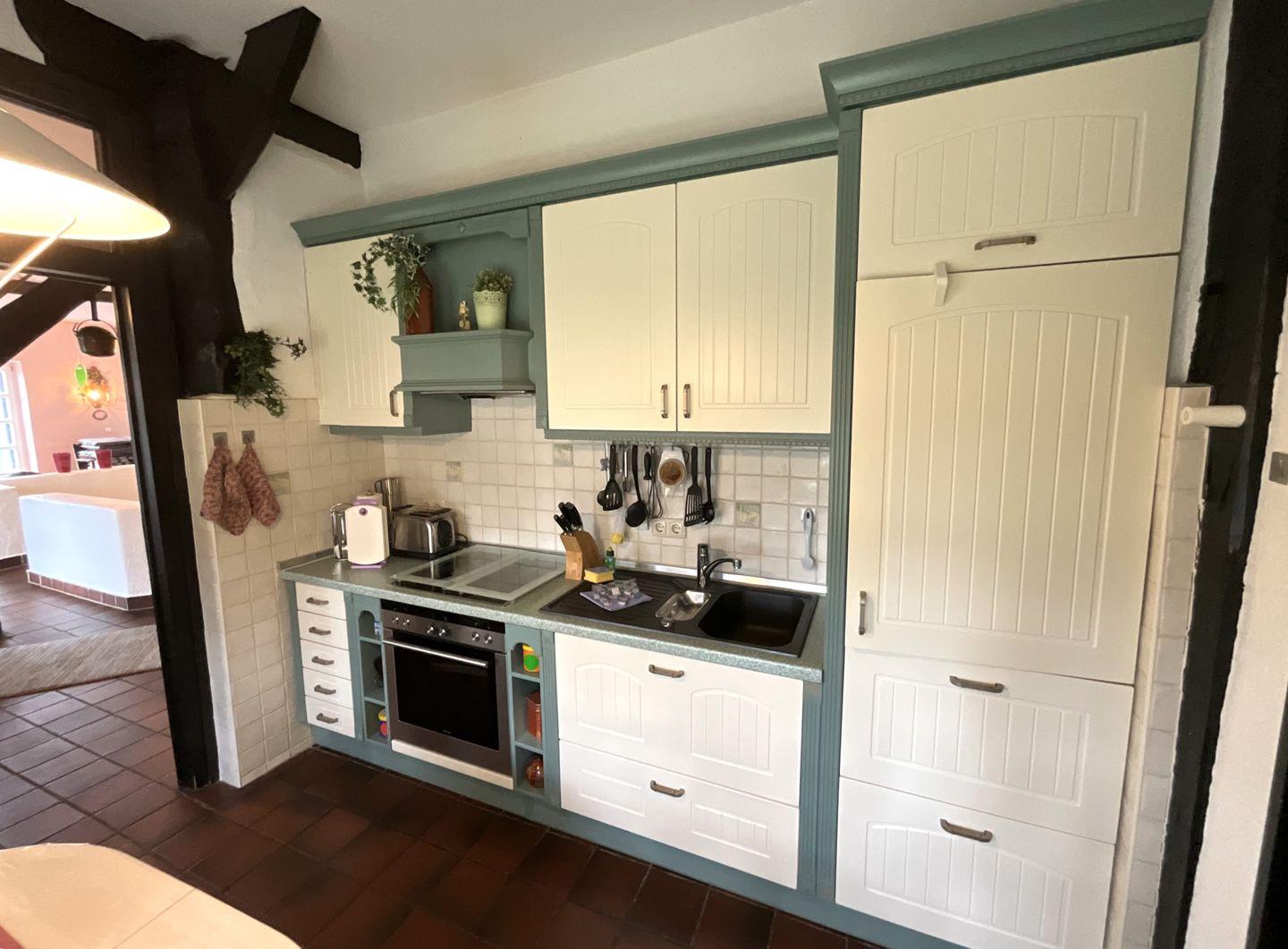 Küche und Haushalt: Einbauküche, Kühlschrank mit Gefrierfach, 4-Zonen Cerankochfeld, Backofen, Mikrowelle, Dunstabzugshaube, Geschirrspüler, Toaster, Wasserkocher, Kaffeefiltermaschine, hochwertiges Geschirr und Besteck