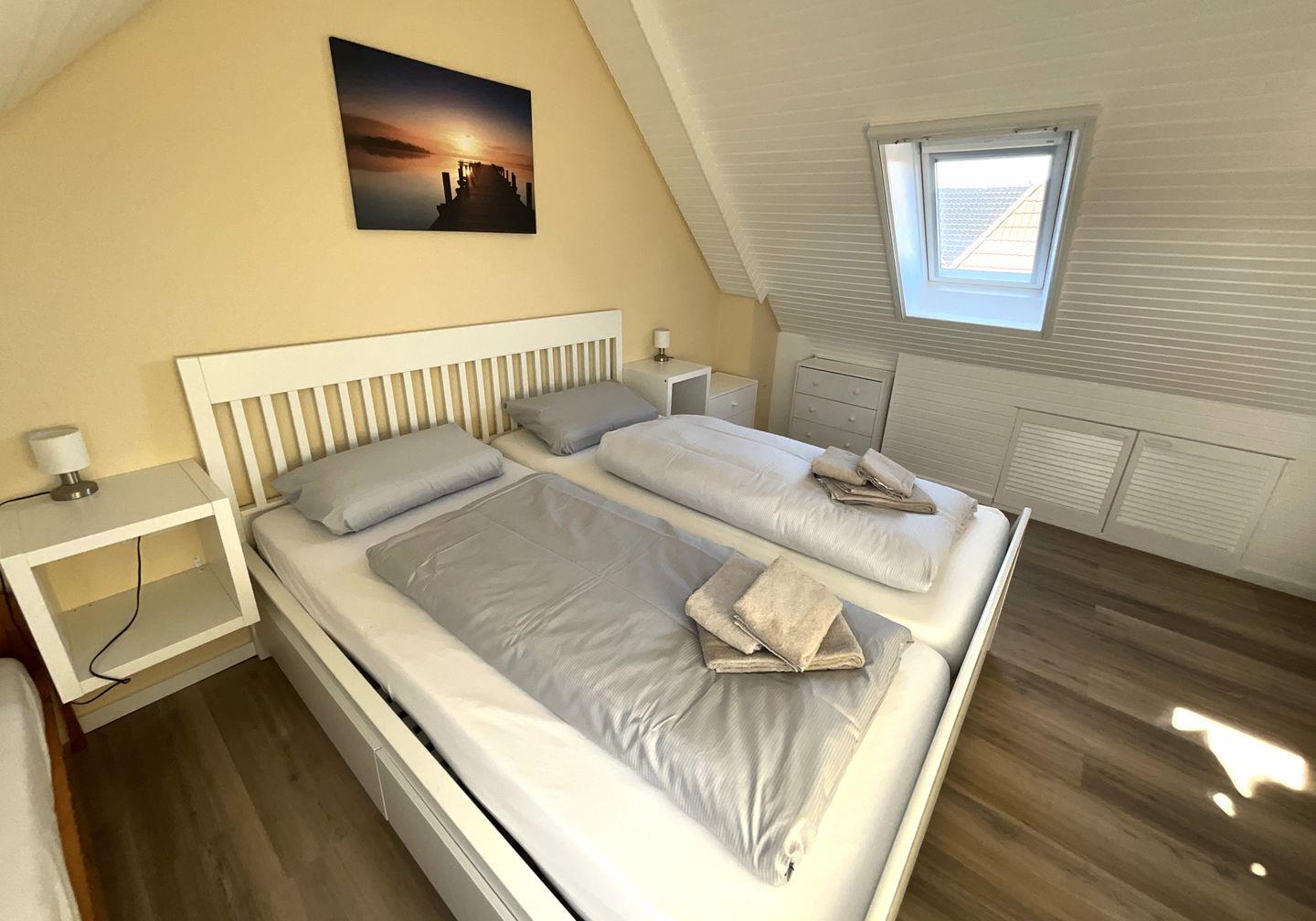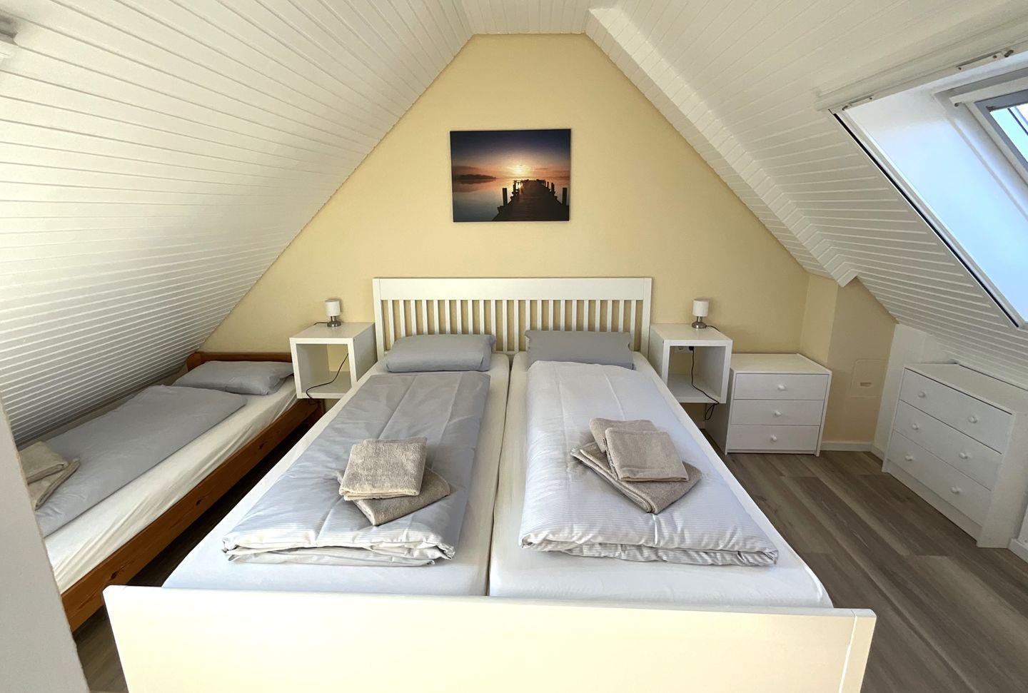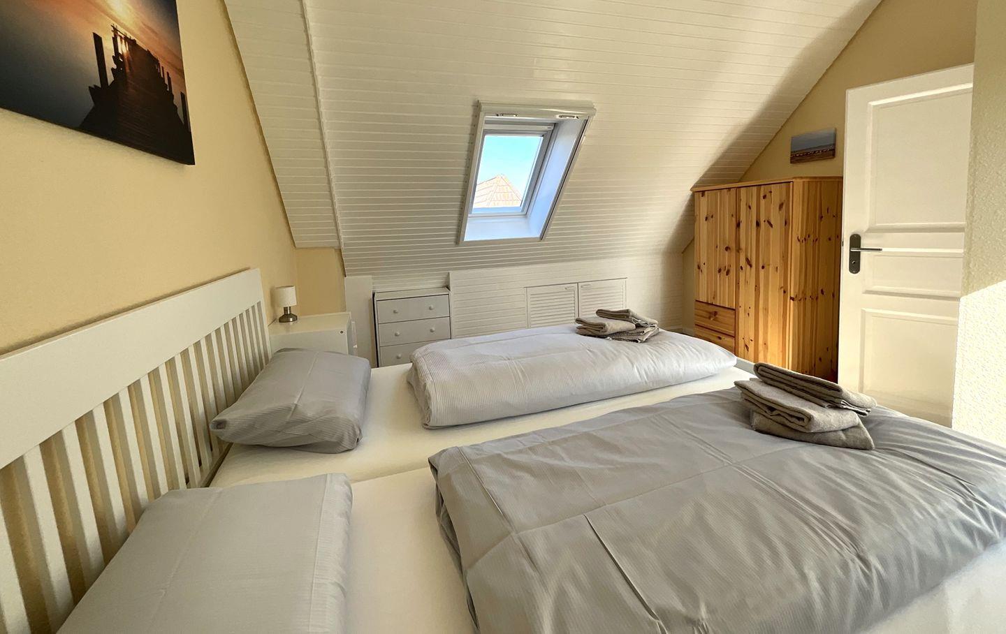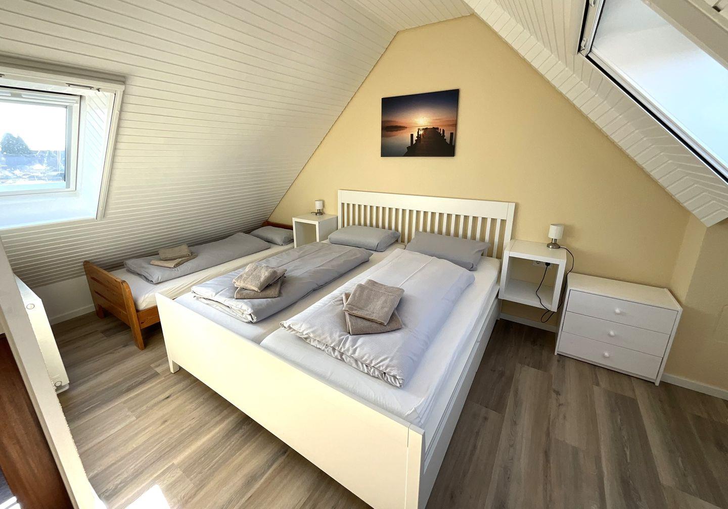 In das separate Schlafzimmer führt eine Treppe nach oben und es ist ausgestattet mit einem Kleiderschrank sowie ein Bett in der Größe von 180 x 200 cm sowie ein Einzelbett mit den Maßen 90x200 cm.