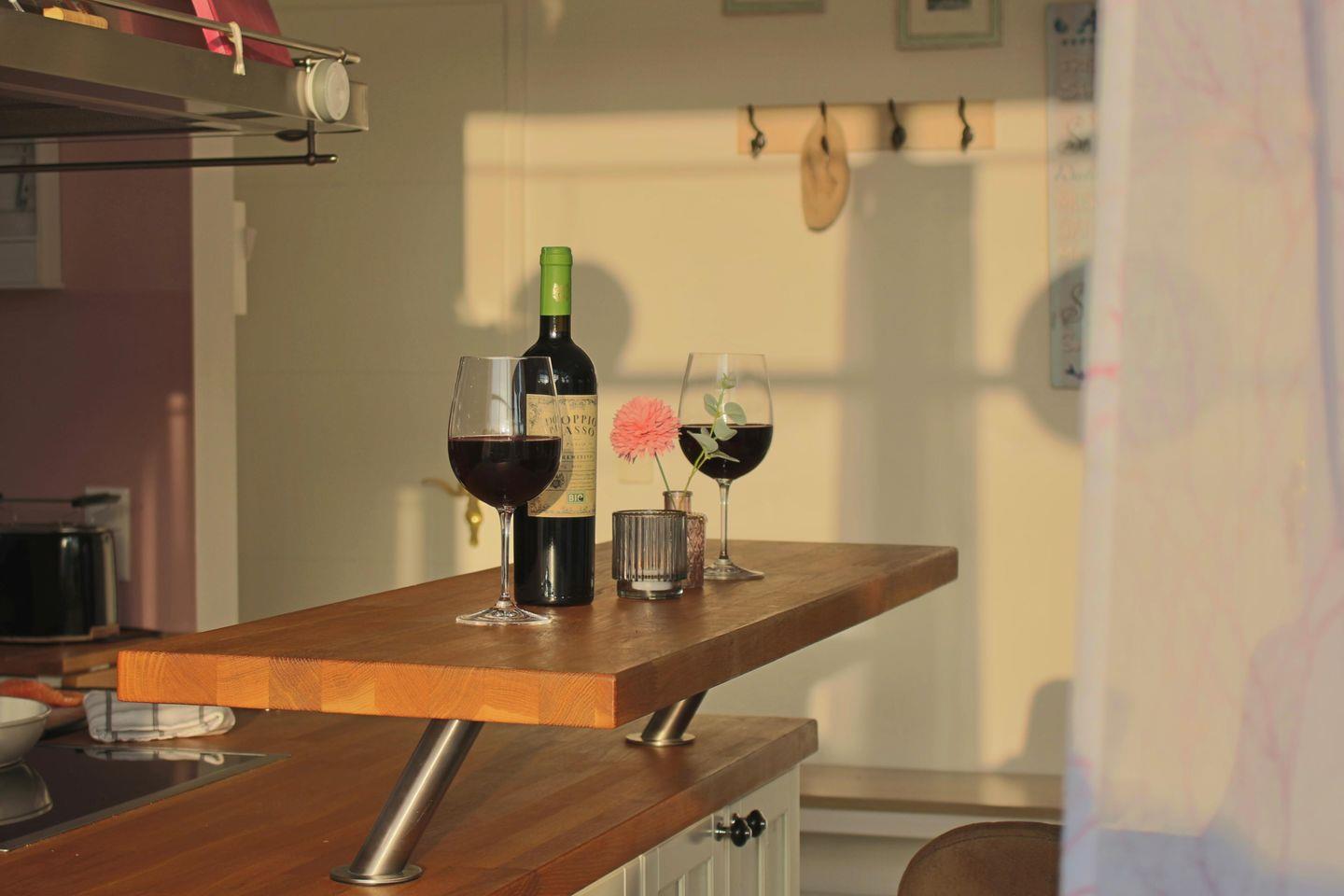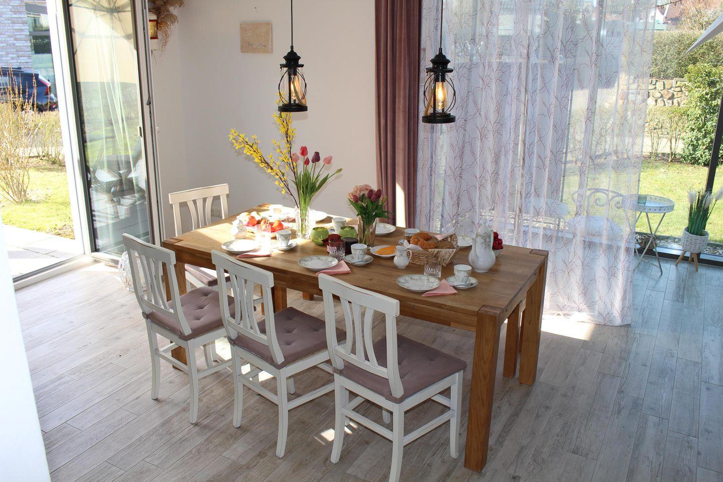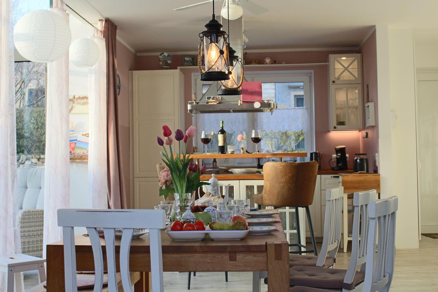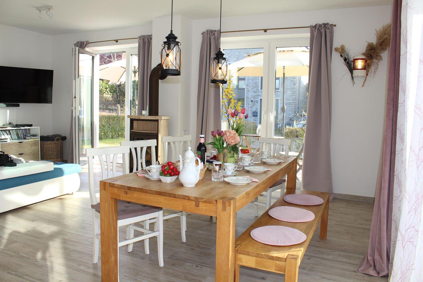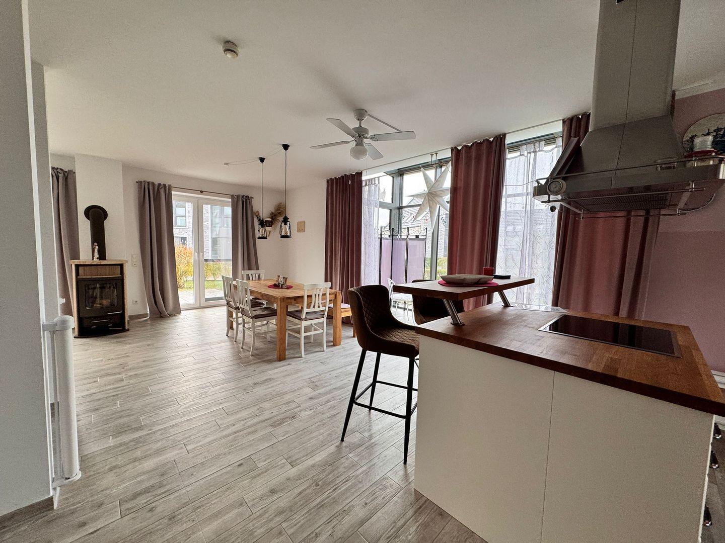 Im Erdgeschoss erwartet Sie eine offene Küche mit großzügigem Essbereich, ein großzügiger Wintergarten, ein Kamin für kuschelige Abende sowie ein großer Fernseher mit DVD-Player und umfangreicher DVD-Sammlung. Auch Gesellschaftsspiele stehen für entspannte Stunden bereit. Sollte sich doch noch ein schöner Sonnenuntergang zeigen, können Sie diesen gemütlich an der Küchentheke mit einem Glas Wein oder einem Jever genießen und haben einen wunderbaren Blick auf den Himmel aus dem Wintergarten.