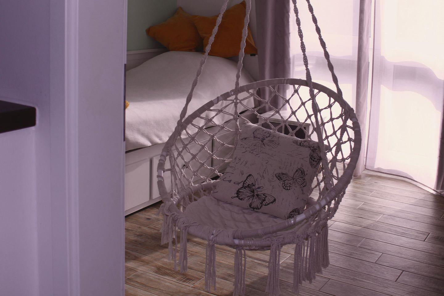 Im „Zimmer Südwind“, das in frischen Farben gehalten ist, lädt ein hängender Korbsessel zum Lesen und Abschalten ein. Kinder schaukeln hier erfahrungsgemäß besonders wild und gerne.