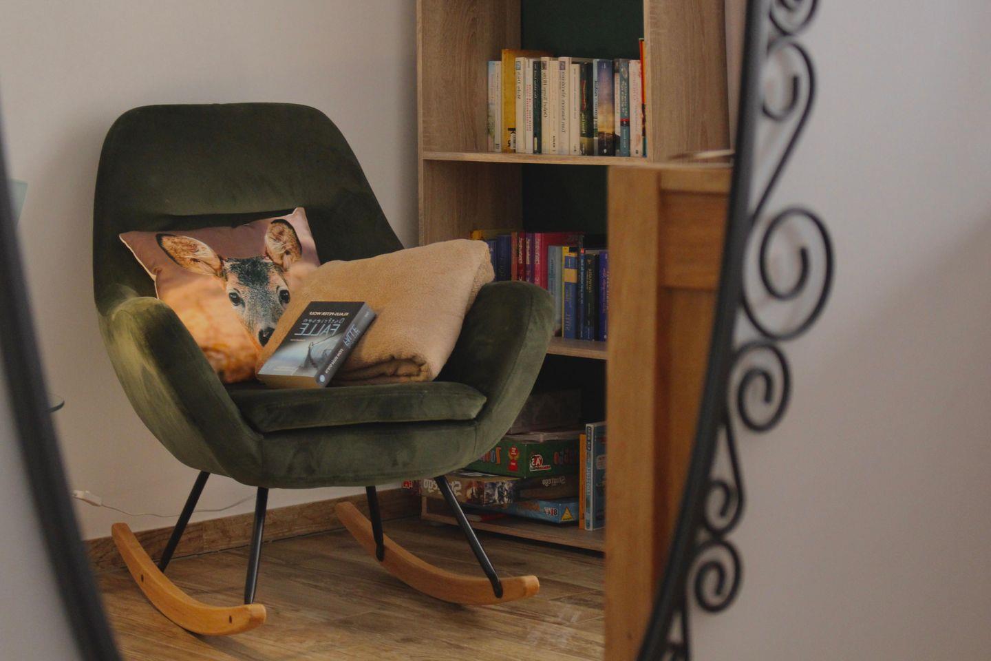 Das „Zimmer Waldruhe“ ist eine kleine stille Oase mit umfangreicher Buchsammlung und Schaukelstuhl – ideal zum Zurückziehen und Entspannen. Ein Fernseher ist ebenfalls vorhanden.