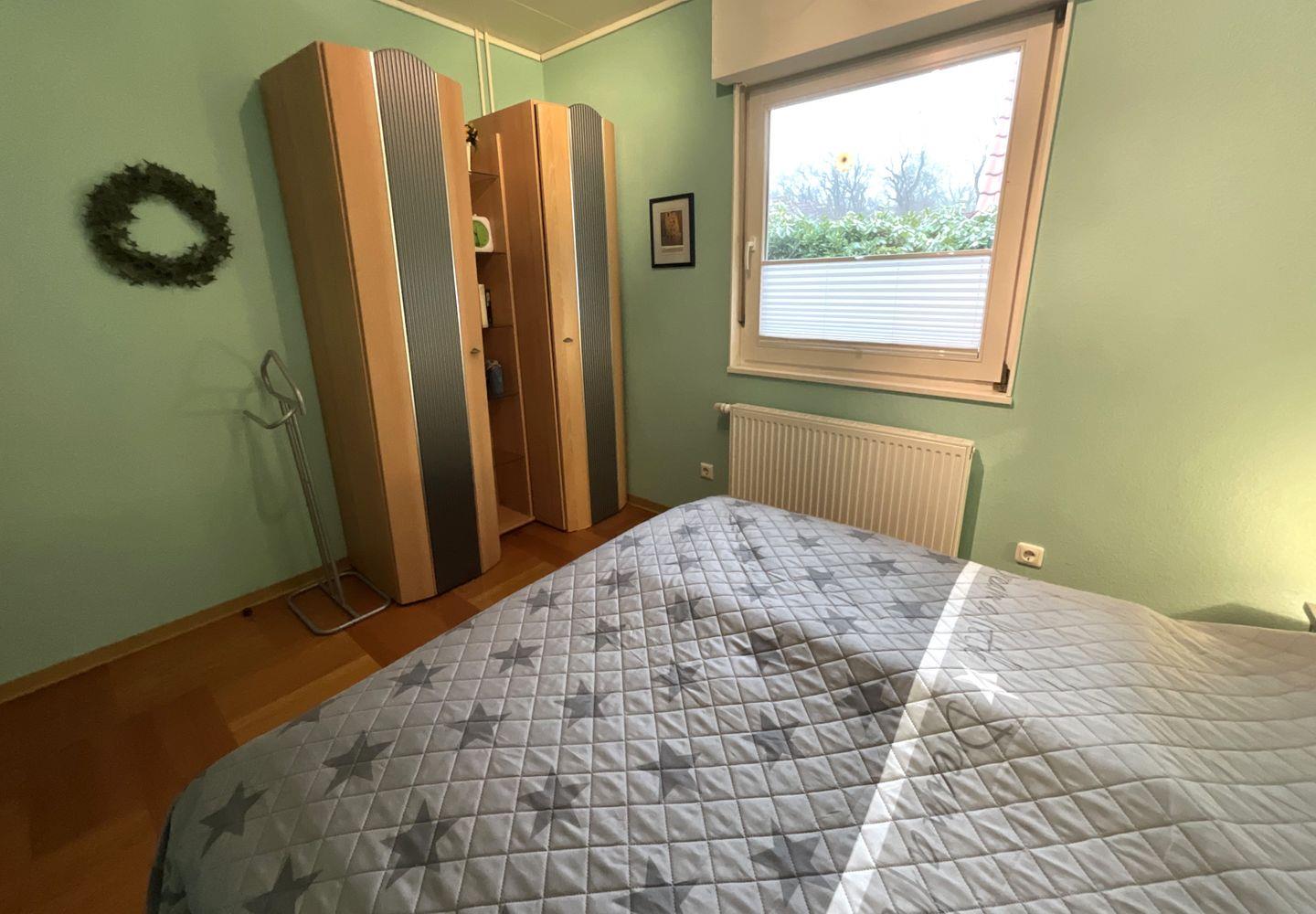 Schlafzimmer 2 (Erdgeschoss): Doppelbett (Maße: 160 x 200 cm) mit 2 einzelnen Matratzen 80x200 cm, Leselampe, Kleiderschrank, Rolläden, Bettwäsche auf Anfrage