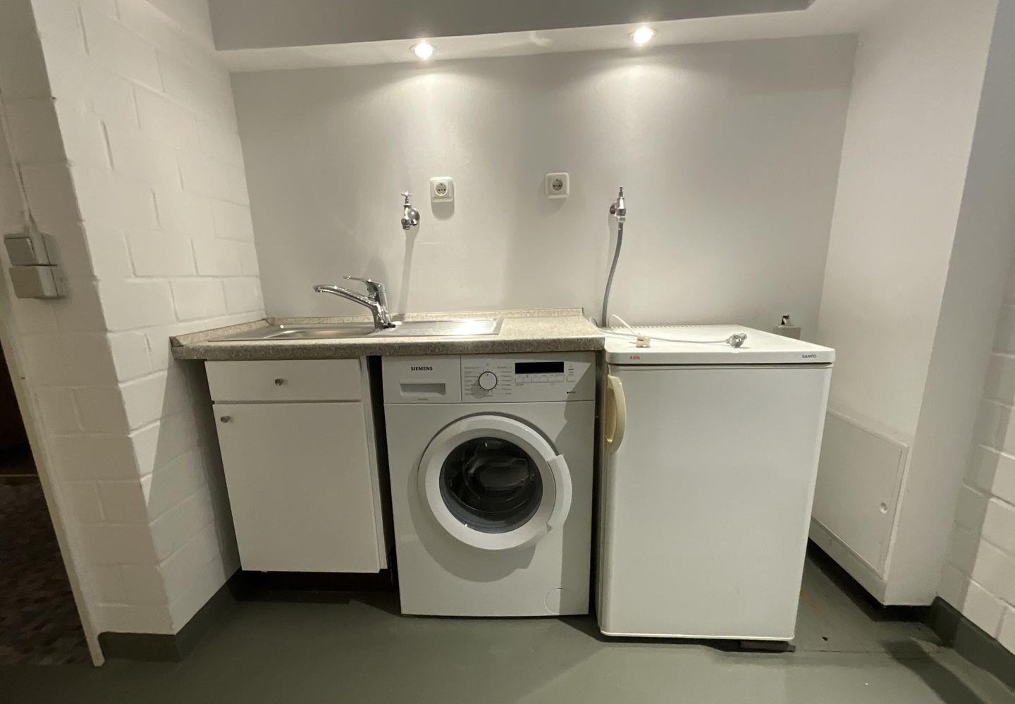 Abstellraum: Waschmaschine, Wischer, Eimer, Handfeger, Staubsauger, Wäscheständer