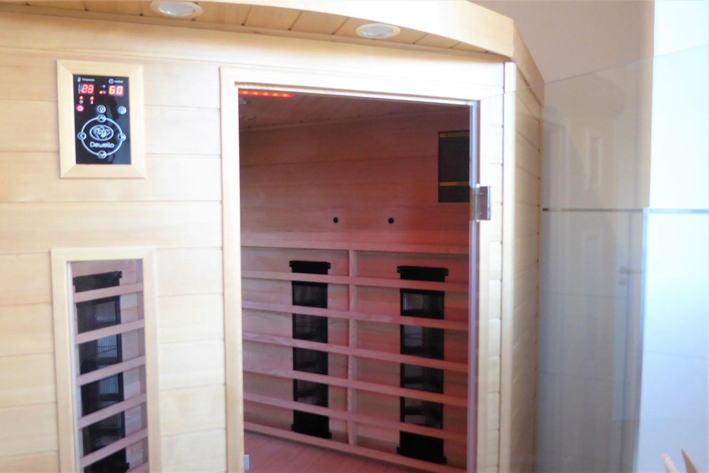 Im Obergeschoss empfängt Sie ein großzügiges Wellnessbad mit Infrarotkabine und Regendusche und lädt zur Entspannung ein. Die drei Schlafzimmer sind hell und freundlich eingerichtet und ermöglichen erholsame Nächte.