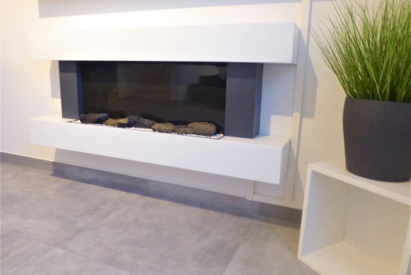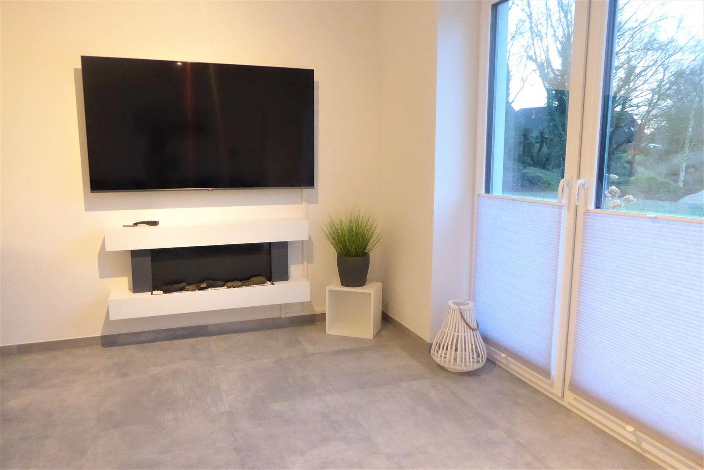 Wohn-Esszimmer: Sofalandschaft, Couchtisch, Leselampe, Flachbildfernseher (Smart-TV), Empfang deutschsprachiger TV-Programme (SAT-Anlage), Elektrokamin